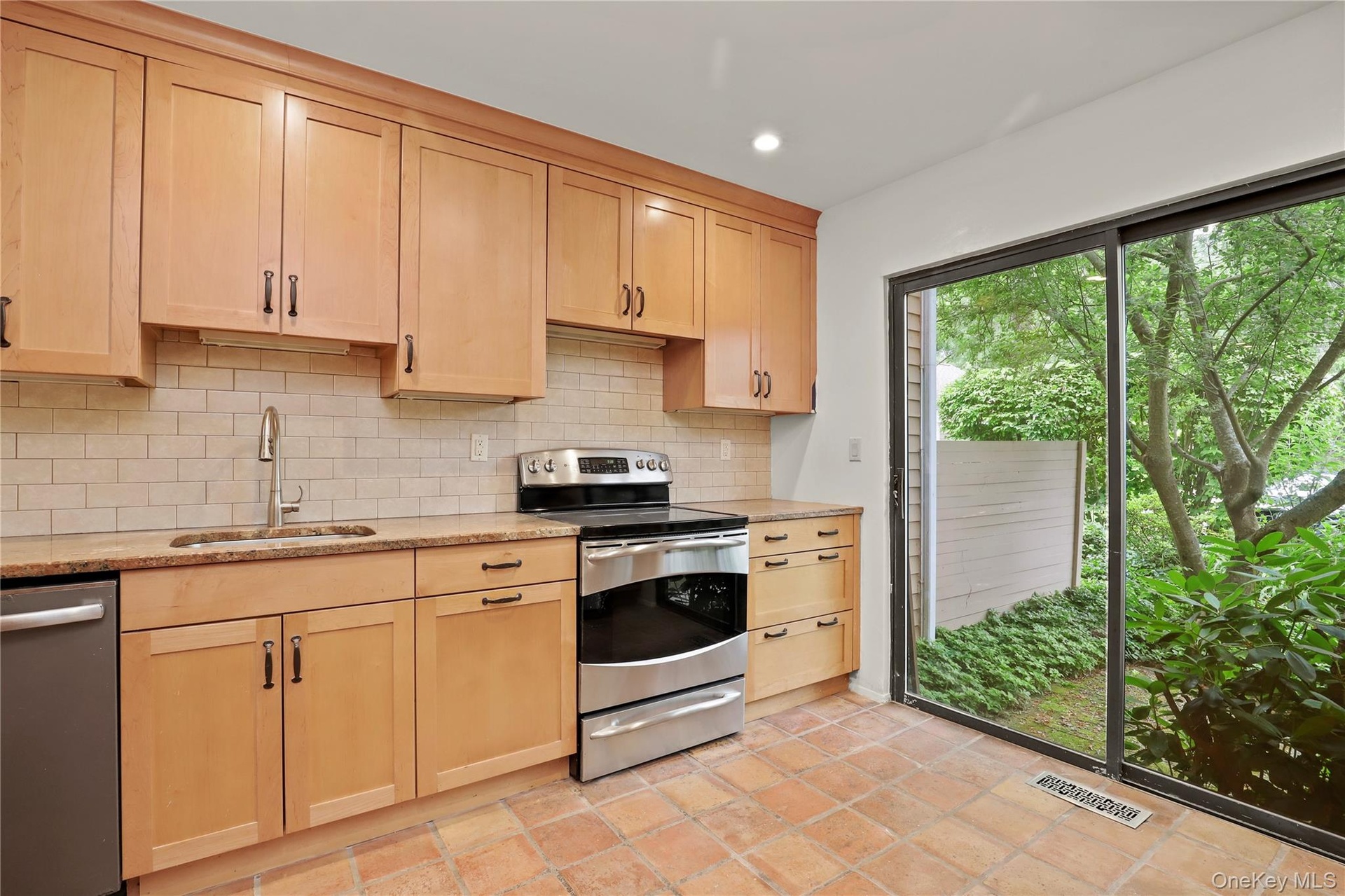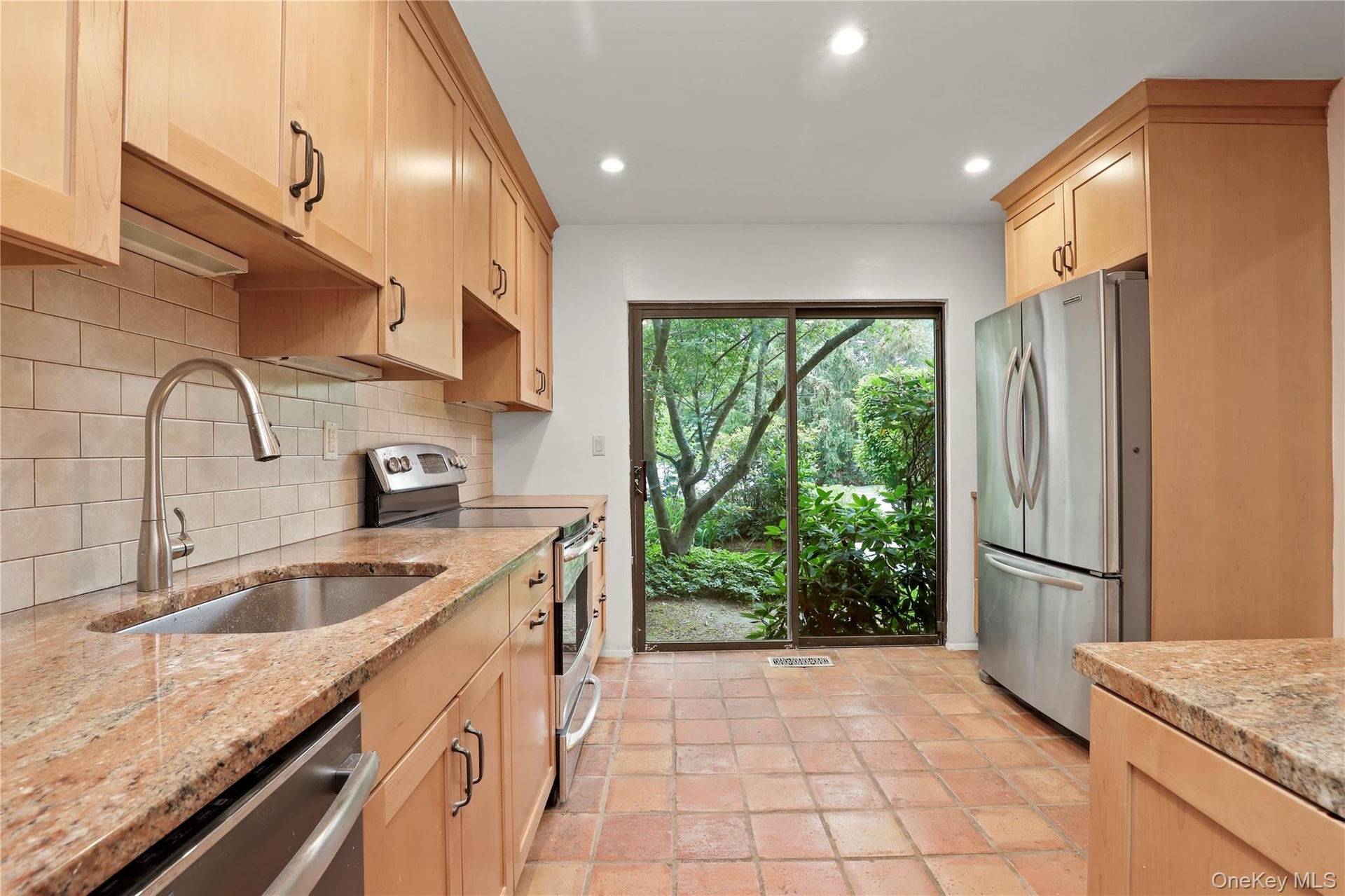 - Kitchen with light brown cabinets, appliances with stainless steel finishes, tasteful backsplash, light stone countertops, and recessed lighting