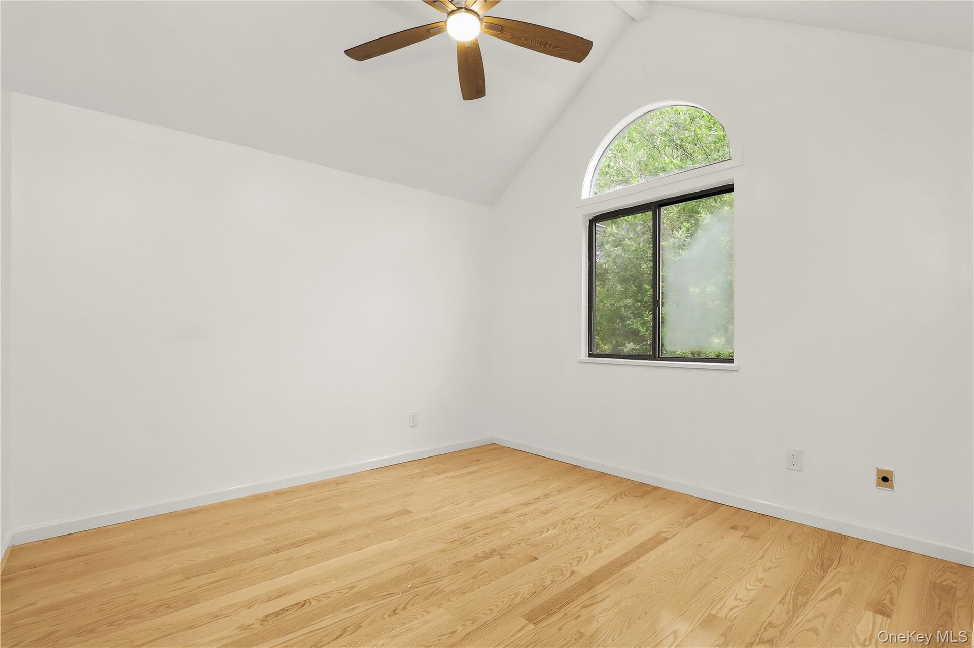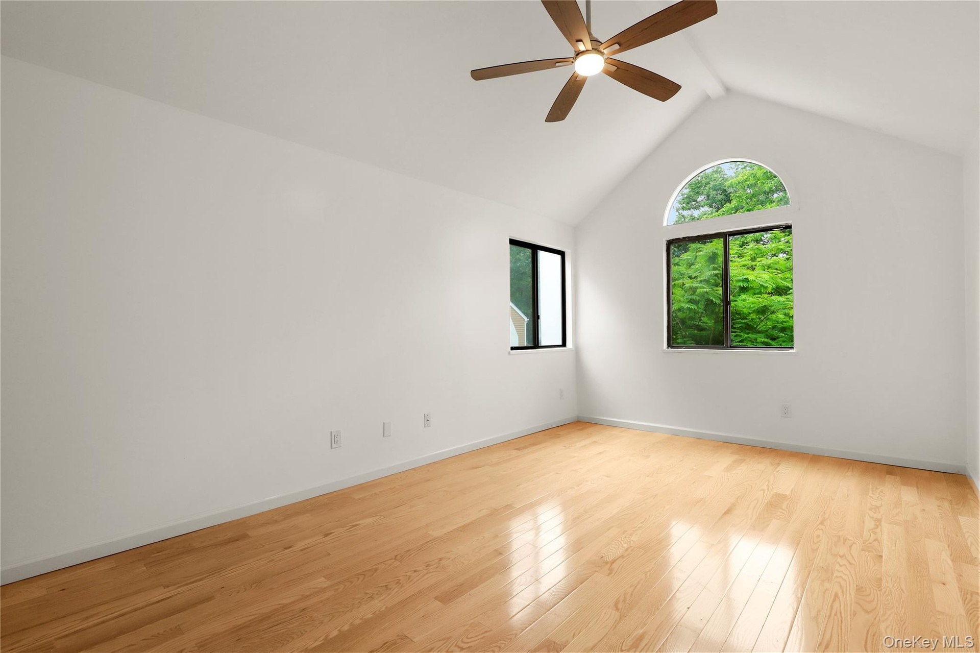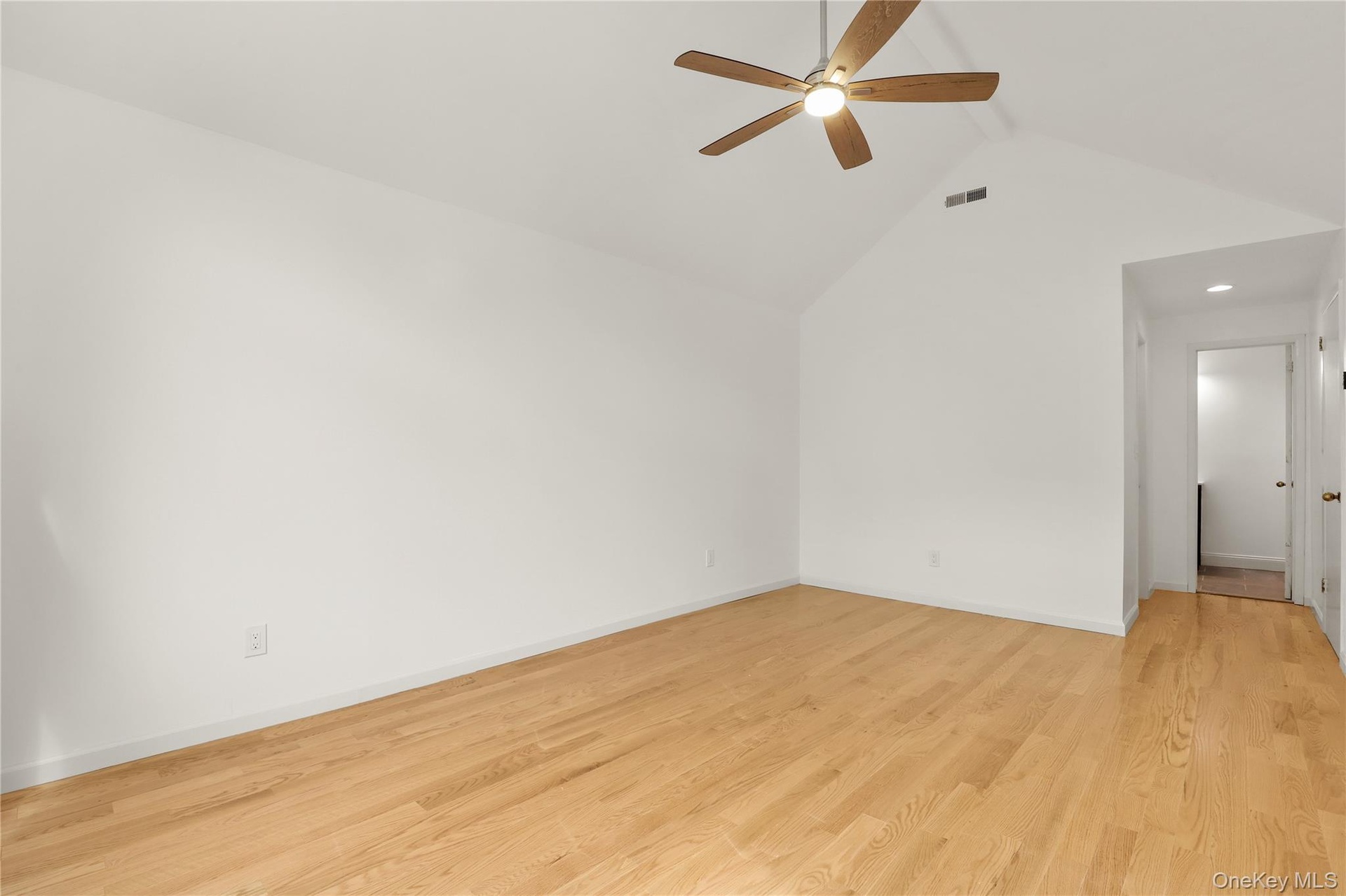 - Unfurnished room featuring light wood-style flooring, ceiling fan, and high vaulted ceiling