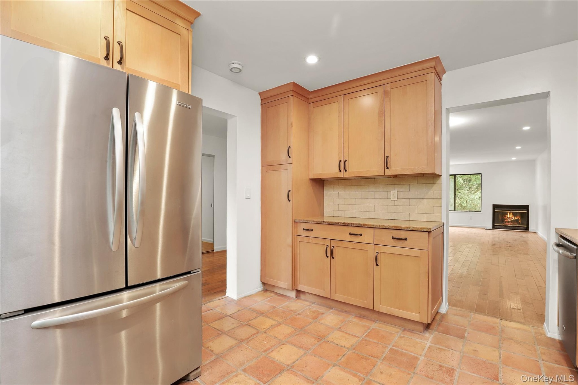 - Kitchen with stainless steel appliances, light brown cabinets, tasteful backsplash, recessed lighting, and a glass covered fireplace