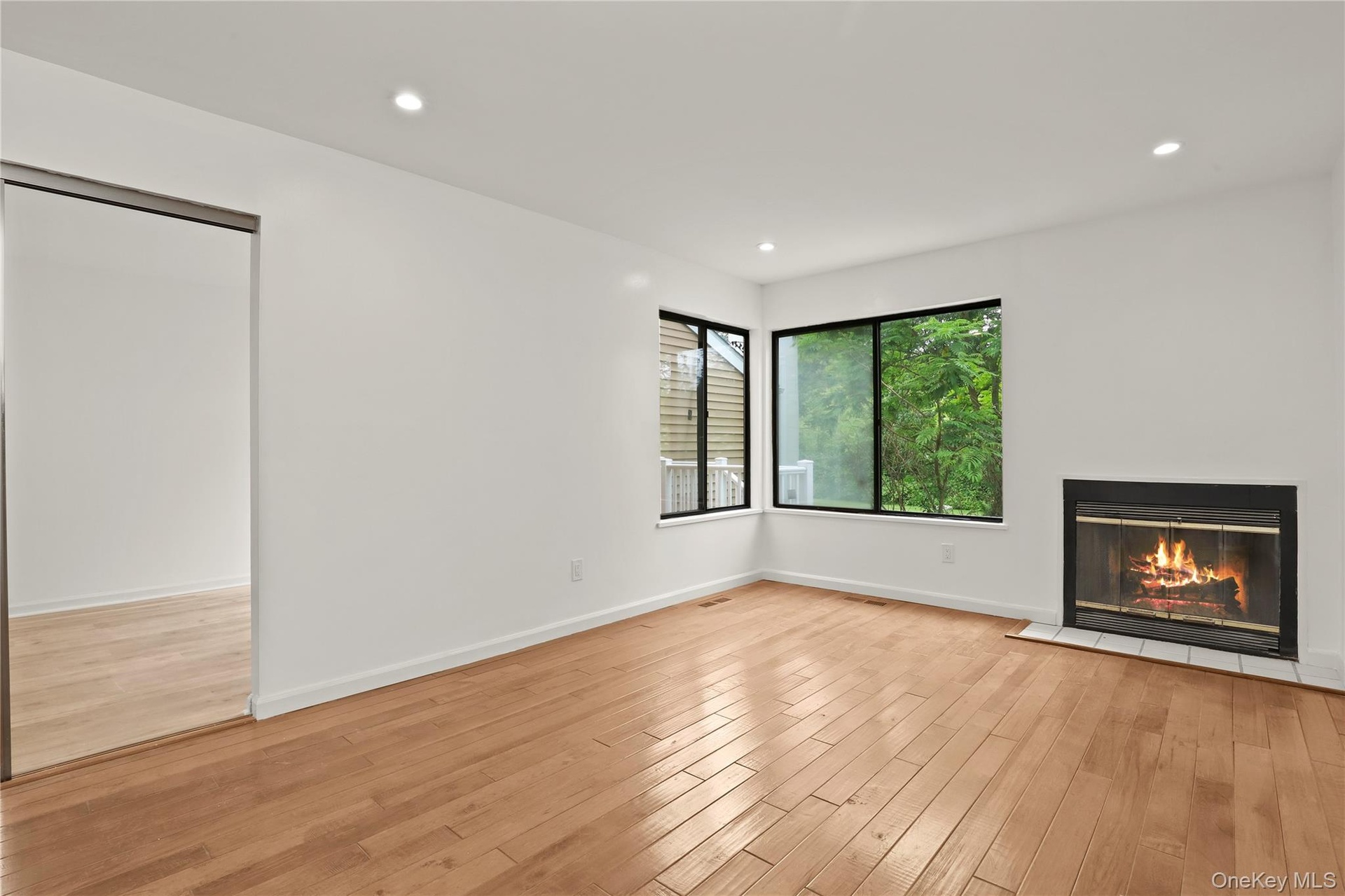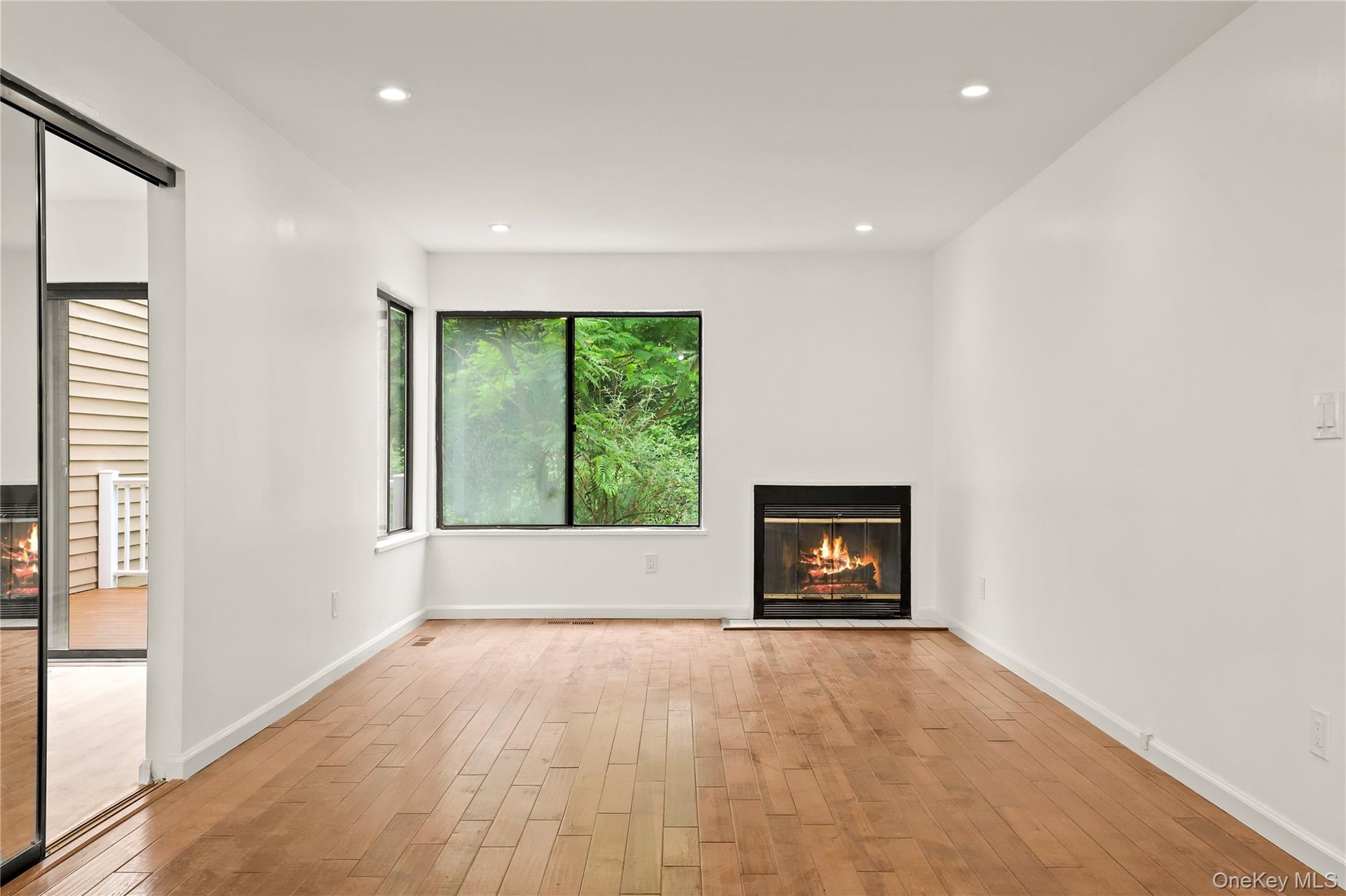 - Unfurnished living room with light wood-type flooring, recessed lighting, and a glass covered fireplace