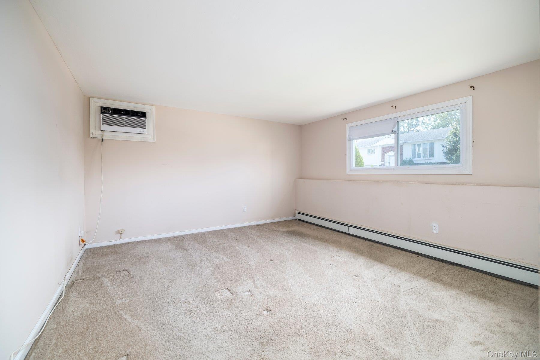 - Unfurnished room with baseboard heating, light colored carpet, and an AC wall unit