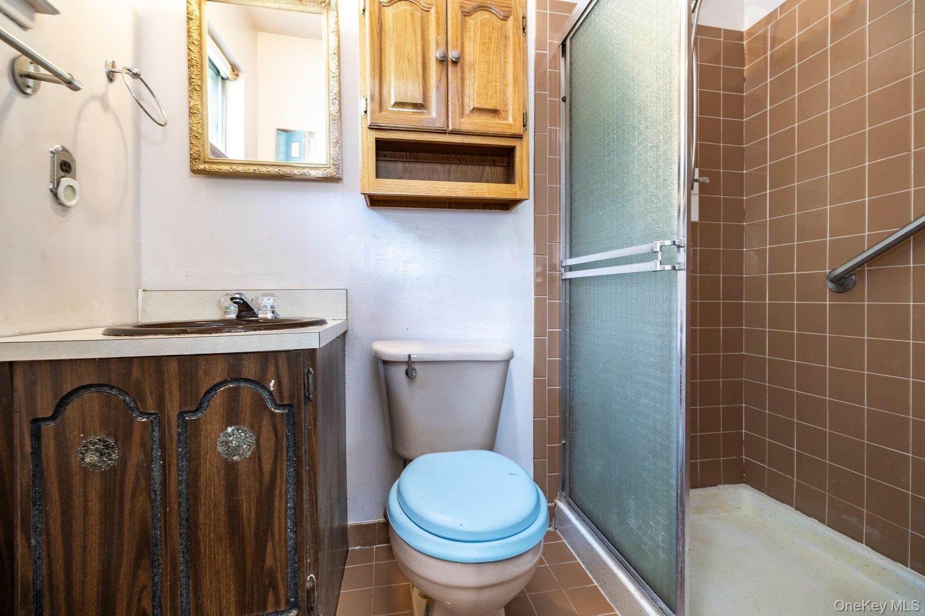 - Full bathroom with vanity, a stall shower, and tile patterned flooring