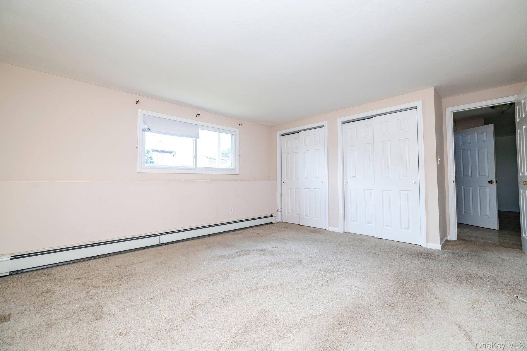 - Unfurnished bedroom featuring a baseboard radiator, light carpet, and multiple closets