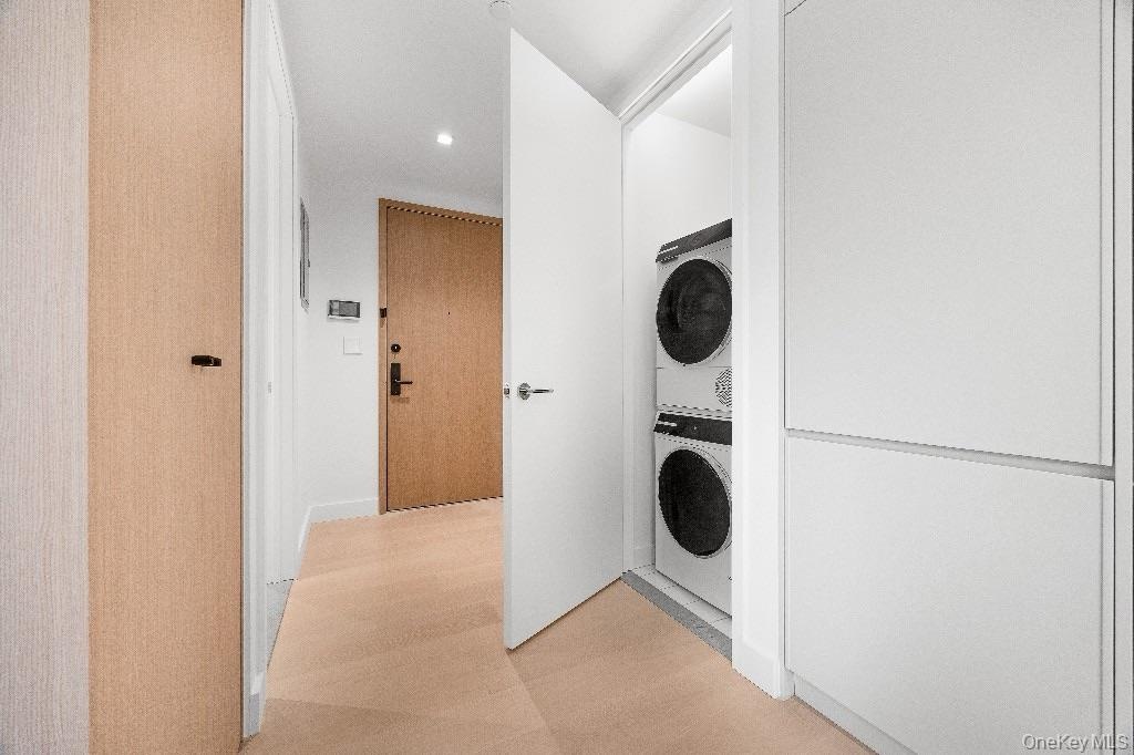 - Washroom featuring stacked washer / dryer and recessed lighting