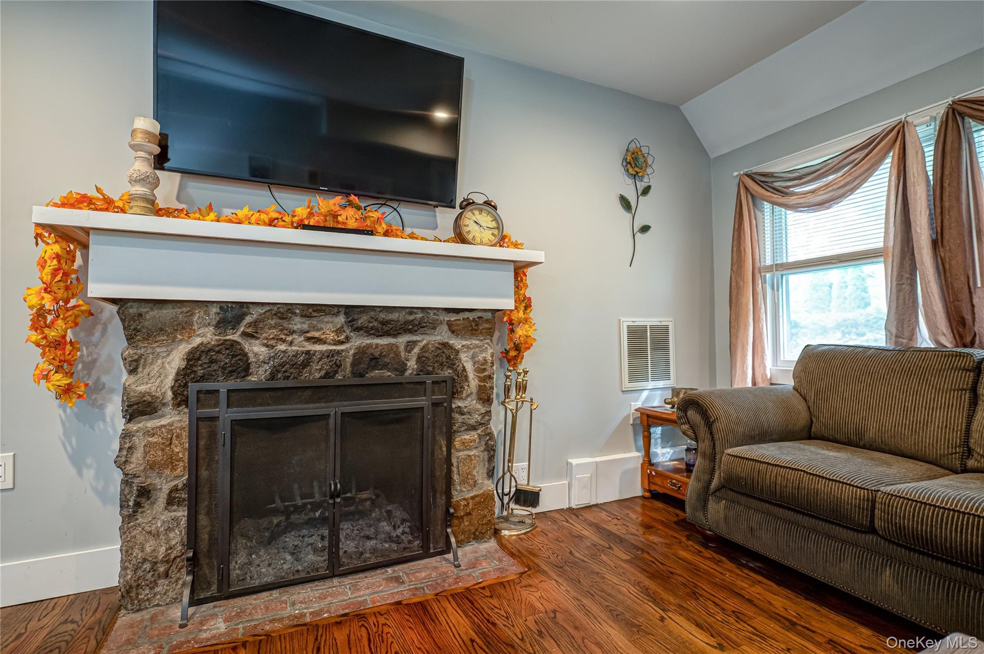 - Living Room, recessed lighting, wood burning fireplace, and vaulted ceiling.