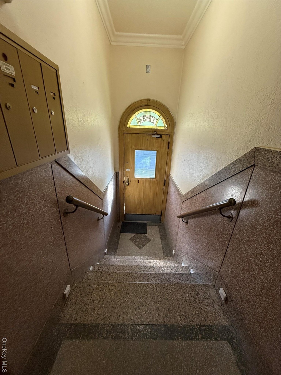 - Staircase with ornamental molding, a textured wall, wainscoting, and granite tiled floors