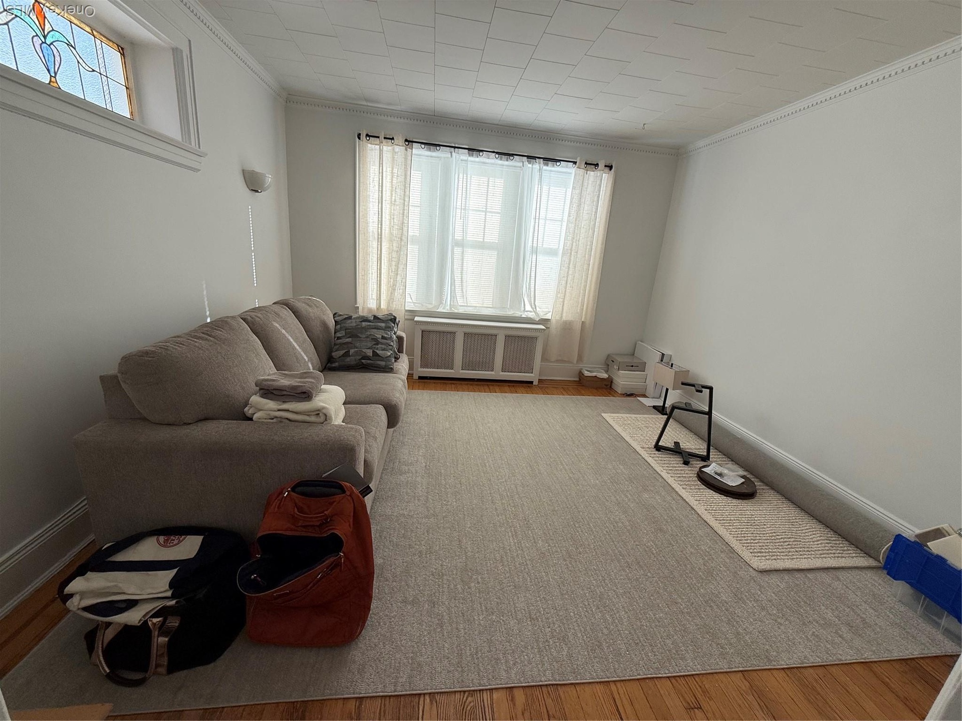 - Living room featuring ornamental molding, radiator heating unit, and light wood finished floors