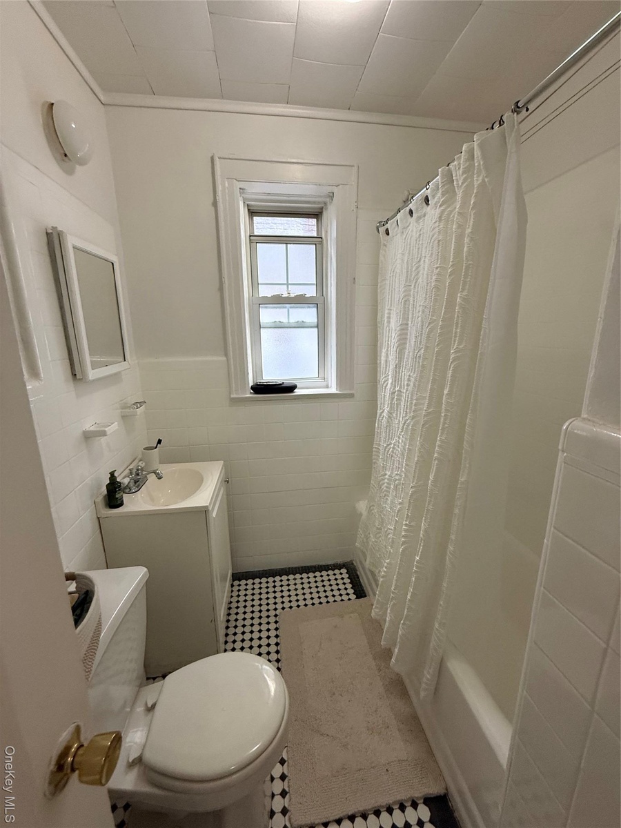 - Bathroom featuring vanity, shower / bath combination with curtain, tile walls, wainscoting, and tile patterned flooring