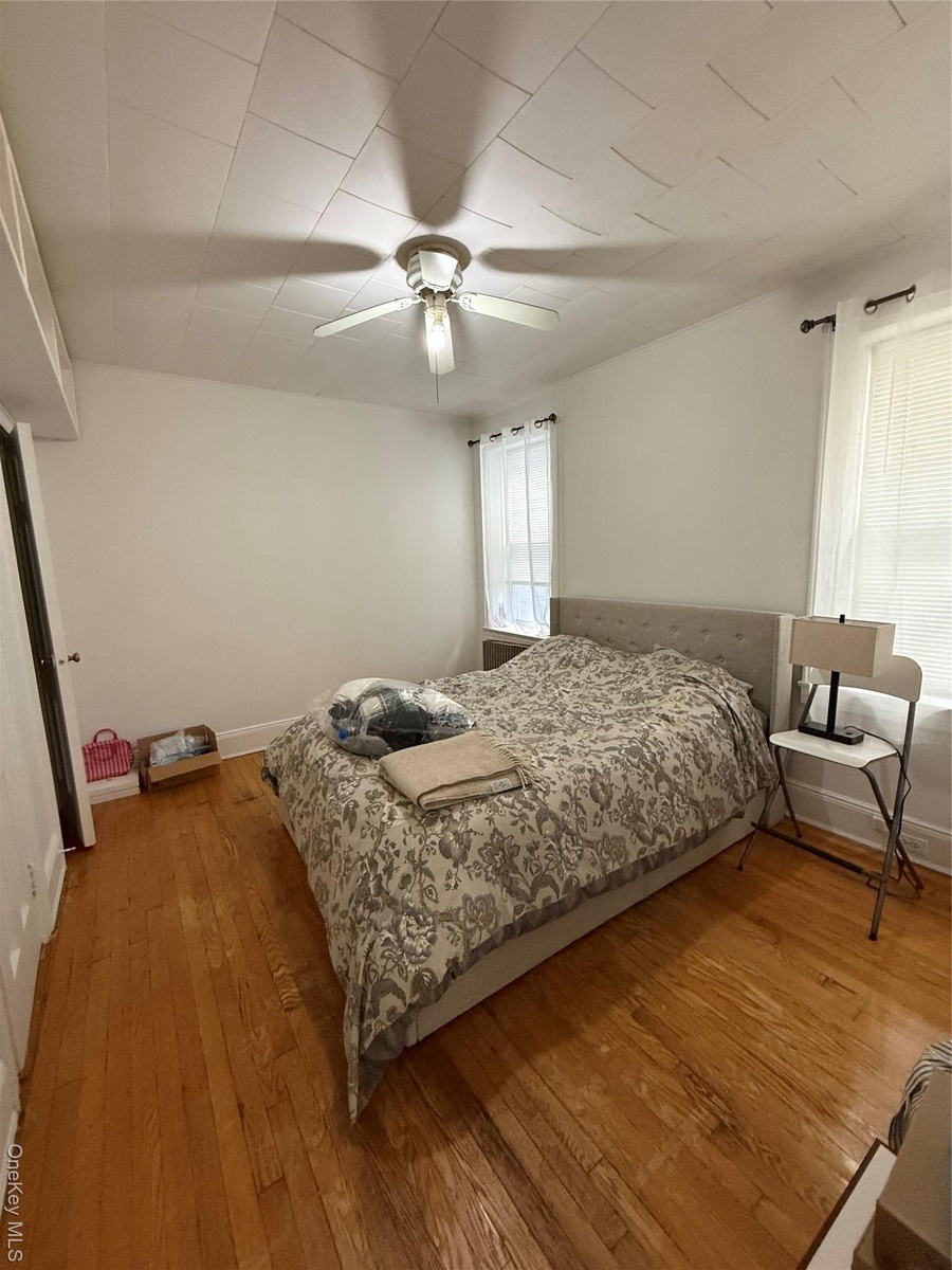 - Bedroom with hardwood / wood-style flooring and a ceiling fan