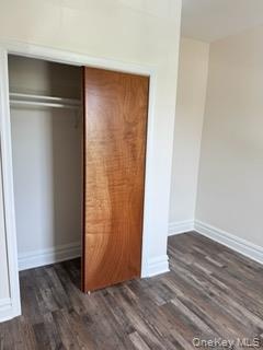 - Unfurnished room featuring dark wood-style flooring and radiator heating unit