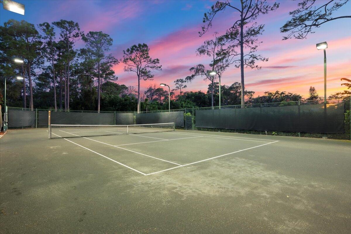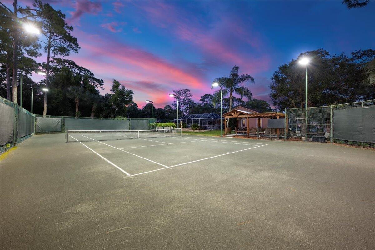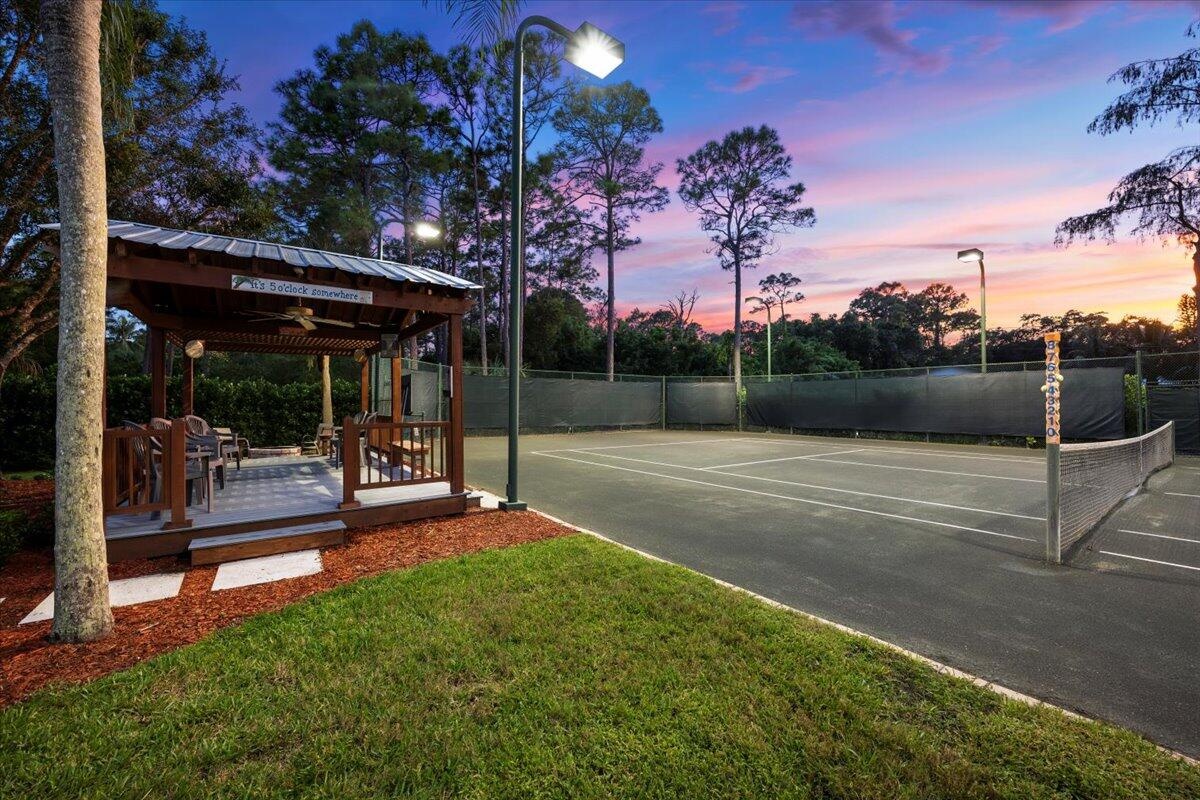 Is tennis your dream? Then this is your dream come true--the ball is in your court! Set at the end of a quiet, paved cul-de-sac is a beautifully landscaped 1.04 acre lot with landscape lighting and a cobblestone driveway. This distinctive 3-bedroom plus den, 3-bath residence is a private paradise for tennis lovers and outdoor enthusiasts. Play every day on your regulation-size Har-Tru (clay) tennis court with eight professional 1,000-watt metal-halide lights (newer ballasts and bulbs) for evening matches and a 10-foot fence on 3 sides for optimal play. An automatic above-ground sprinkler, fed by well water, keeps the court in peak condition. Between sets, relax in the stunning 10' x 20' cedar gazebo with Trex flooring, ceiling fan, electric lighting and fire pit! An entertainer's