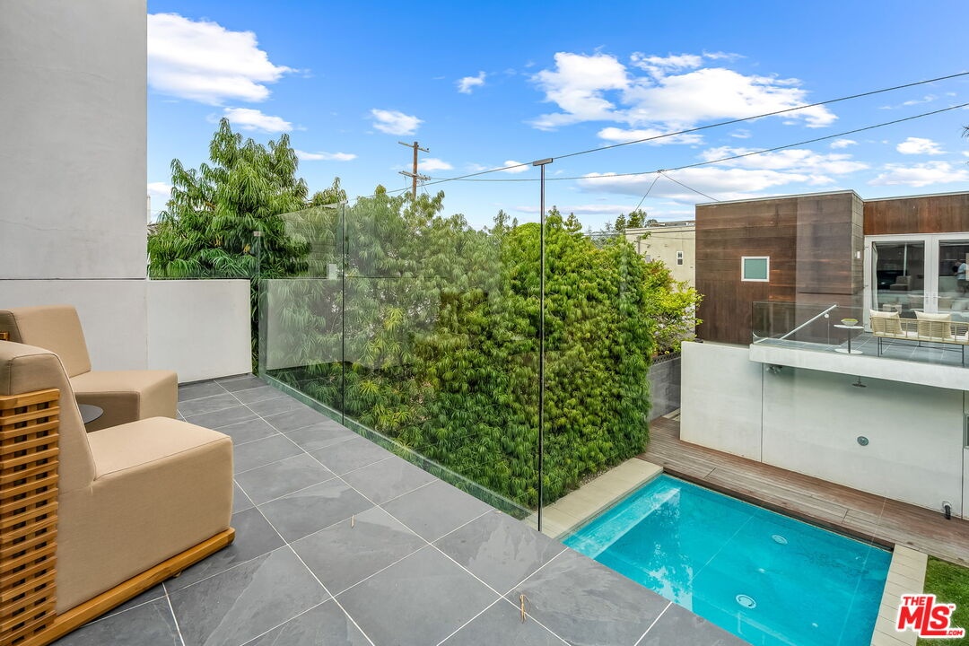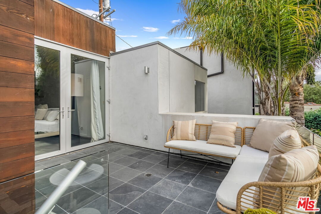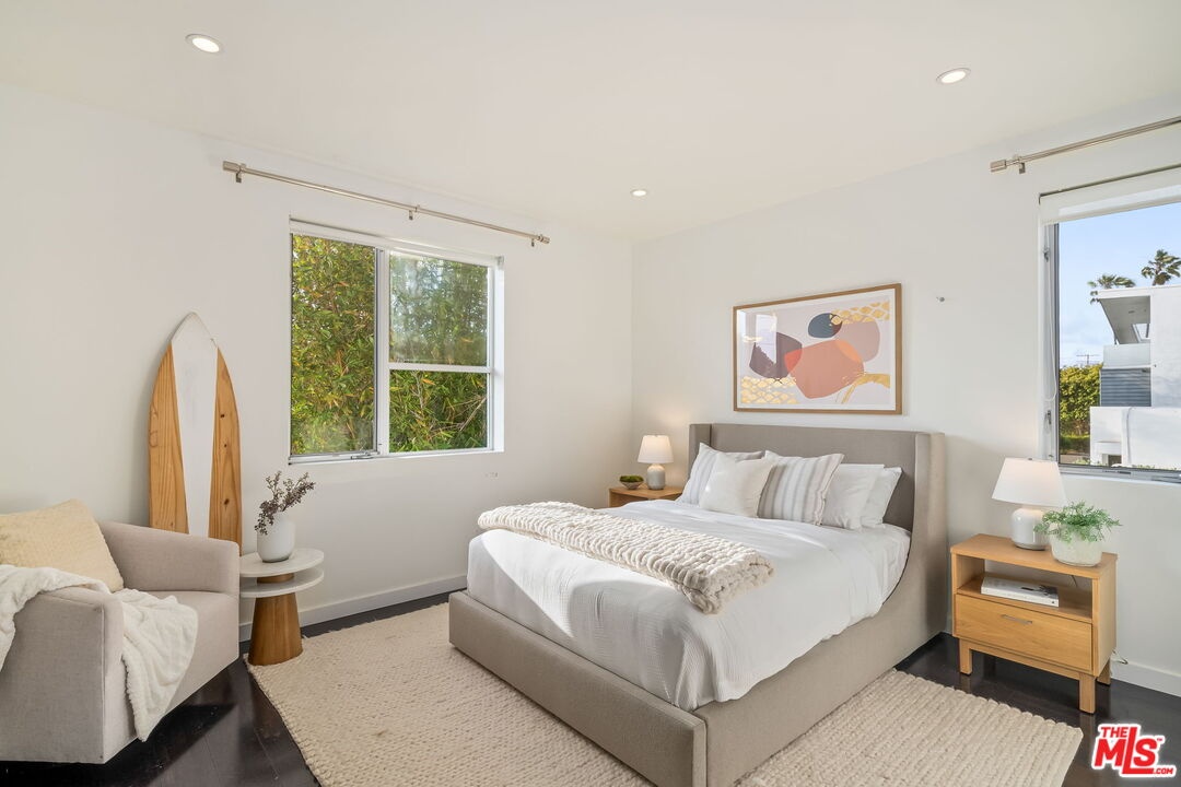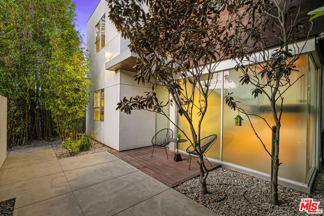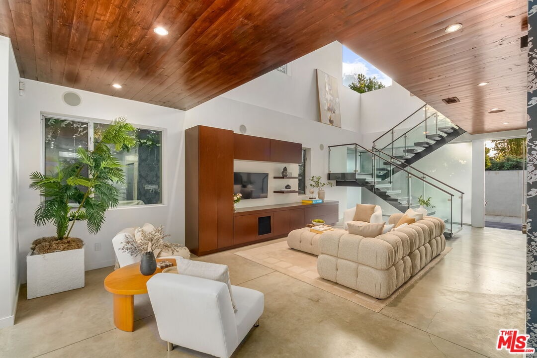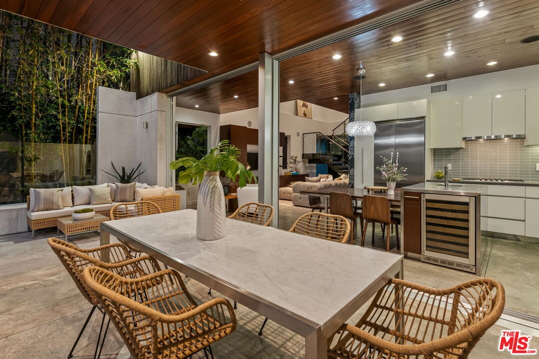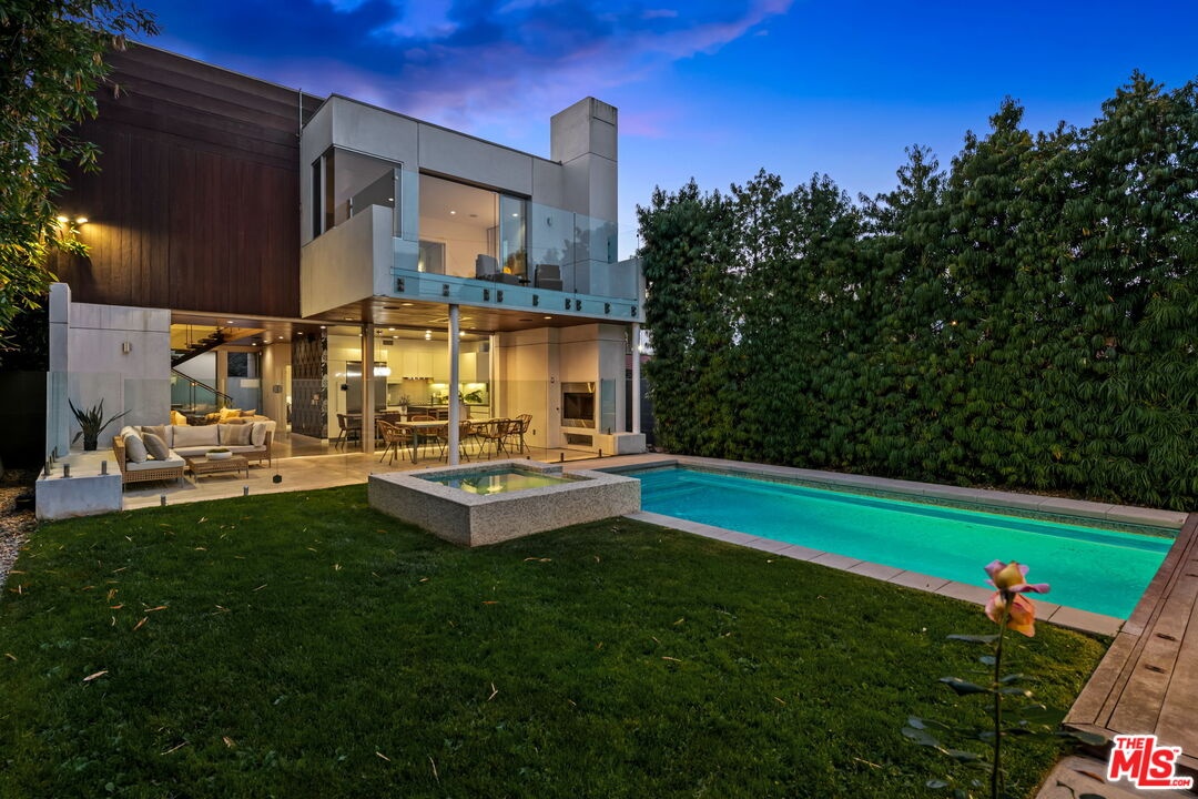 An inspiring creation by Bret Felix Theony, the same visionary architect behind Prince's iconic Paisley Park, this Venice sanctuary is two blocks above the vibrant Abbott Kinney with easy access to enticing eateries and shopping, the beach, bike path and more. The gated and private entry leads to walls of glass opening to the main living space with two story ceiling, concrete flooring complemented by warm wood detailing, and a floating staircase leading to the upper level. The chef's kitchen has stainless steel appliances and center island with breakfast bar and dining area. Designed to maximize a sense of indoor and outdoor living, the floor to ceiling pocket doors expand the voluminous interior space to its outdoor room: a covered dining area with heat lamps and fireplace, and a sitting area opening to the lushly landscaped and private yard with swimmer's pool and spa. The main house has one bedroom suite downstairs and two upstairs, with the primary suite opening to its balcony with a sitting area and serene outlook of the private compound. Above the three car garage is a separate guest suite with a versatile storage space and a separate entrance, ideal for extending family, guests or home office. Amenities include radiant heat in the baths, built in speakers throughout, retractable pool cover, central AC, built in outdoor heating, wine fridge and three car garage with sliding doors opening to the backyard and pool. Seize this opportunity to embrace California living at its finest in a prime Venice location.