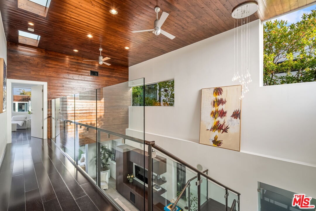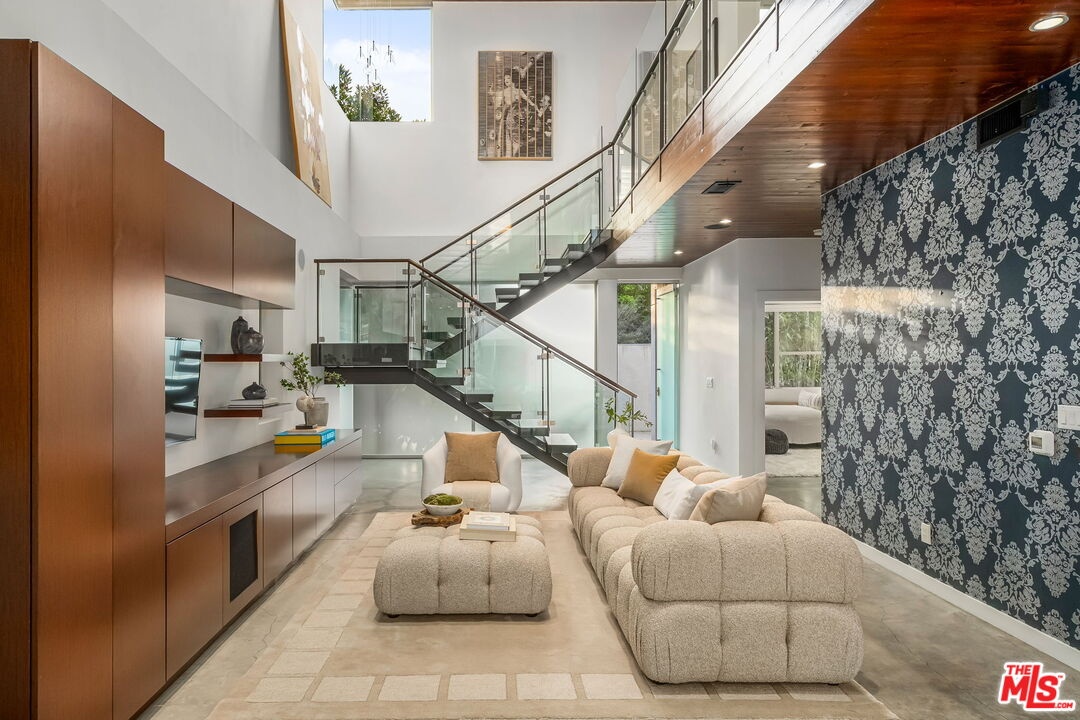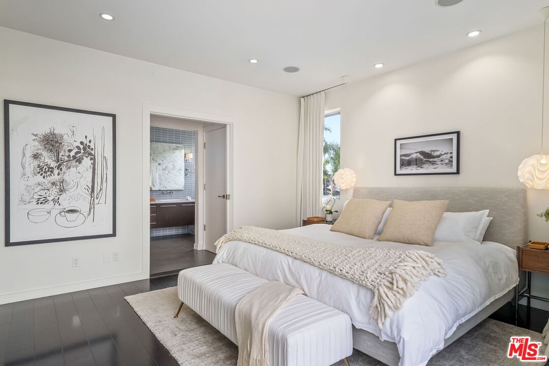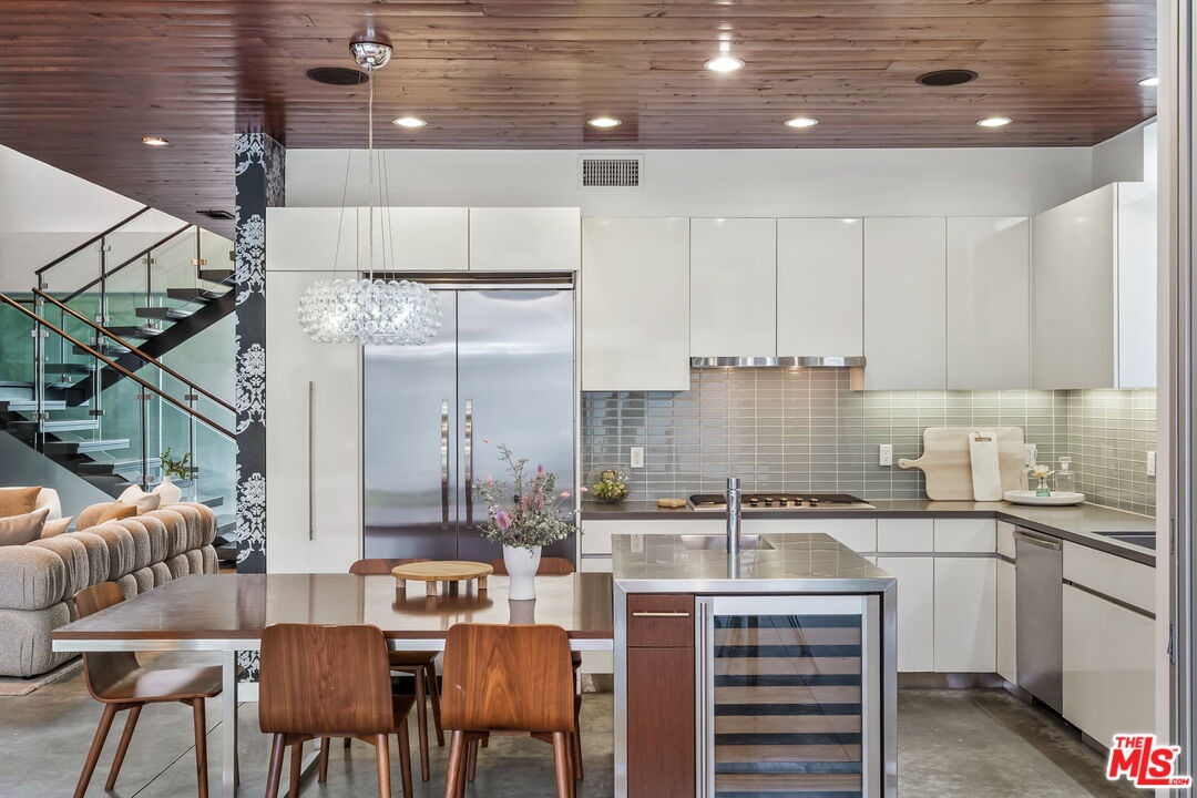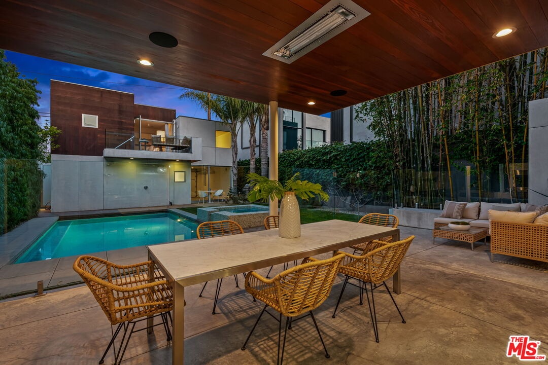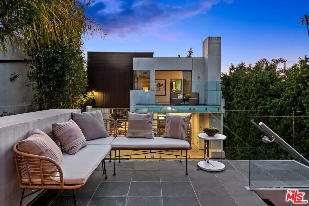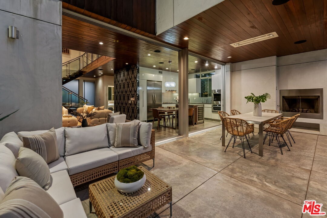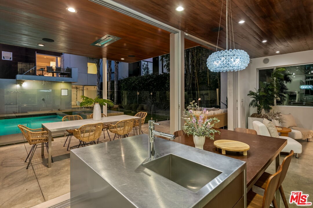 An inspiring creation by Bret Felix Theony, the same visionary architect behind Prince's iconic Paisley Park, this Venice sanctuary is two blocks above the vibrant Abbott Kinney with easy access to enticing eateries and shopping, the beach, bike path and more. The gated and private entry leads to walls of glass opening to the main living space with two story ceiling, concrete flooring complemented by warm wood detailing, and a floating staircase leading to the upper level. The chef's kitchen has stainless steel appliances and center island with breakfast bar and dining area. Designed to maximize a sense of indoor and outdoor living, the floor to ceiling pocket doors expand the voluminous interior space to its outdoor room: a covered dining area with heat lamps and fireplace, and a sitting area opening to the lushly landscaped and private yard with swimmer's pool and spa. The main house has one bedroom suite downstairs and two upstairs, with the primary suite opening to its balcony with a sitting area and serene outlook of the private compound. Above the three car garage is a separate guest suite with a versatile storage space and a separate entrance, ideal for extending family, guests or home office. Amenities include radiant heat in the baths, built in speakers throughout, retractable pool cover, central AC, built in outdoor heating, wine fridge and three car garage with sliding doors opening to the backyard and pool. Seize this opportunity to embrace California living at its finest in a prime Venice location.