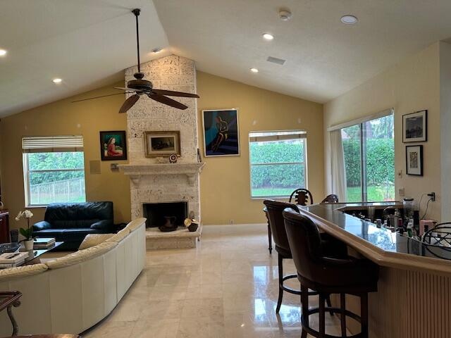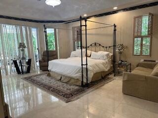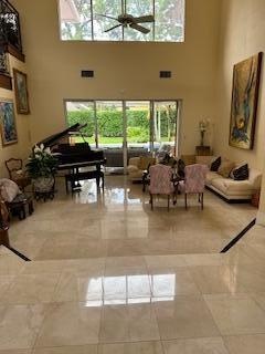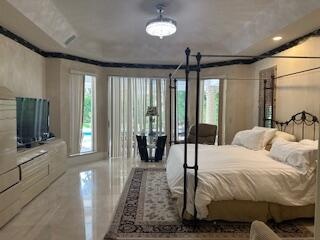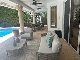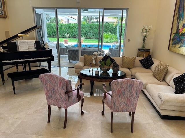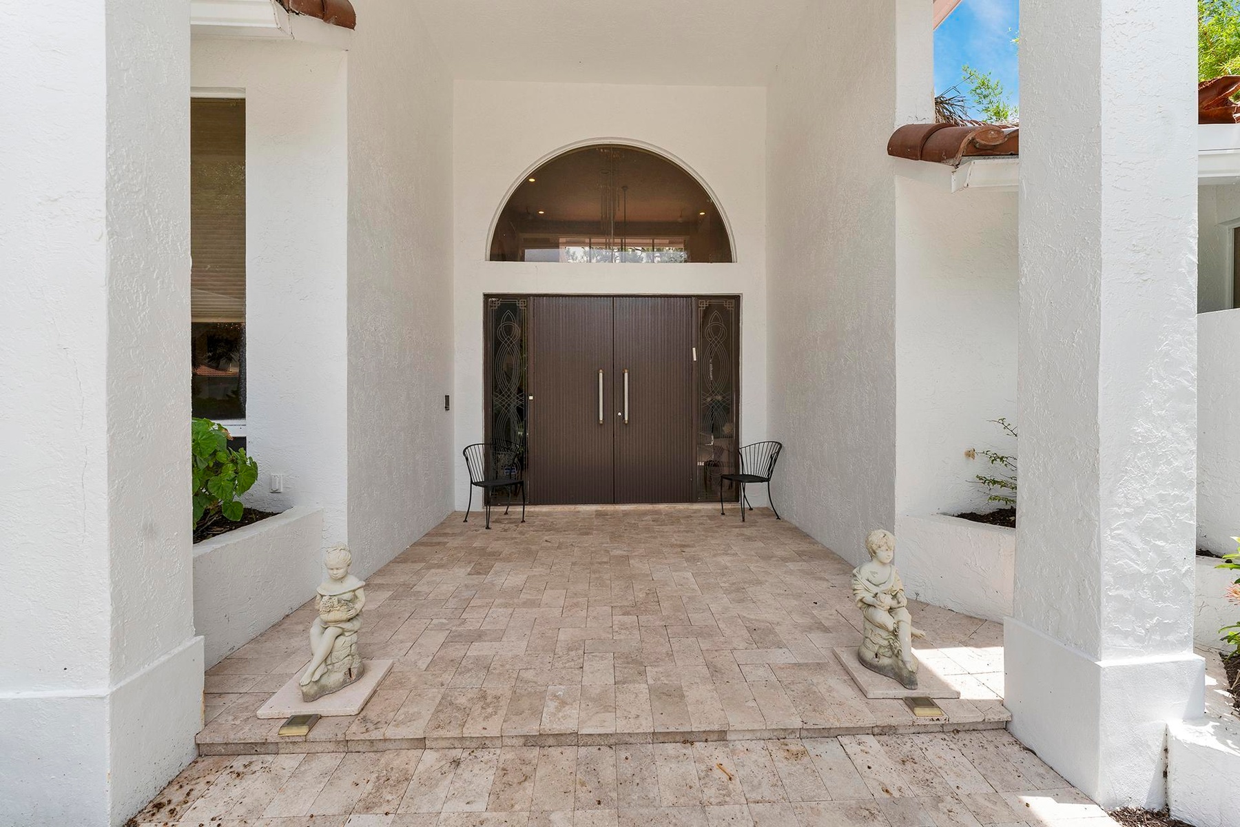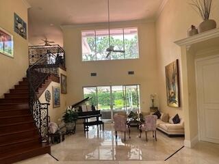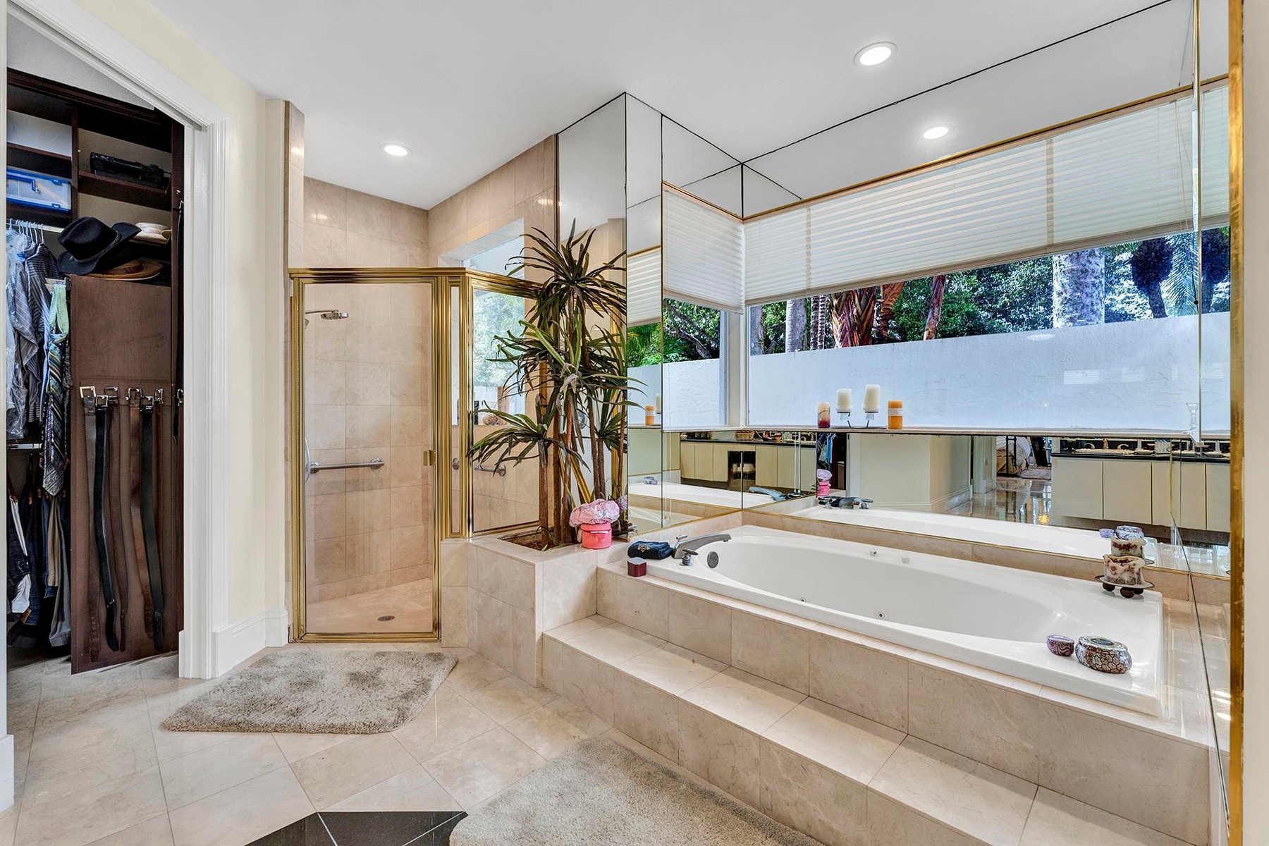 A marble driveway lined with palm trees leads you to the entrance. The door opens to a 22'' high livingroom flooding the home with light and air.The living room opens to a large marble covered patio overlooking the pool and fenced in Soccer sized grass yard. This elegant home is designed for sophicated and relaxed entertaining inside and out. A gourmet kitchen with high end appliances, island ,granite counters, overlooks a large familyroom, bar and fireplace.The first level primary suite with sitting area is a calm oasis . Two walk in closets and a hanging closet lead to the primary bath with dual sinks, vanity, separate shower and whirlpool tub. The primary level has a second bedroom, office and dinningroom. The stairs lead you to a second level with 3 bedrooms, 2 baths, loft and deck