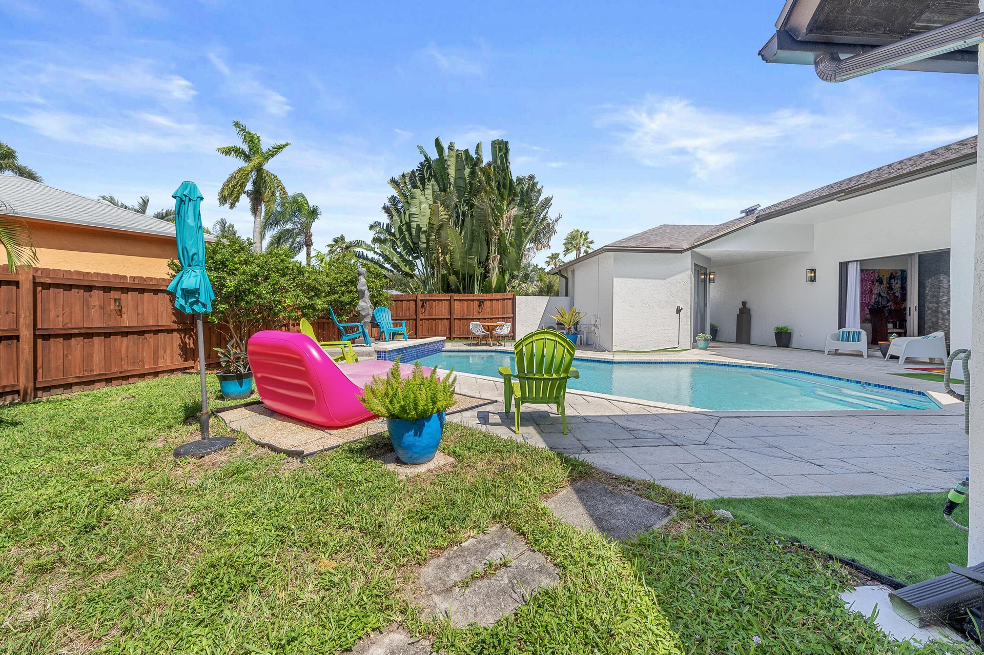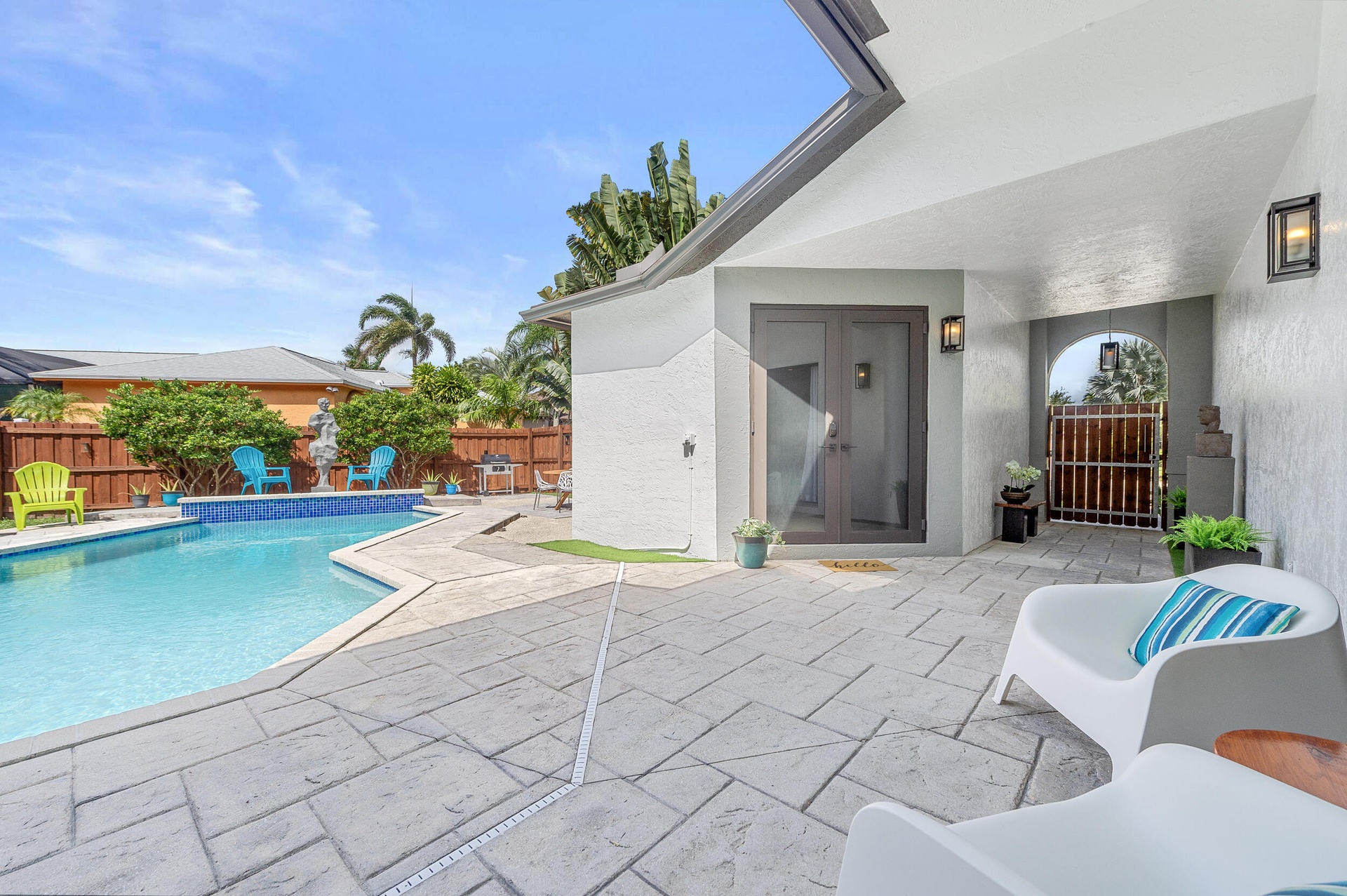 Beautifully updated, move-in ready home offering modern upgrades and comfort in a prime location--just 5 minutes to the marina and under 8 minutes to Ocean Ridge beach. Located on a quiet cul-de-sac on a lot just over a quarter acre, the home features new silver travertine porcelain flooring, impact windows and doors, a new roof, updated lighting, and a new AC. Skylights and a solar attic fan improve energy efficiency. The resurfaced saltwater pool and covered lanai separate the main home from a detached guest suite--perfect for visitors or rental income. A new fence and fresh interior/exterior paint complete this exceptional property.
