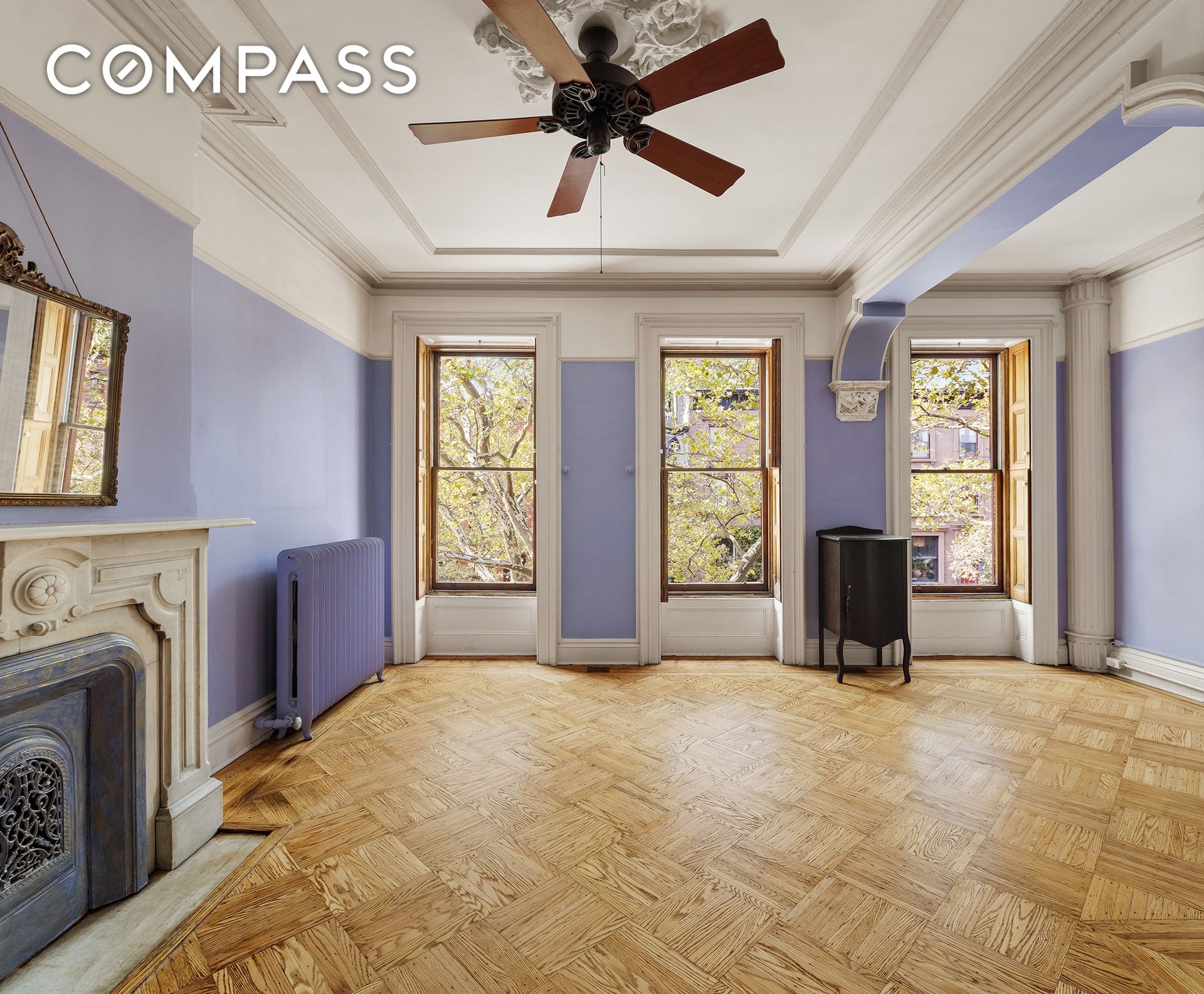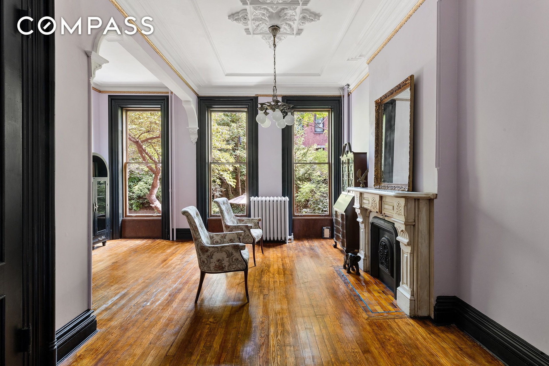 Description309 Vanderbilt Avenue is a classic & historic four story Neo-Grec style brownstone located in Prime Clinton Hill/Fort Greene. From the street it looks like a three story but the top floor is set back so it cannot be seen from the street. Built in the 1877 by the developer Benjamin Linikin, it has the classic exterior details such as a high stoop, enormous double doors, round-arched reveals, and pediments on incised brackets. Owned by this family for over 50 years, everything is in good working order and has been well maintained. There are tons of original architectural details in the interior, Many of the rooms have marble mantles & fireplaces ( nonworking).The interior reads as it was in 1877, all the details remain: parlor pocket doors, wedding cake plaster ceiling detail, all the original entry way doors and interior doors, and stairway bannisters to name a few. Some of the original light fixtures date back to before electricity and were gas. 309 has been used as a single family although it is a two family legally. It would be easy to use as a two family and create a first floor rental. The building measures 18.7x45 feet and the lot is 85 feet. Size wise it is about 3200 interior square feet with 4 bedrooms and a potential 5th bedroom, 3 baths and a large rear yard.The first floor is the garden level and has a formal dining room and large eat in kitchen with a door to the garden. The kitchen has an enormous island and plenty of room for a large sized table too and also worthy of note, a huge walk in pantry. The dining room is in the front looking out to Vanderbilt Avenue and has a marble mantel fireplace. There is a small but full bath off the kitchen with a shower. The second floor is the parlor floor which has a front and rear parlor. Both have lots of period details with lavish plaster ceiling detail, huge pocket doors and fretting, two marble mantel fireplaces (not working) and face east and west. The third floor has three bedrooms and a hallway bathroom with a classic Waterworks-esque clawfoot bath tub with a chrome exposed shower and rainhead. In true Victorian fashion, the marble topped vanities and sinks are separate from the hallway bath and are in their original location, the hallway behind the bath. If one wanted to redo the bath and enlarge,/reorganize it, there are several closets that back onto the bath, making a redesign pretty accessible. The fourth floor has a large tiled and windowed bath with a shower stall and an east facing bedroom. There is the potential for the 5th bedroom/playroom/office in the sloped ceilinged front room used as an attic. While it has a peaked ceiling as a result of the aforementioned set back, It has a skylight and could easily converted into a bedroom, office or playroom. 309 is located on one of the most ideal blocks, midway between Dekalb Ave and Lafayette. It is close to everything including, shopping, stores, and the areas reknown restaurants. It is also very close to the historic Fort Greene Park and all the weekend activities like the Farmers Market.