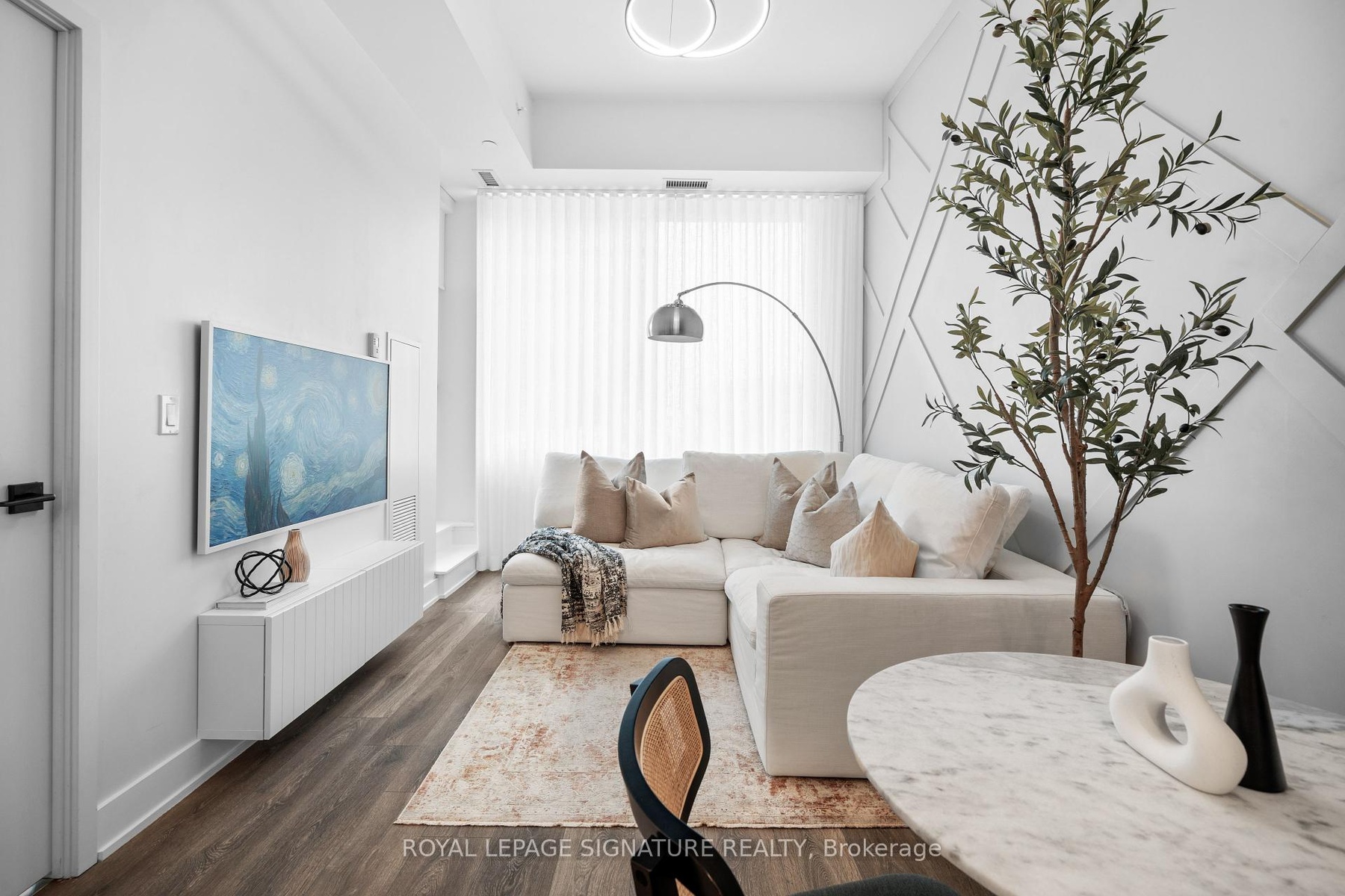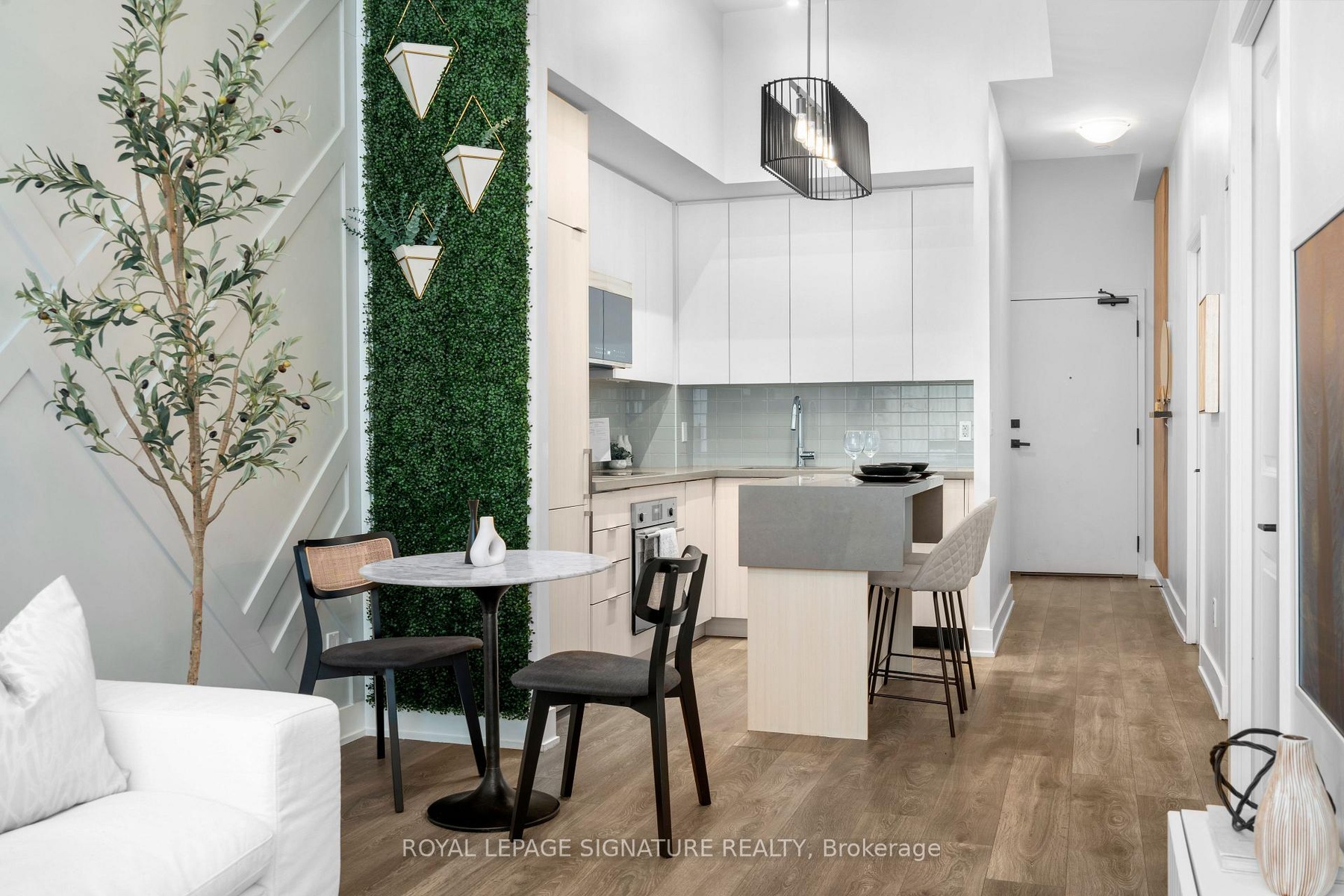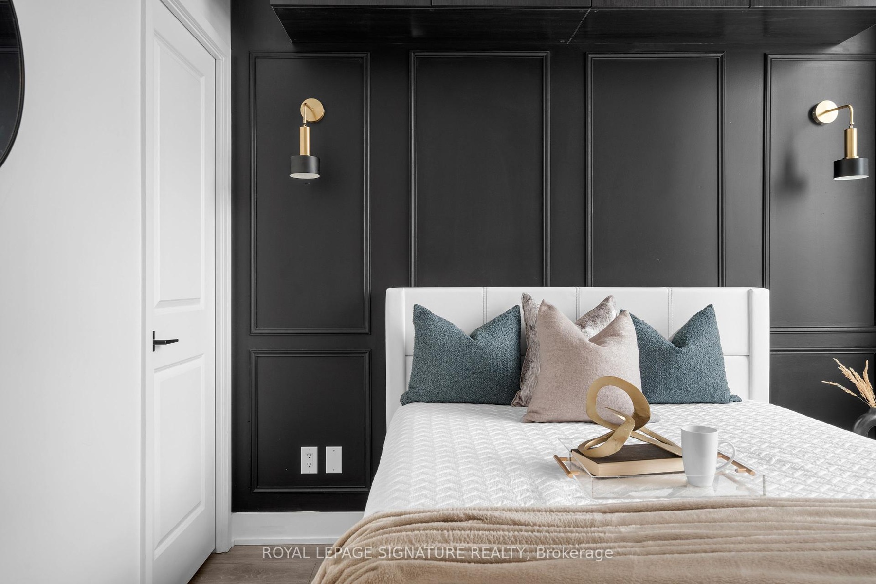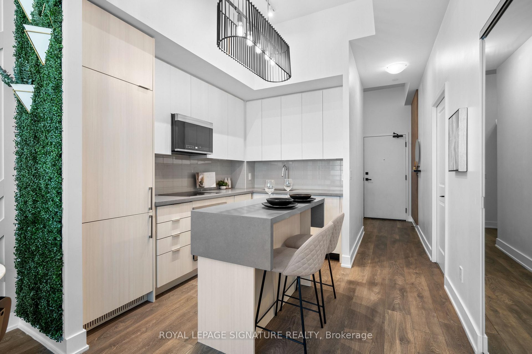 Welcome home! This stunning and spacious 1 BR + Den condo offers 675 sq. ft. of beautifully upgraded interior space, plus an additional 30 sq. ft. balcony overlooking the lush rooftop gardens a perfect place to unwind. Step inside to soaring 11-ft ceilings and custom renovations such as the feature walls in both the living and bedrooms & incredible light fixtures that elevate this suite to a new level of sophistication. The contemporary kitchen boasts quartz countertops, upgraded paneled stainless steel appliances, and a sleek, thicker 2 countertop ideal for cooking and entertaining. Recent upgrades include frameless mirror bypass doors, modern roll blinds with blackout in the bedroom, upgraded interior doors, and a front-loading washer/dryer. The unit also offers a generous Den space that fits a single bed and was used as a bedroom. Freshly painted and move-in ready, this suite also includes a locker and underground parking space. Beyond your front door, indulge in resort-style amenities, including a seasonal outdoor pool, state-of-the-art gym, yoga studio, sauna, pet wash station, party/meeting rooms, a theatre, wine-tasting room, ping pong room, kids playroom, and more! Located in an unbeatable location, you're steps from Walmart, Superstore, LCBO, restaurants, shops, and public transit right at your doorstep. Don't miss this opportunity