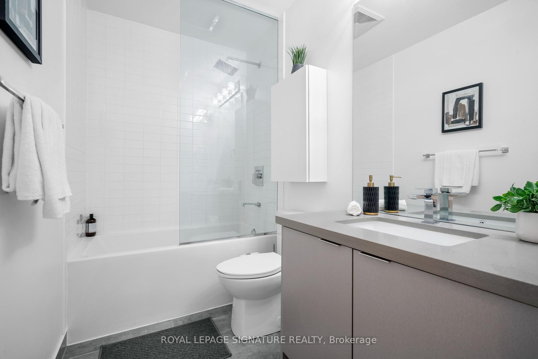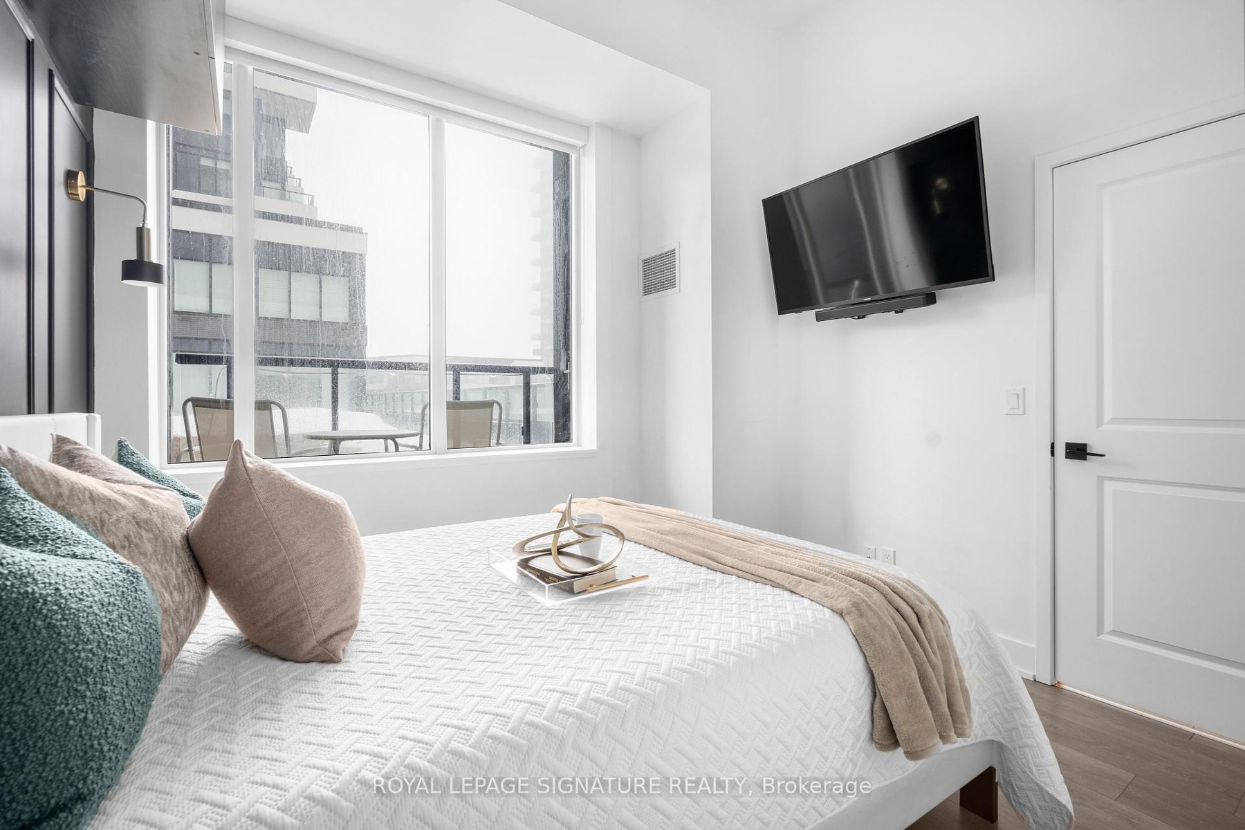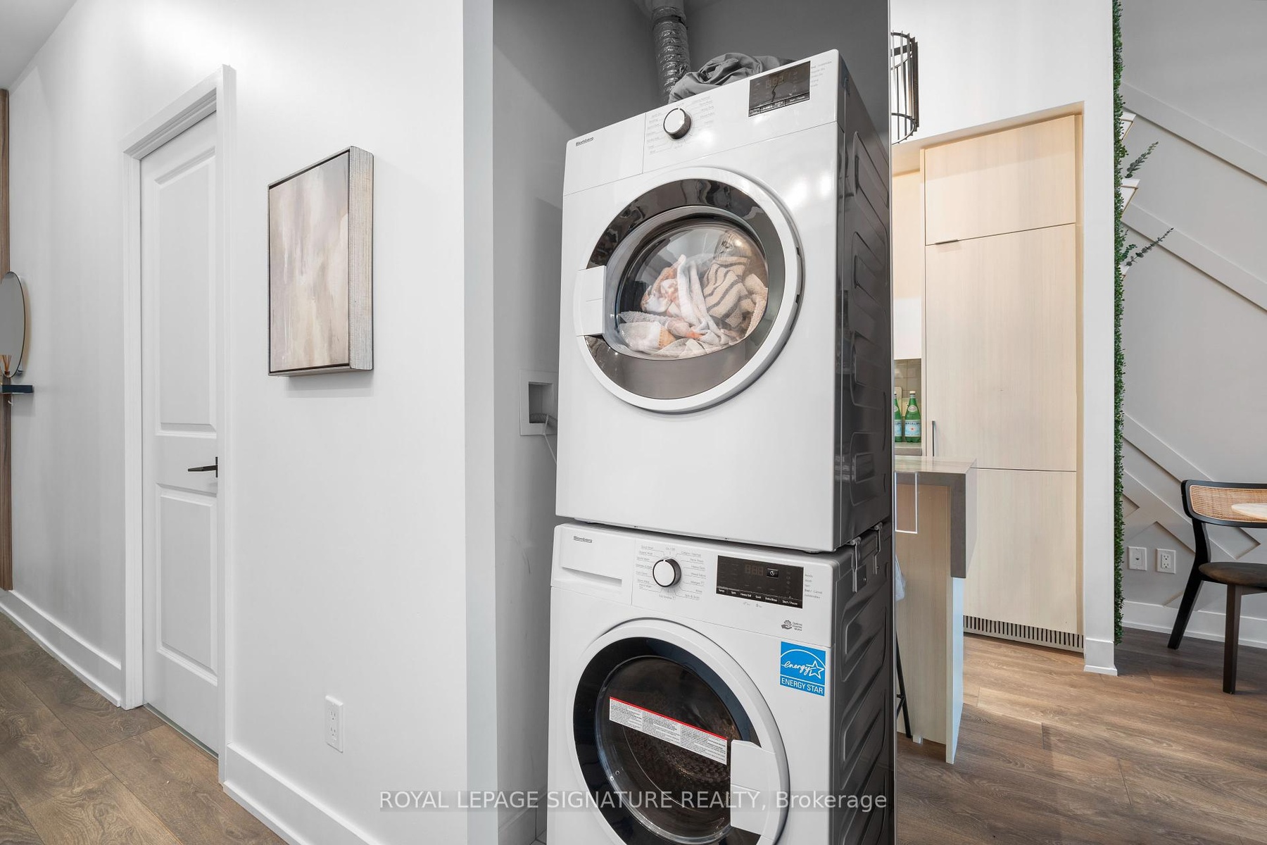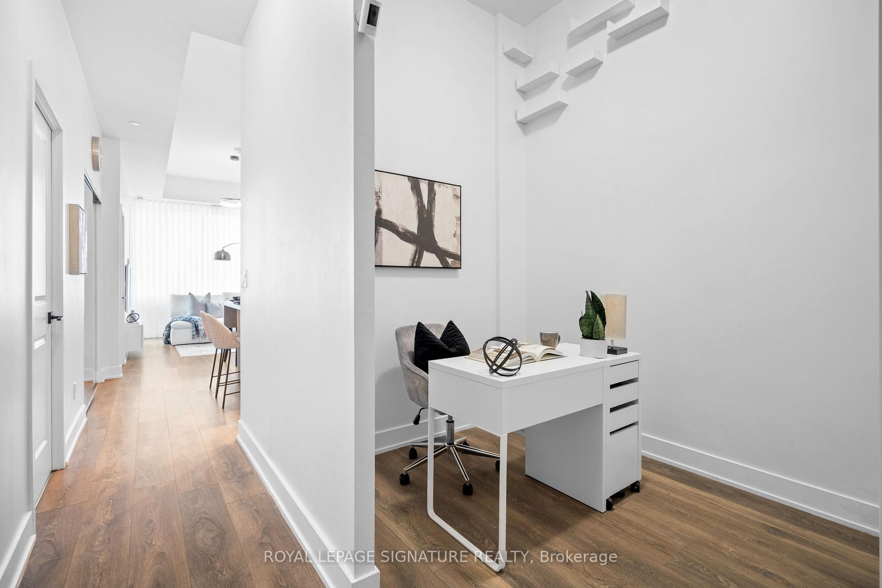 Welcome home! This stunning and spacious 1 BR + Den condo offers 675 sq. ft. of beautifully upgraded interior space, plus an additional 30 sq. ft. balcony overlooking the lush rooftop gardens a perfect place to unwind. Step inside to soaring 11-ft ceilings and custom renovations such as the feature walls in both the living and bedrooms & incredible light fixtures that elevate this suite to a new level of sophistication. The contemporary kitchen boasts quartz countertops, upgraded paneled stainless steel appliances, and a sleek, thicker 2 countertop ideal for cooking and entertaining. Recent upgrades include frameless mirror bypass doors, modern roll blinds with blackout in the bedroom, upgraded interior doors, and a front-loading washer/dryer. The unit also offers a generous Den space that fits a single bed and was used as a bedroom. Freshly painted and move-in ready, this suite also includes a locker and underground parking space. Beyond your front door, indulge in resort-style amenities, including a seasonal outdoor pool, state-of-the-art gym, yoga studio, sauna, pet wash station, party/meeting rooms, a theatre, wine-tasting room, ping pong room, kids playroom, and more! Located in an unbeatable location, you're steps from Walmart, Superstore, LCBO, restaurants, shops, and public transit right at your doorstep. Don't miss this opportunity