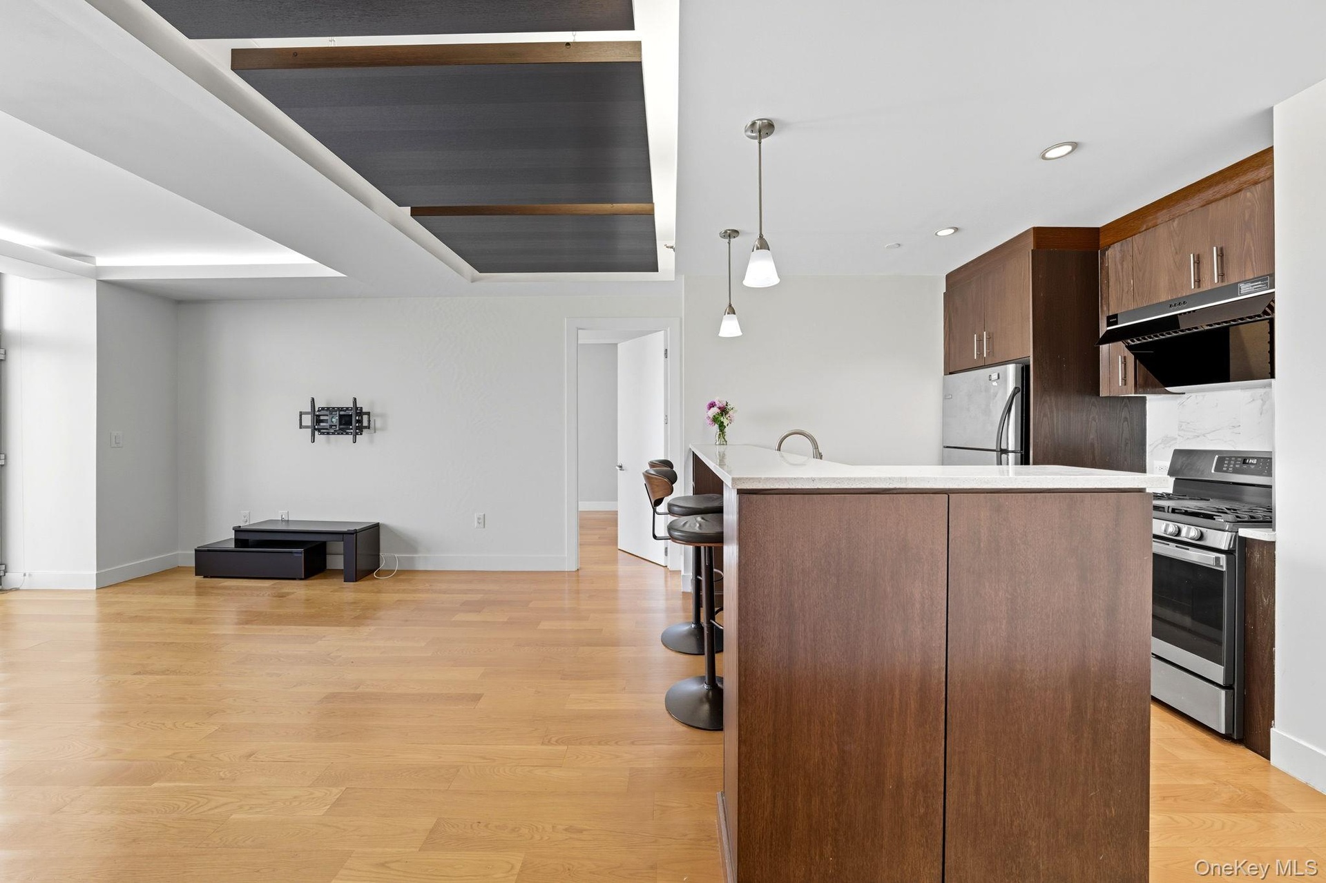 - Eat in kitchen with stainless steel appliances, under cabinet range hood, pendant lighting, light wood-style floors, and a kitchen breakfast bar