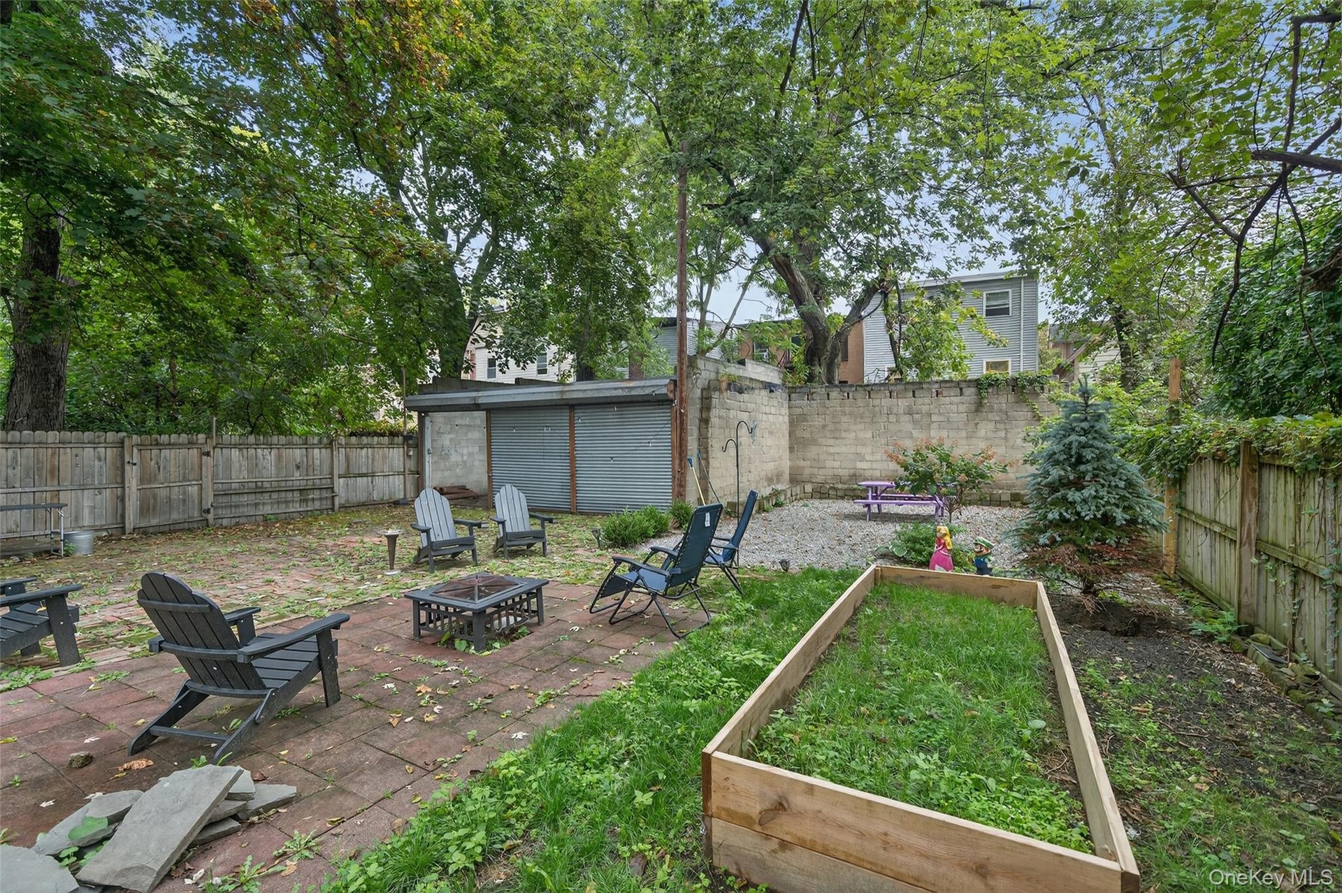 - Fenced backyard featuring a patio, a fire pit, and a shed