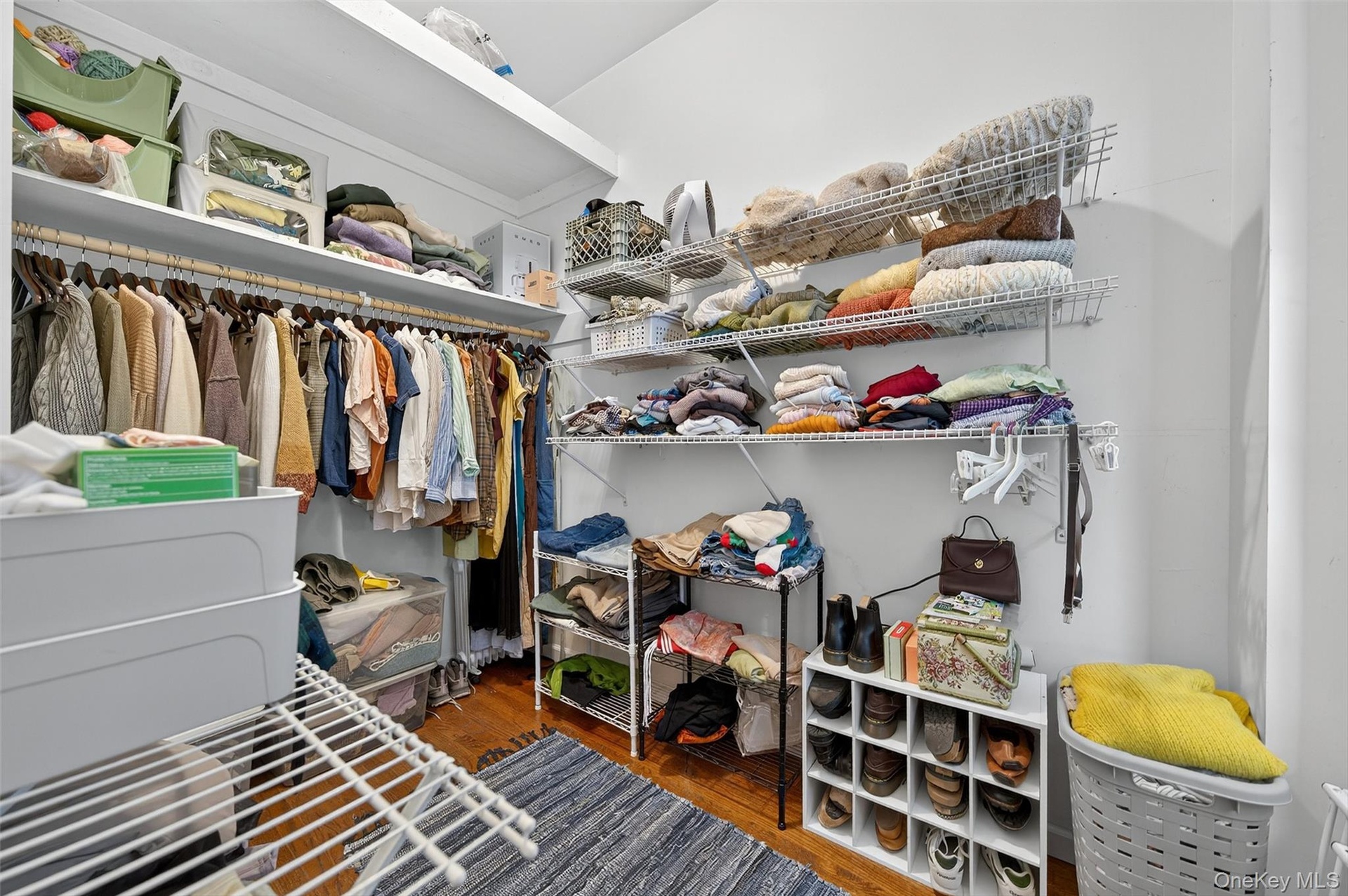 - Bedroom featuring wood finished floors, a ceiling fan, a spacious closet, and baseboard heating