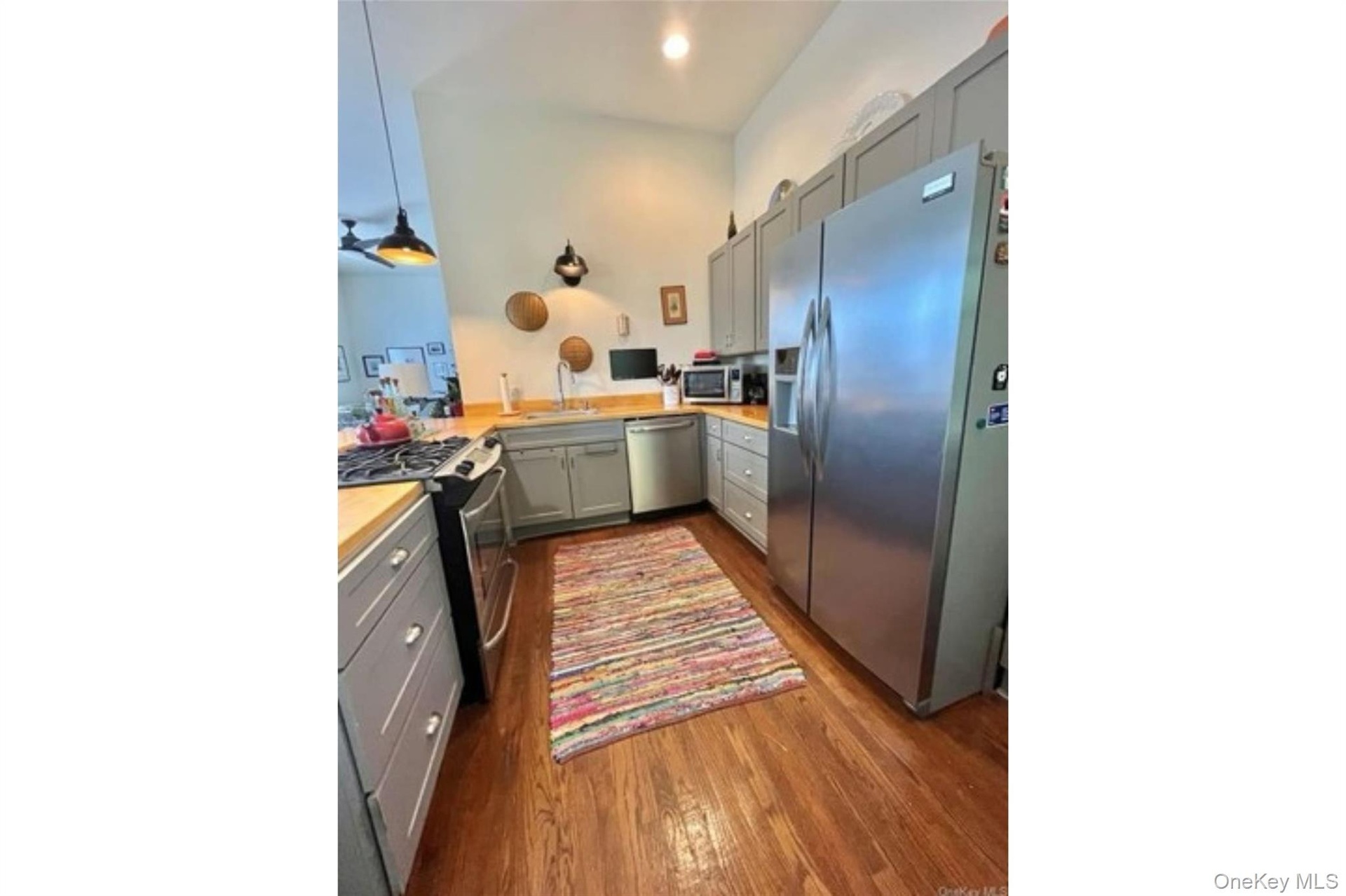 - Kitchen with gray cabinets, a peninsula, appliances with stainless steel finishes, dark wood finished floors, and wood counters