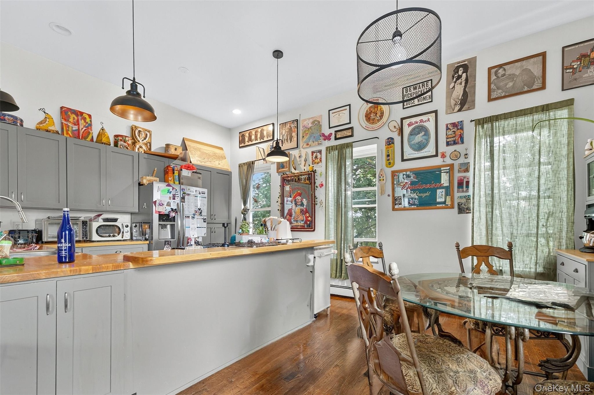 - Kitchen featuring dark wood-style floors, stainless steel refrigerator with ice dispenser, hanging light fixtures, gray cabinetry, and butcher block c