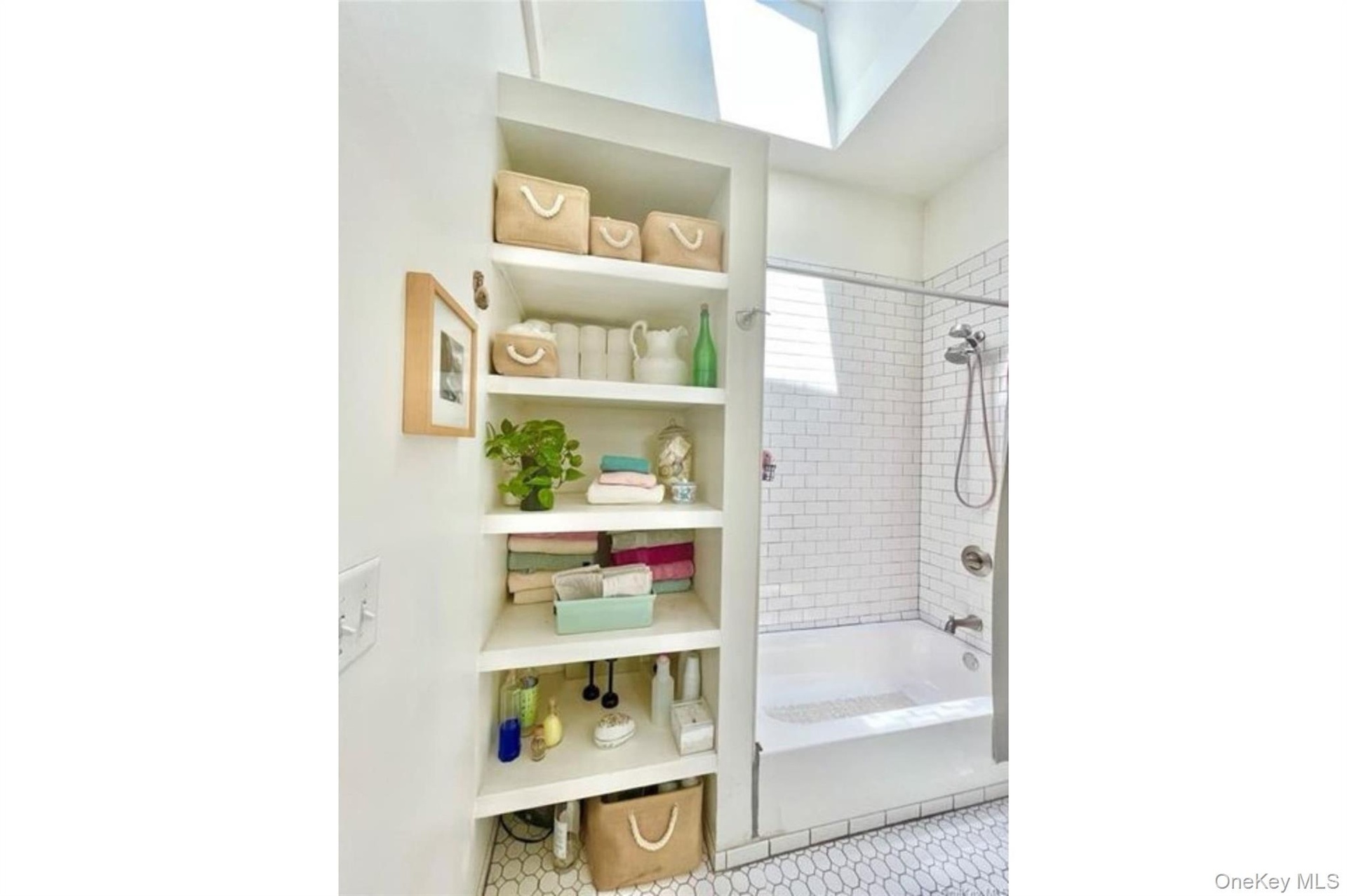 - Bathroom featuring bathing tub / shower combination and a skylight
