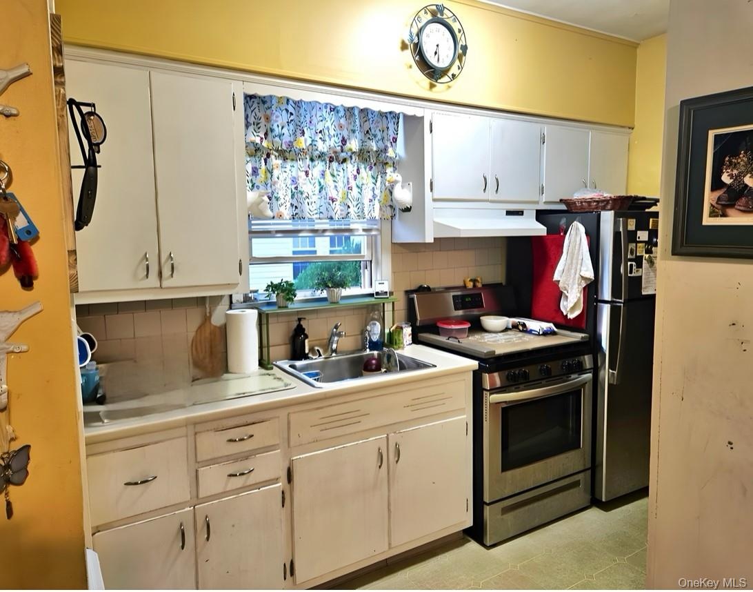 - Kitchen with tasteful backsplash, stainless steel range oven, white cabinets, light countertops, and under cabinet range hood