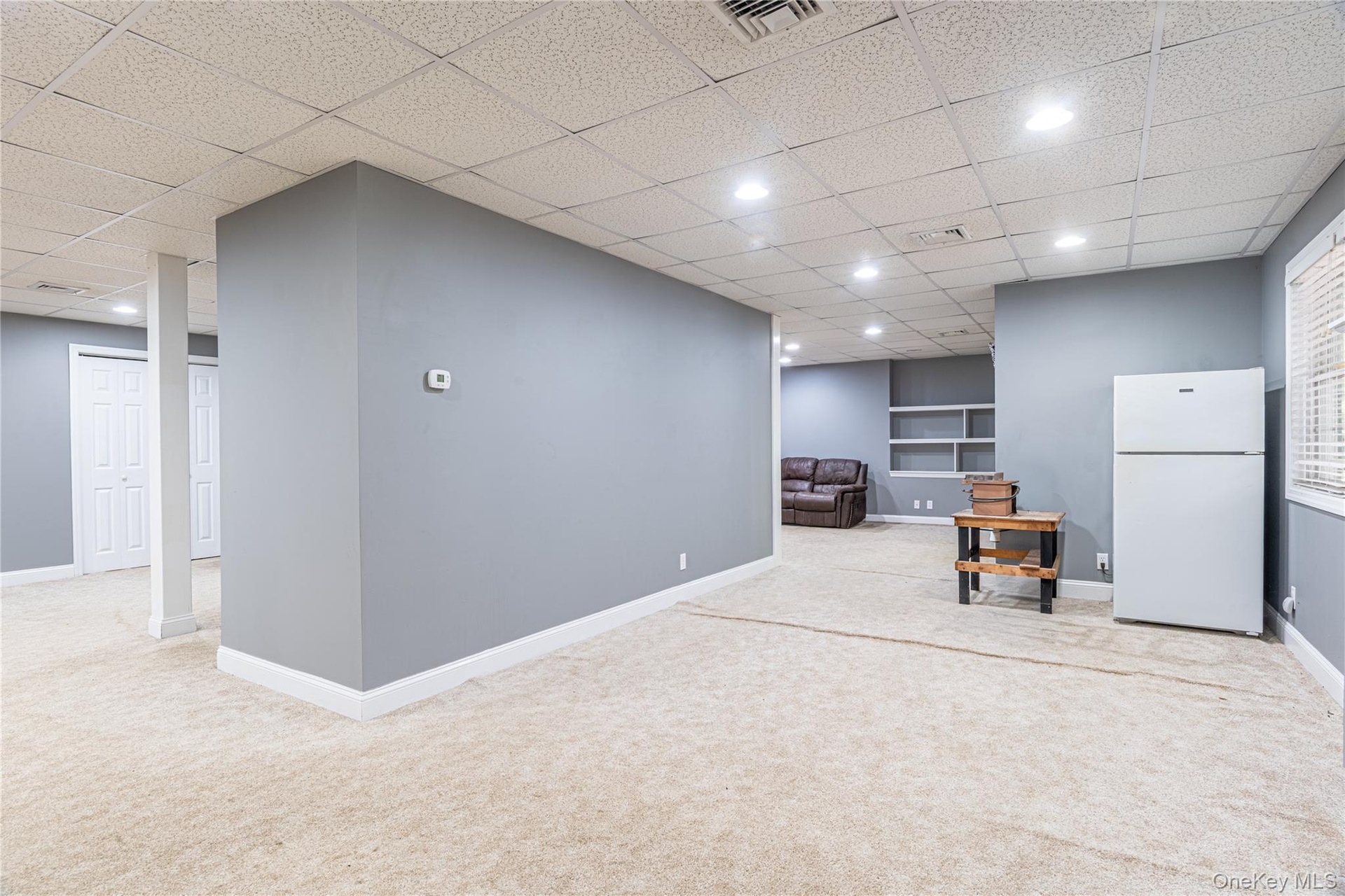- Finished basement featuring light colored carpet, freestanding refrigerator, recessed lighting, and a paneled ceiling