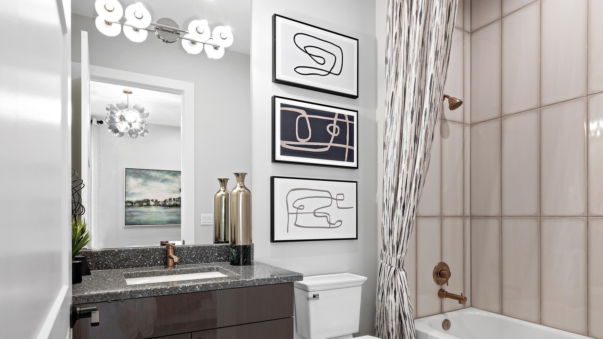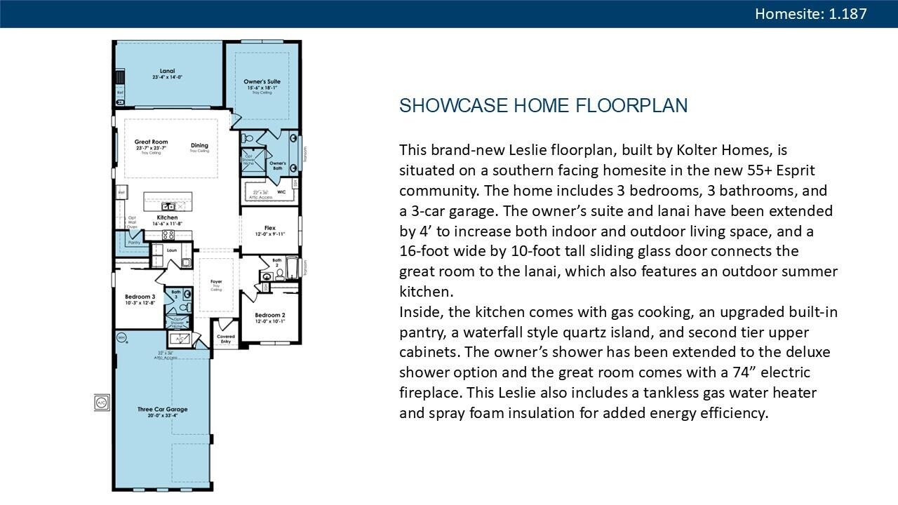 **Under Construction** This brand-new Leslie floorplan, built by Kolter Homes, is situated on a southern facing homesite in the new 55+ Esprit community. The home includes 3 bedrooms, 3 bathrooms, and a 3-car garage. The owner's suite and lanai have been extended by 4' to increase both indoor and outdoor living space, and a 16-foot wide by 10-foot-tall sliding glass door connects the great room to the lanai, which also features an outdoor summer kitchen. Inside, the kitchen comes with gas cooking, an upgraded built-in pantry, a waterfall style quartz island, and second tier upper cabinets. The owner's shower has been extended to the deluxe shower option, and the great room comes with a 74'' electric fireplace.