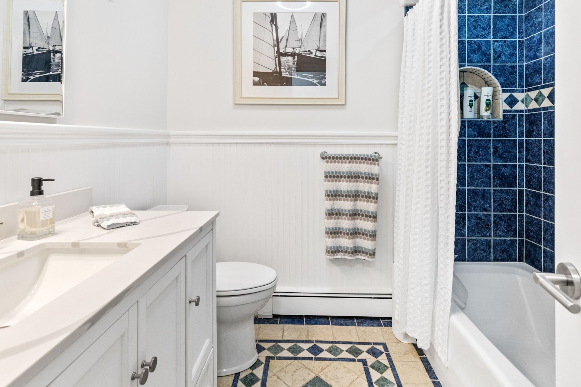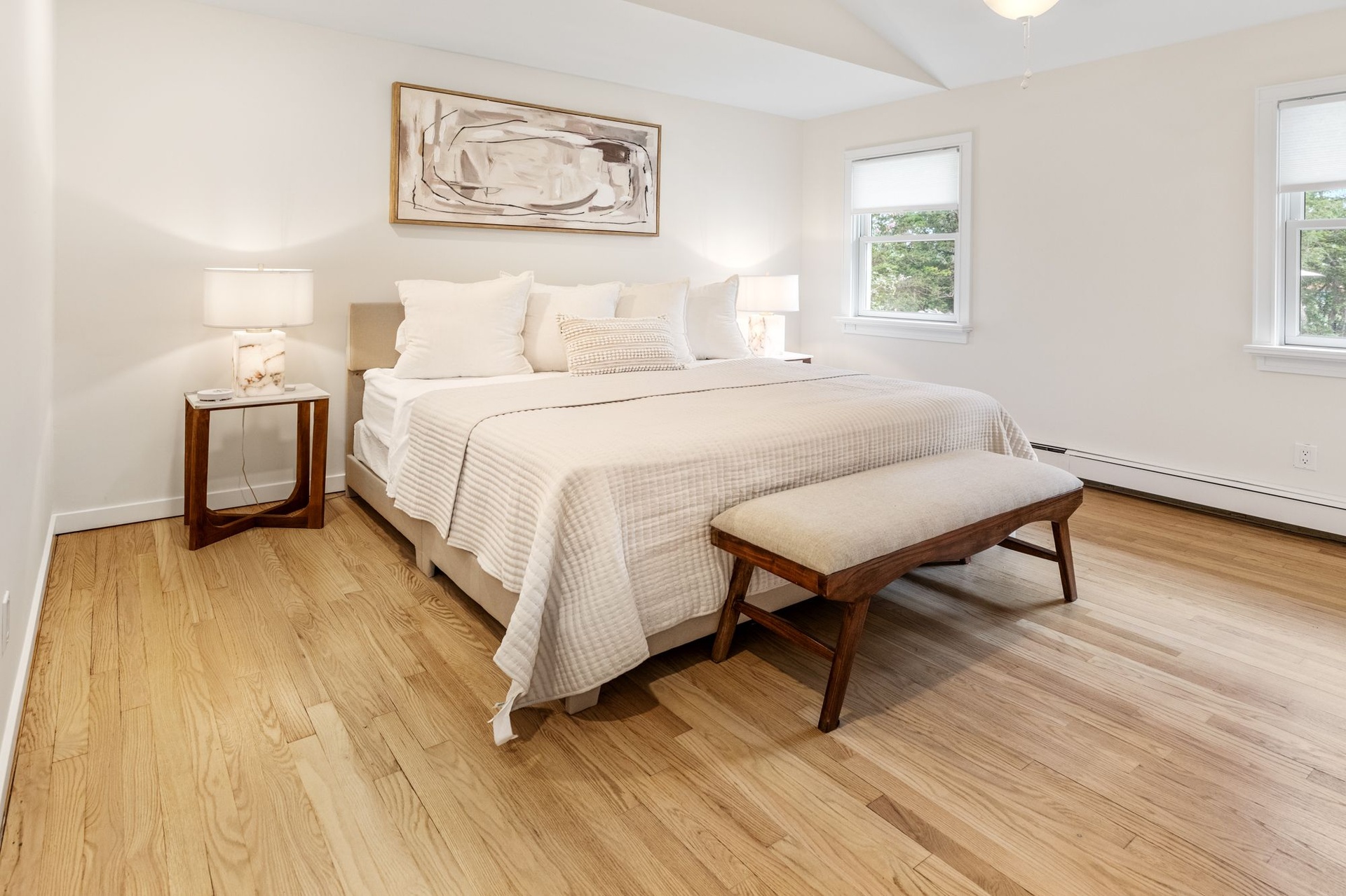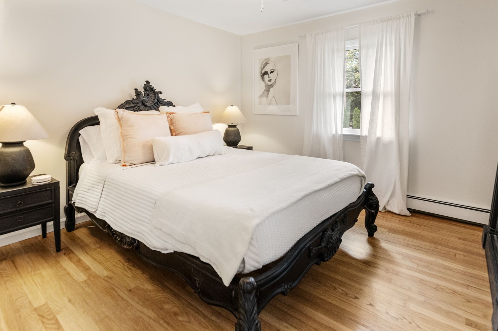 Down the hall are three generously sized bedrooms all staged with new bedding and linens, and two full bathrooms, including a primary private en-suite. On the opposite wing, the former one-car garage has been legally converted into a stylish den or flexible bonus space.
