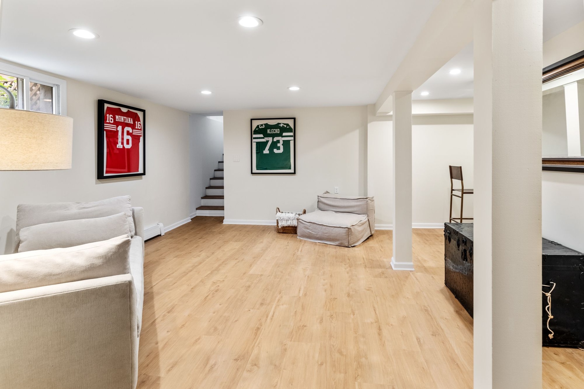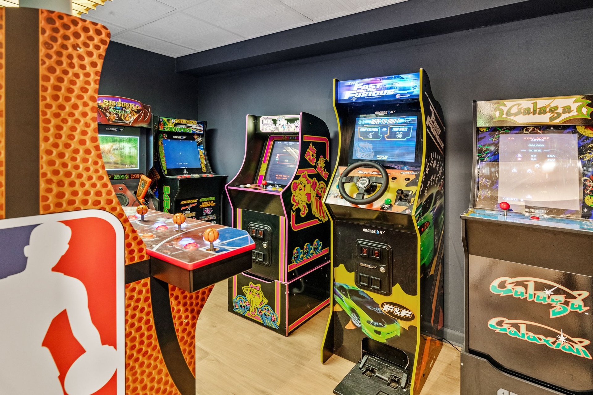 The finished basement elevates the home further, featuring a game room with six classic arcade machines, a media room/den, a bonus room for additional guests, full bathroom, and laundry room.
