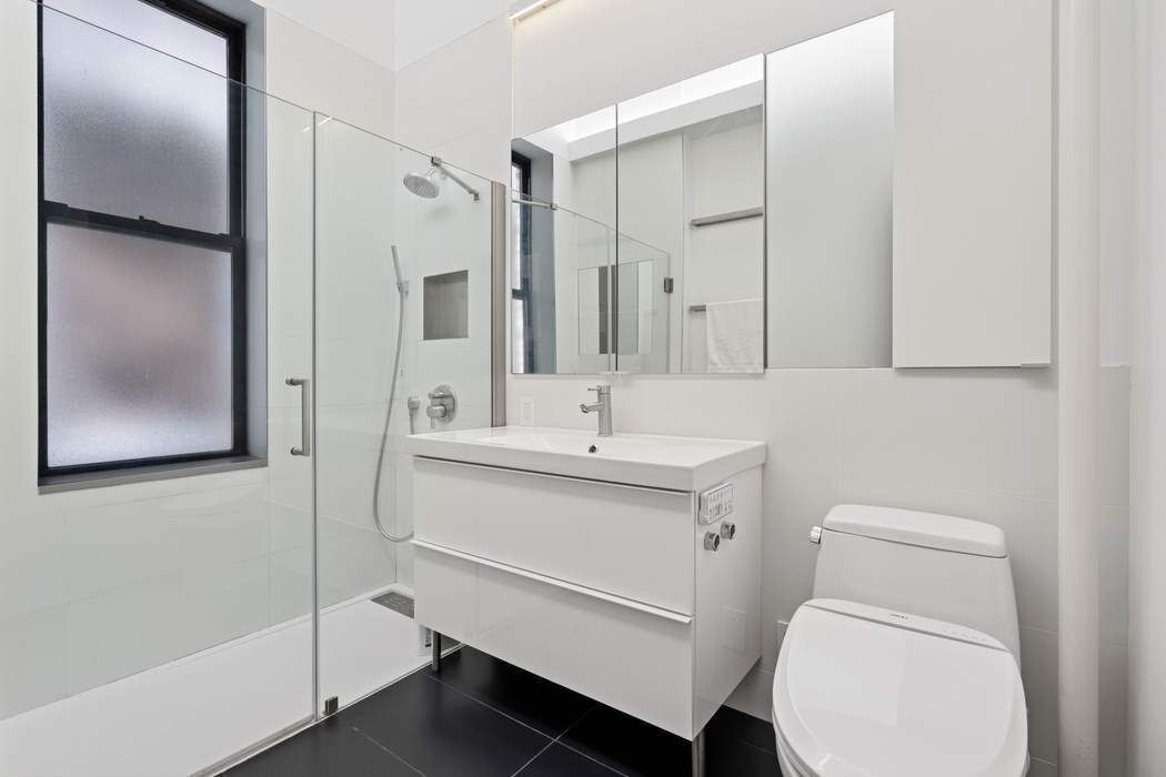- Windowed bath with modern finishes: Flush mount shower base with glass door, Toilet with bidet seat