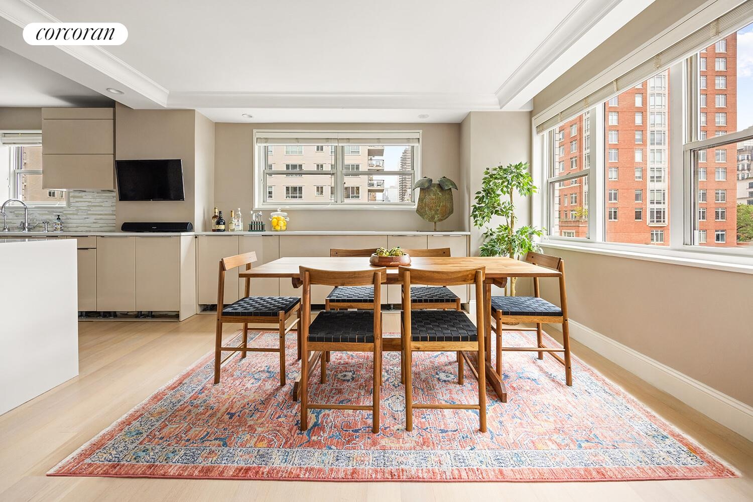 This elegantly renovated home features an open-concept layout with south and west-facing windows that flood the space with natural light throughout the day. The chef's kitchen showcases sophisticated design with sleek custom cabinetry, stainless steel appliances including Bosch dishwasher, Liebherr fridge, Miele oven, quartz countertops, and island with counter stools, creating an ideal space for entertaining.