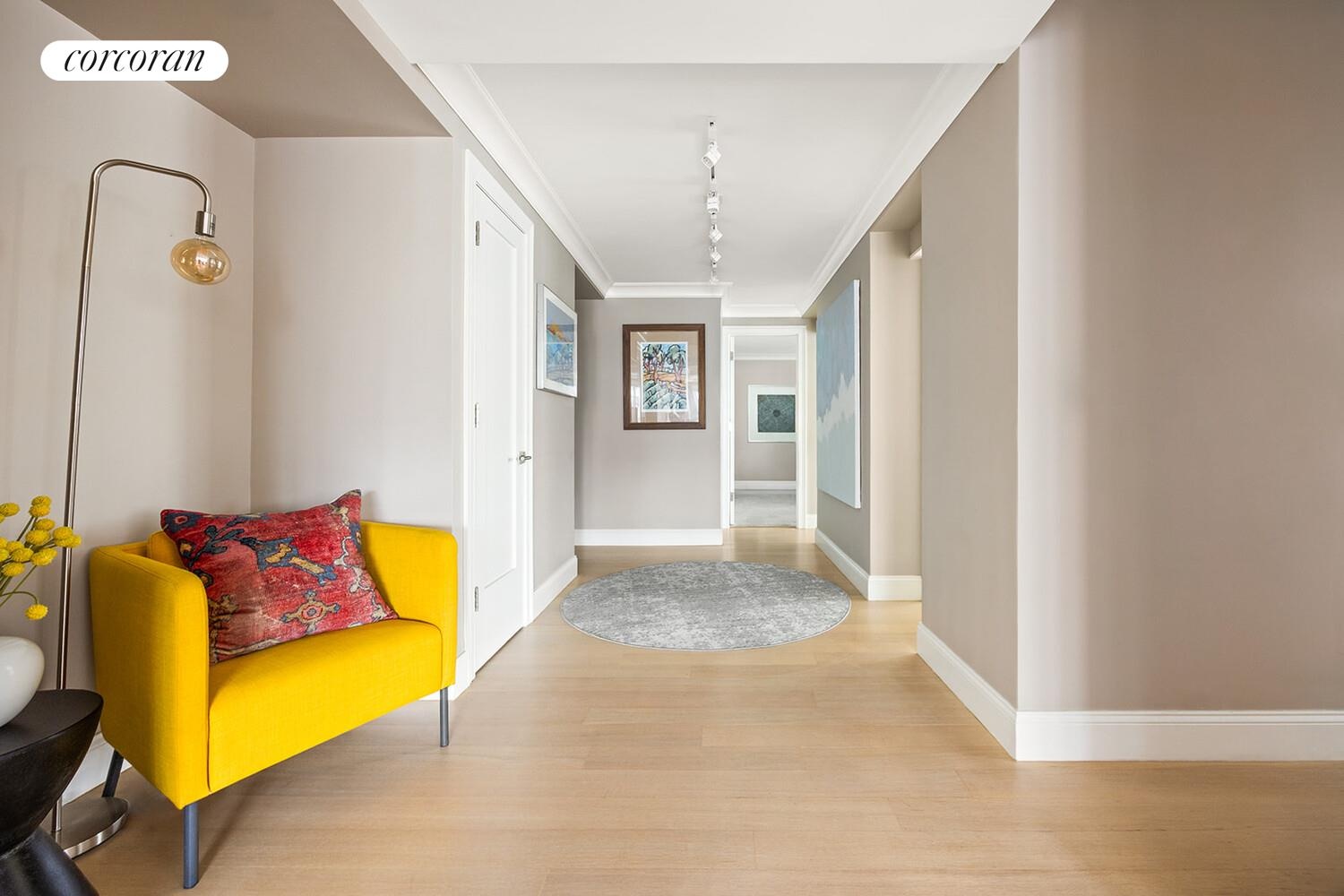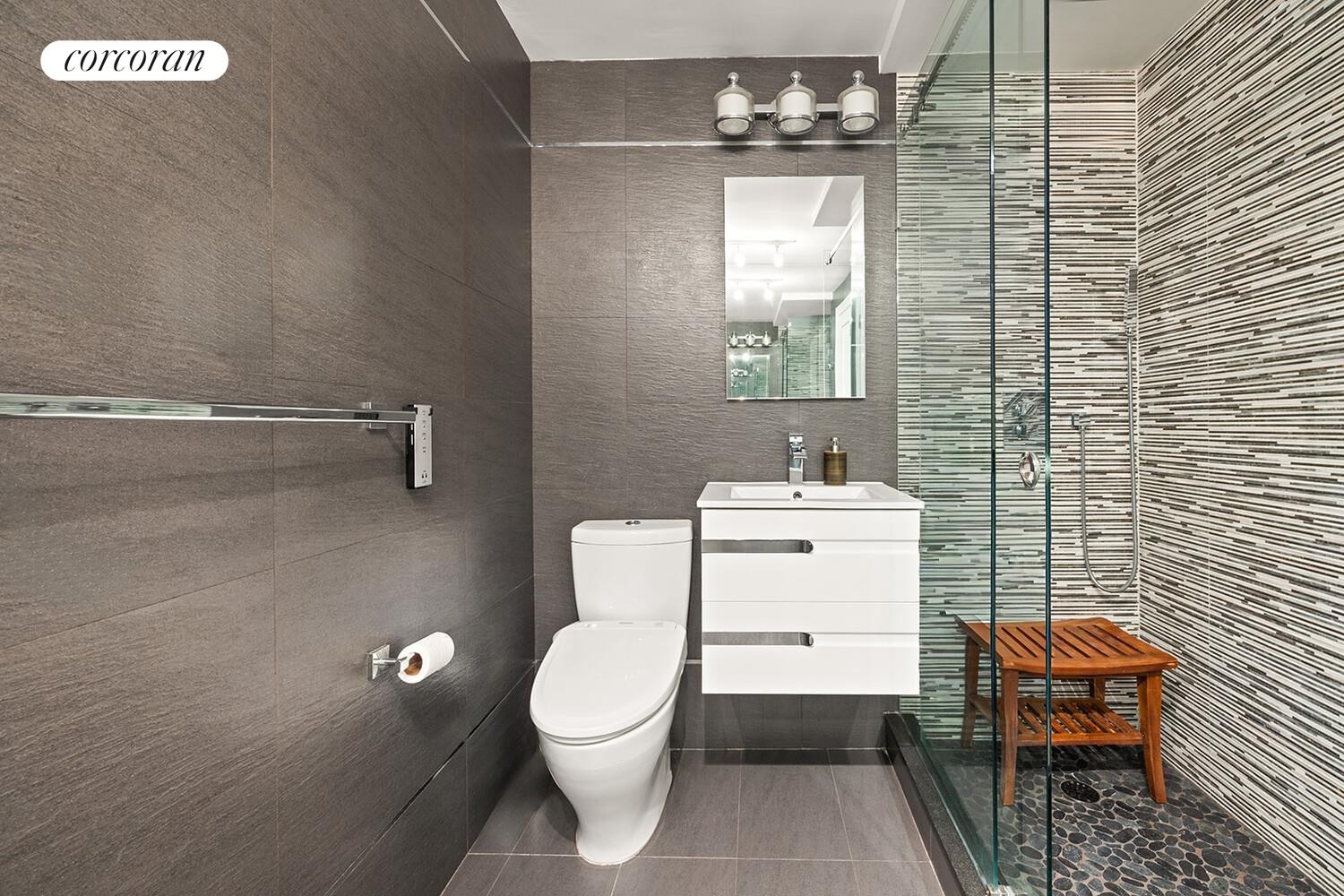 The thoughtfully designed floor plan includes a generously sized bedroom with custom built-in desk and a bathroom located just outside featuring a tub. The primary suite features a very spacious bedroom, dedicated home office, and expansive walk-in closet. The primary en-suite bathroom boasts a large walk-in shower with convenient linen closet tucked away. All bathrooms feature premium Toto toilets. The elegant renovation emphasizes storage solutions, a welcoming foyer with ample closet storage, and custom built-ins that maximize functionality while maintaining refined design.