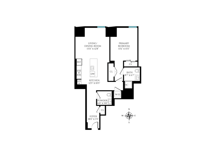 The well-proportioned bedroom fits a queen or king size bed. The bedroom features an en-suite bathroom that epitomizes spa-like indulgence. Enjoy the warmth of Bianco Dolomiti radiant heated floors, relax in glass shower, and appreciate the meticulous detail of the Marno Illusion marble that enhances the space. A custom vanity, complete with rift-cut wood veneer, is a masterpiece of craftsmanship, further refined by top-of-the-line Kallista and Dornbracht fixtures. The powder room stands out with its striking Nero Maquina marble, providing a bold contrast to the residence's otherwise light and airy aesthetic. A Cobalt Flash marble wet wall and ebony-stained oak vanity make a strong visual statement. Additional apartment features are soaring 9’9” ceilings, floor-to-ceiling windows, White oak flooring, A Nest Learning Thermostat and a Bosch washer and dryer.