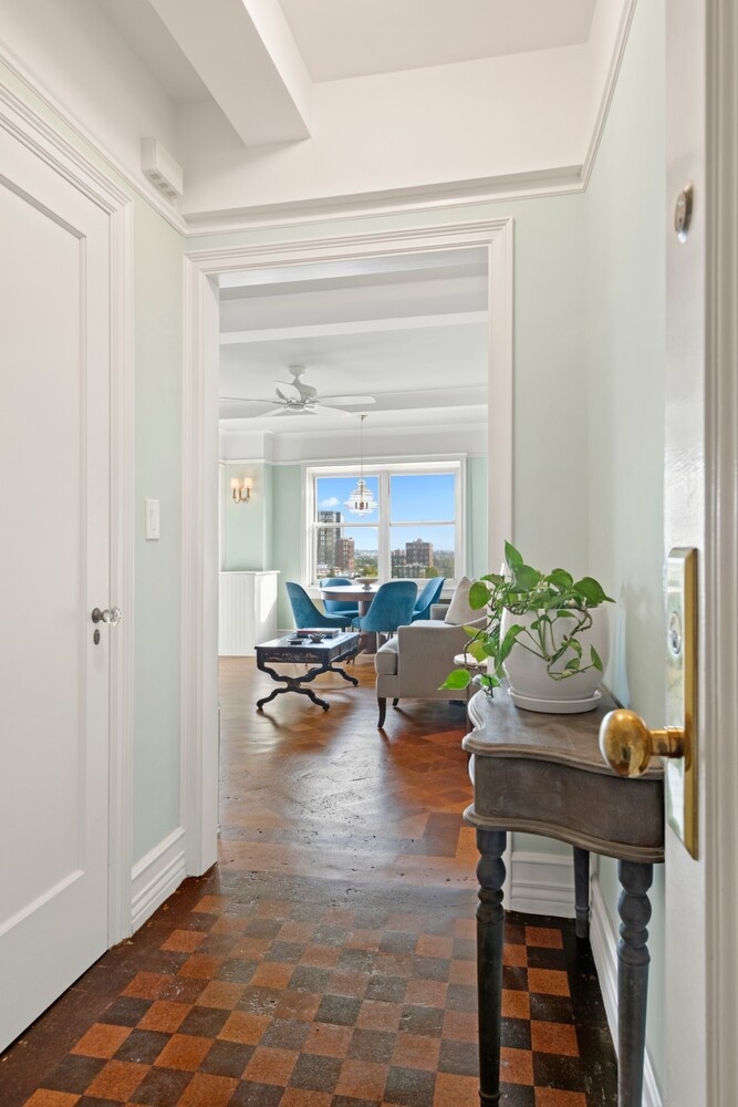 Additional features of the home include the original brass hardware on doors, beautiful vintage-inspired lighting fixtures, upgraded moldings, a customized coat closet, a magnificent double closet opposite the bathroom and the original prewar cork floors throughout.