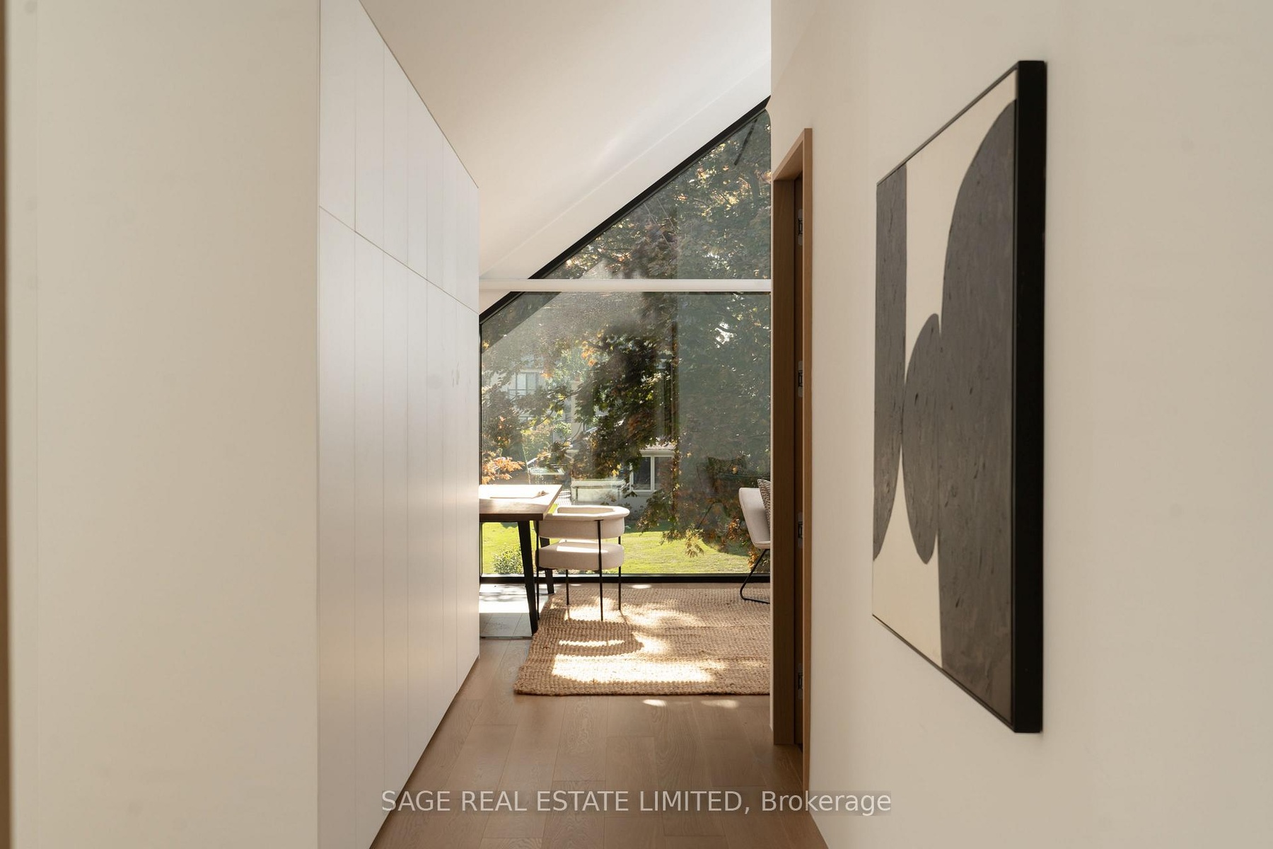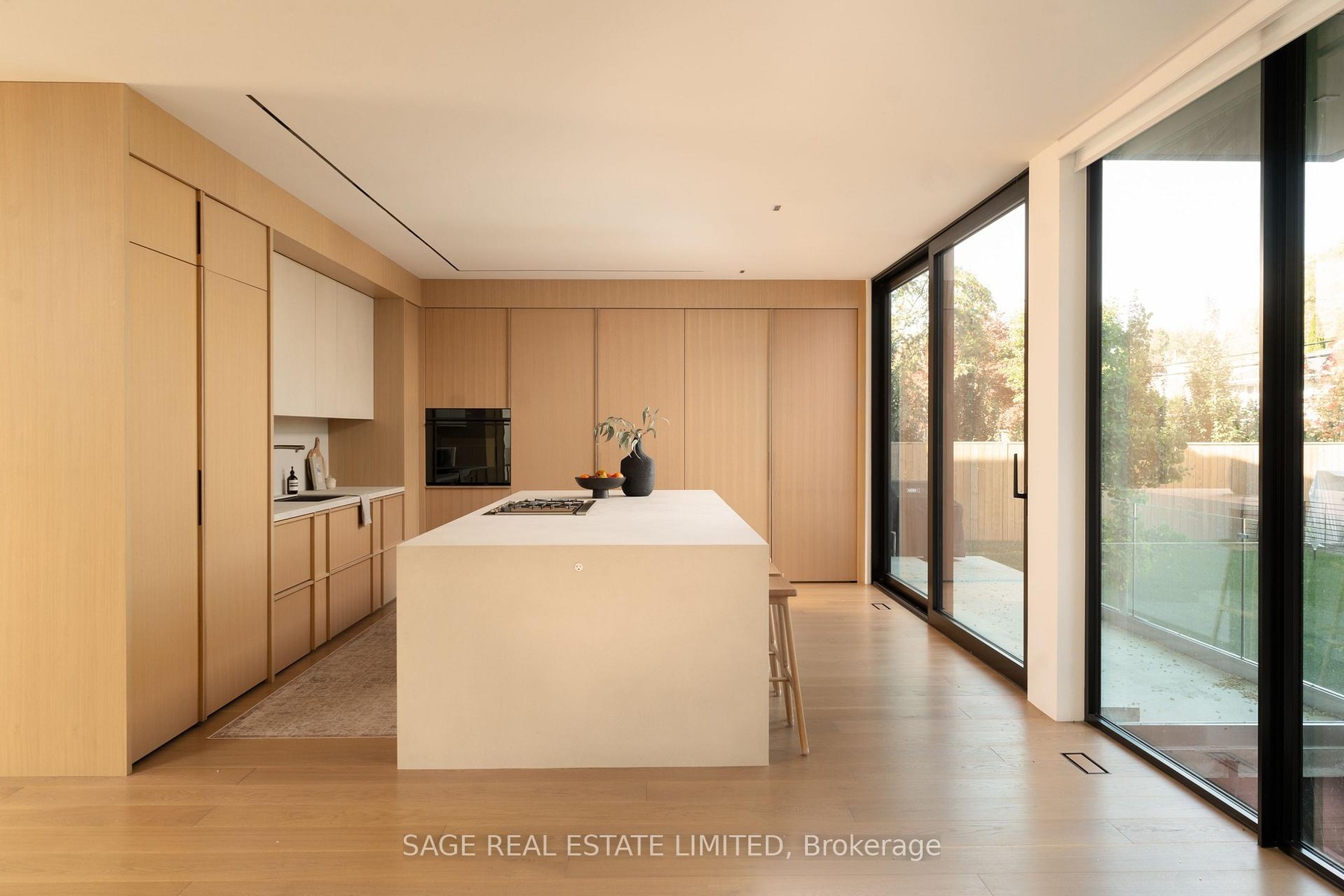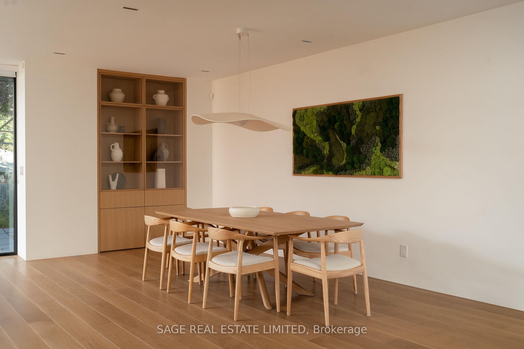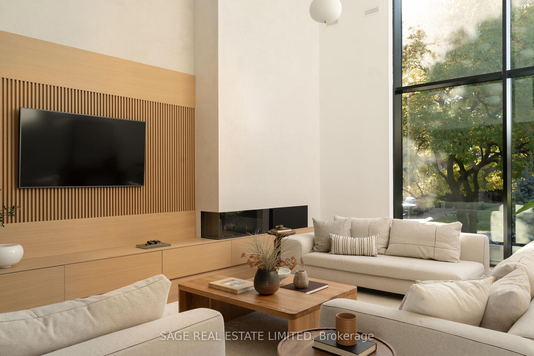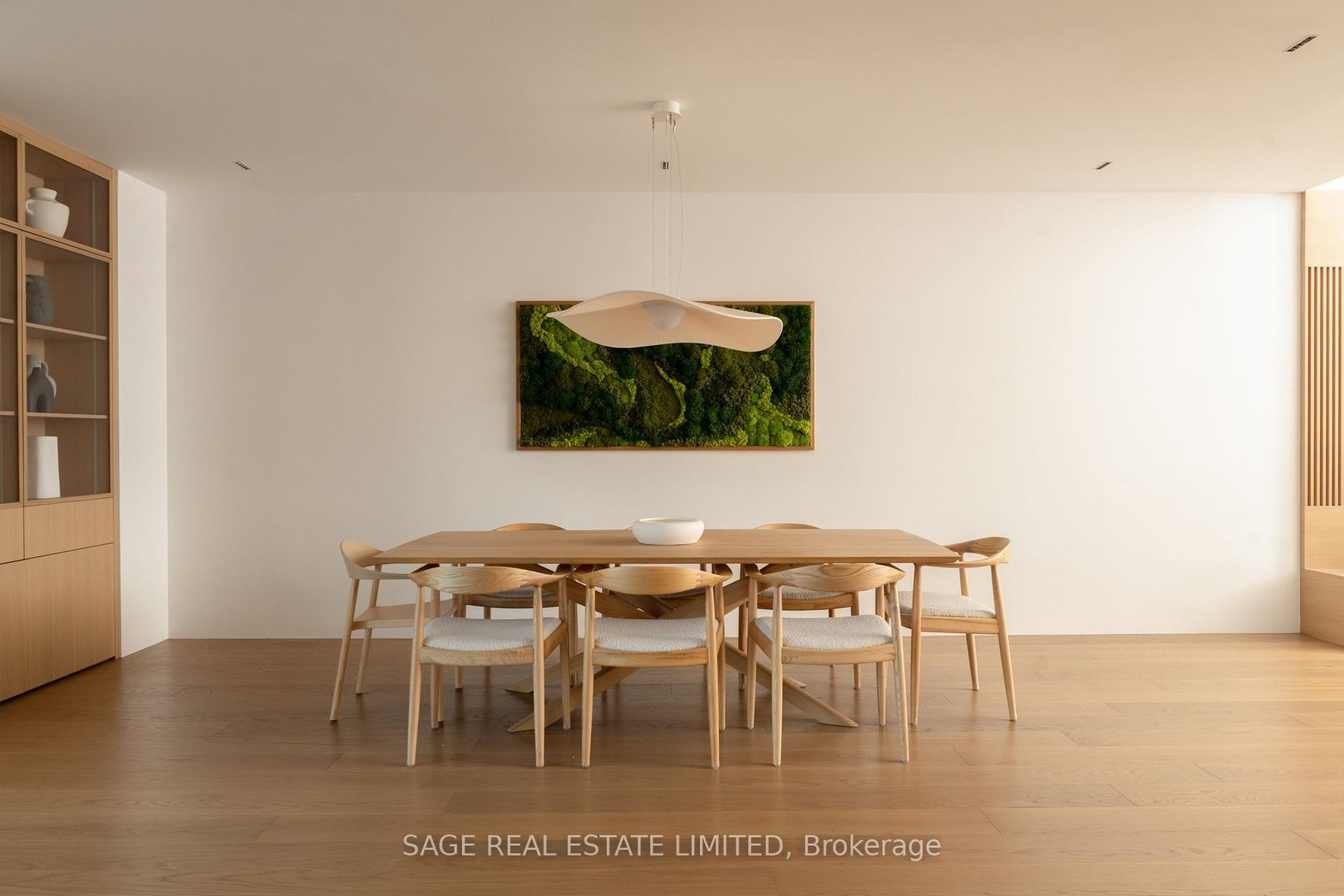 A gentle fusion of Scandinavian and Japanese design, The Emperor sits proudly in Toronto's charming Princess Anne Manor neighbourhood. This detached custom build is an architectural wonder of the west end with smooth finishes, oak floors and panelling, plunging sight lines and cascading sunlight. Hidden doors reveal themselves at your fingertips to unassuming ensuite bathrooms dressed in creams and stone or covert closets with abundant storage - its invisible lines maintain minimalism at the forefront of its demure design. Dramatic floor-to-ceiling windows rise 21 feet high in the main living, wide open to a generously sized dining room and bright kitchen with an exceptional breakfast island and concealed coffee nook. Fluting and custom millwork anchors the front entrance and frames the tv, complimenting the microcement finished gas fireplace. A constellation of soft lights quietly illuminates the home, a spectacle when the sun goes down, while its tobacco coloured facade stretches across the 76 foot wide lot and leads to an inground saltwater pool at the rear. Beneath century old canopy trees, around slow swooping roads, this one-of-a-kind modern build is two minutes from St George's Golf & Country Club & only ten minutes to Pearson Airport. Over 5000 total square feet, your choice of two primary bedrooms and multiple flex spaces on the top floor with the option to convert them to extra bedrooms - executives, creatives, gamers, podcasters, families and fitness enthusiasts will find limitless potential and a whole new meaning to going home at 38 Ravensbourne.
