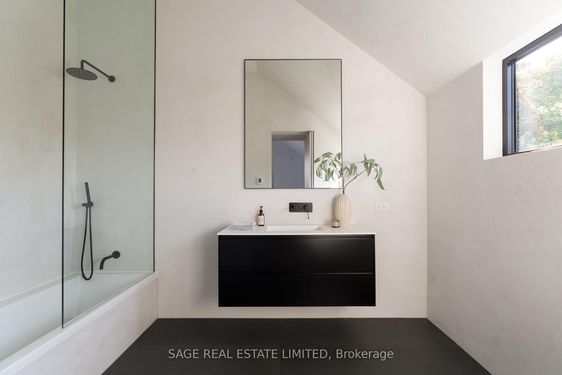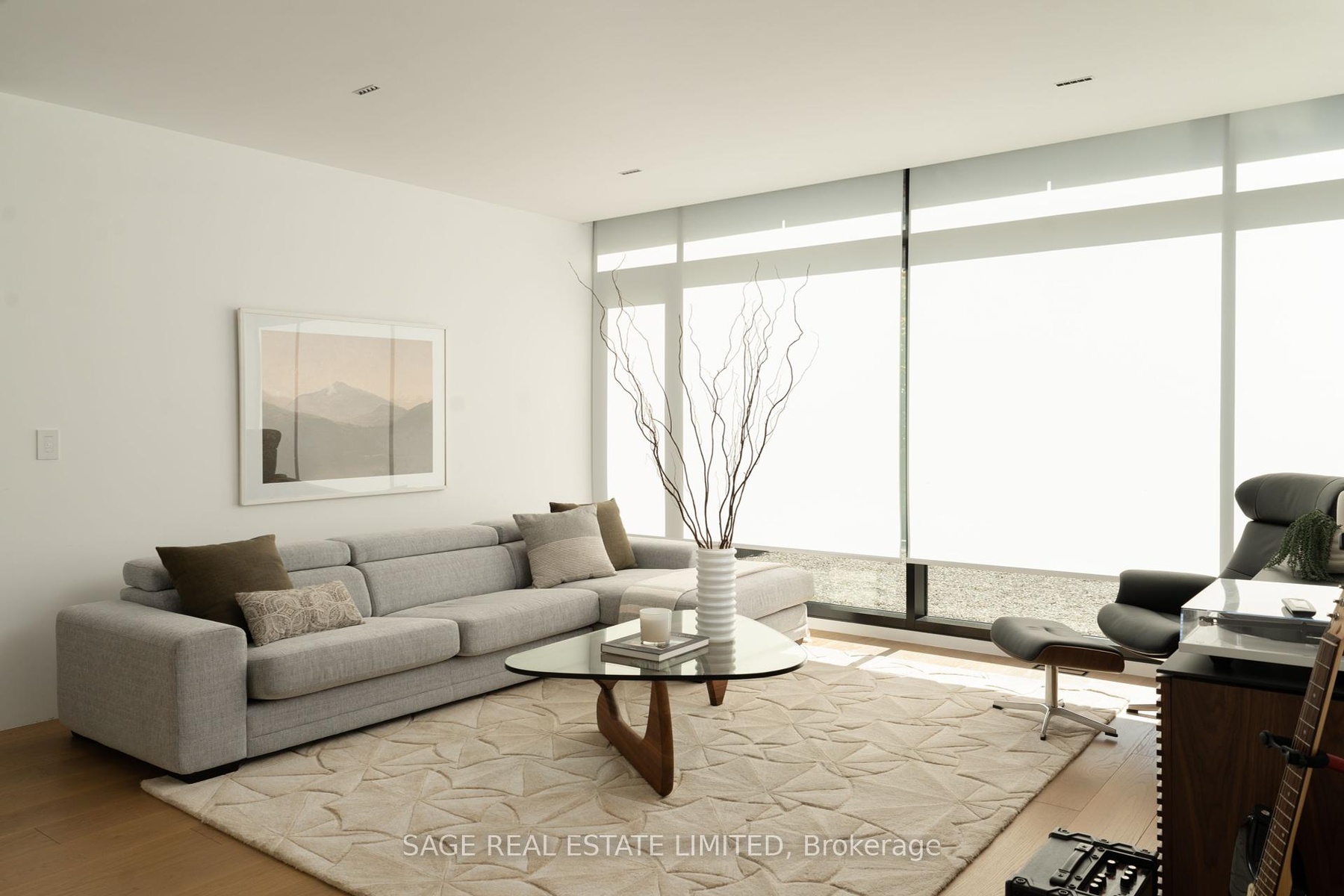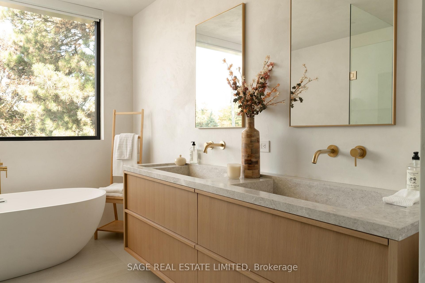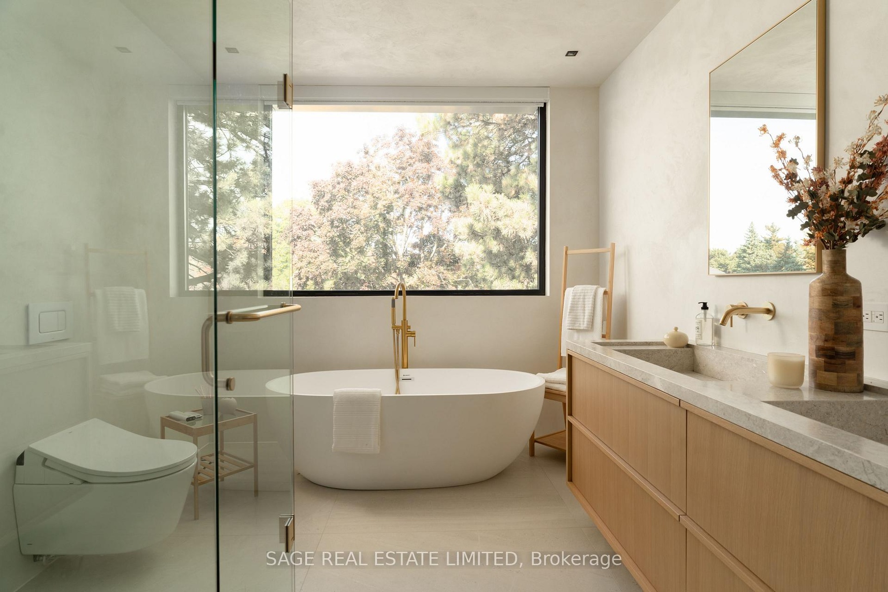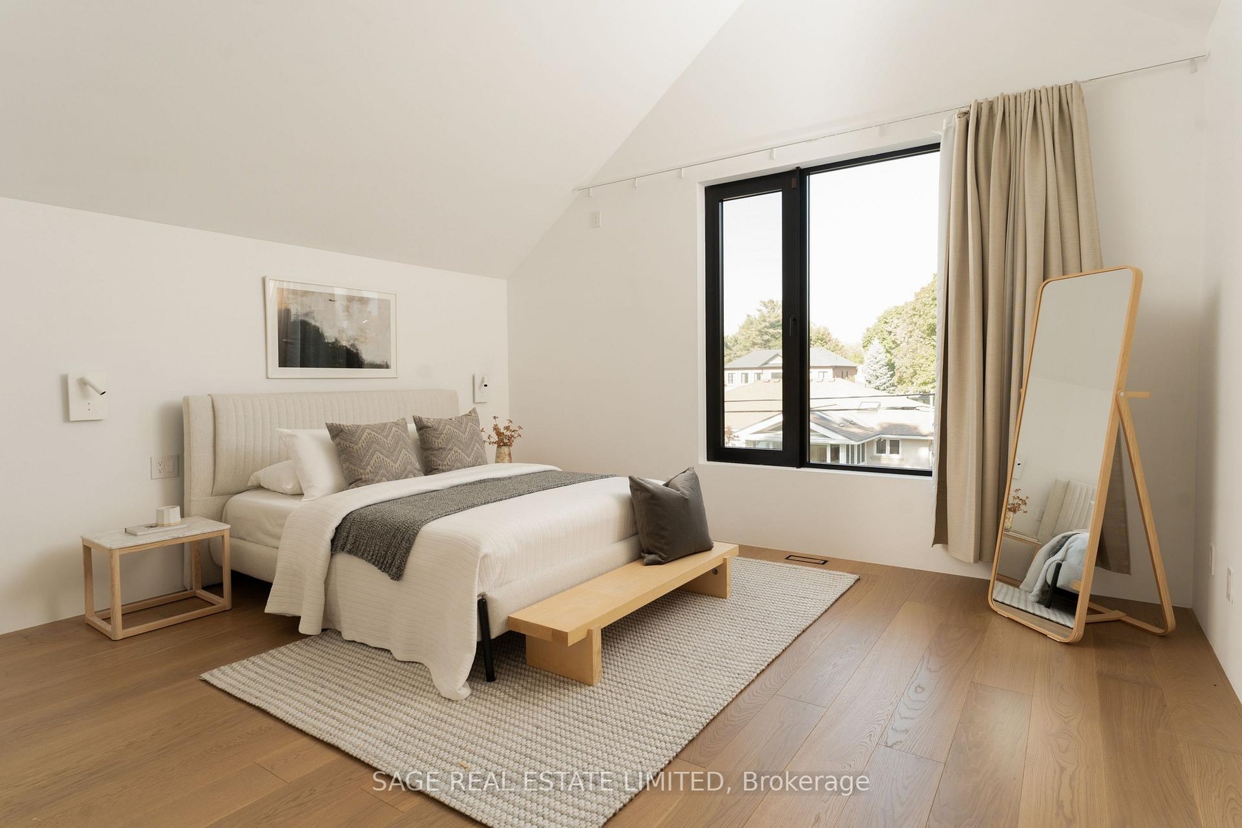 A gentle fusion of Scandinavian and Japanese design, The Emperor sits proudly in Toronto's charming Princess Anne Manor neighbourhood. This detached custom build is an architectural wonder of the west end with smooth finishes, oak floors and panelling, plunging sight lines and cascading sunlight. Hidden doors reveal themselves at your fingertips to unassuming ensuite bathrooms dressed in creams and stone or covert closets with abundant storage - its invisible lines maintain minimalism at the forefront of its demure design. Dramatic floor-to-ceiling windows rise 21 feet high in the main living, wide open to a generously sized dining room and bright kitchen with an exceptional breakfast island and concealed coffee nook. Fluting and custom millwork anchors the front entrance and frames the tv, complimenting the microcement finished gas fireplace. A constellation of soft lights quietly illuminates the home, a spectacle when the sun goes down, while its tobacco coloured facade stretches across the 76 foot wide lot and leads to an inground saltwater pool at the rear. Beneath century old canopy trees, around slow swooping roads, this one-of-a-kind modern build is two minutes from St George's Golf & Country Club & only ten minutes to Pearson Airport. Over 5000 total square feet, your choice of two primary bedrooms and multiple flex spaces on the top floor with the option to convert them to extra bedrooms - executives, creatives, gamers, podcasters, families and fitness enthusiasts will find limitless potential and a whole new meaning to going home at 38 Ravensbourne.