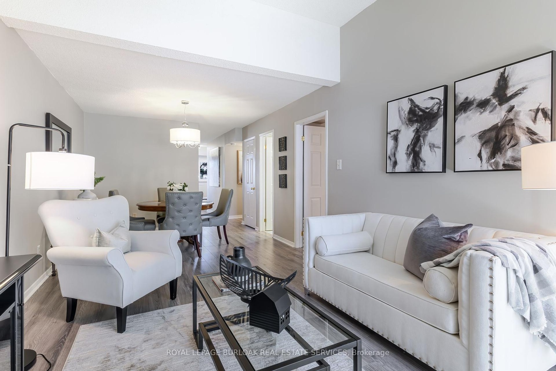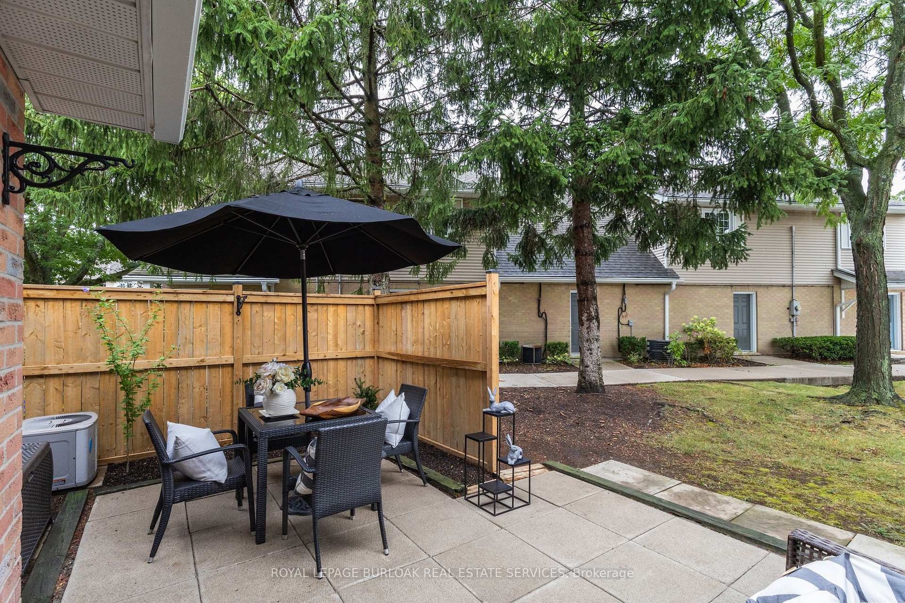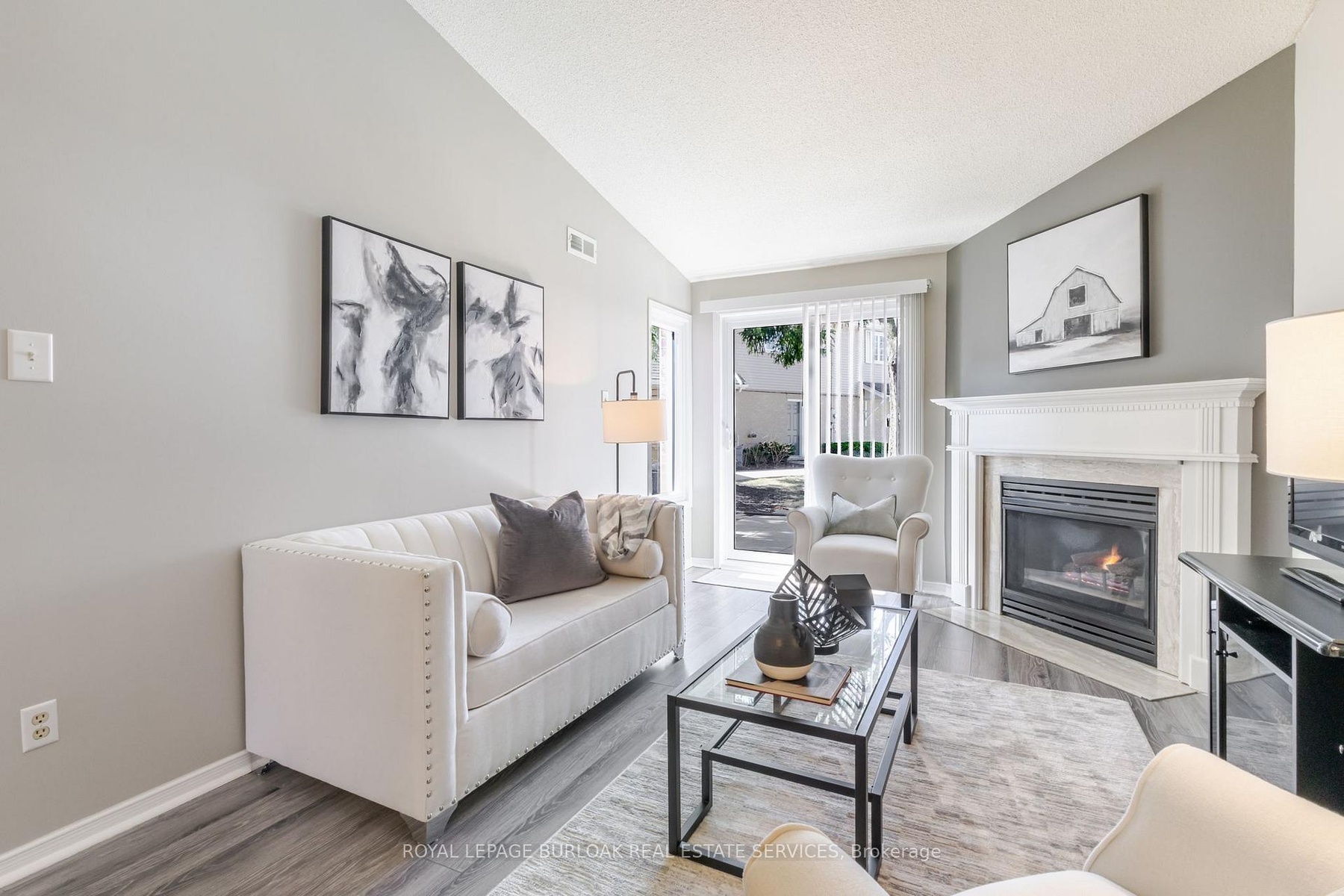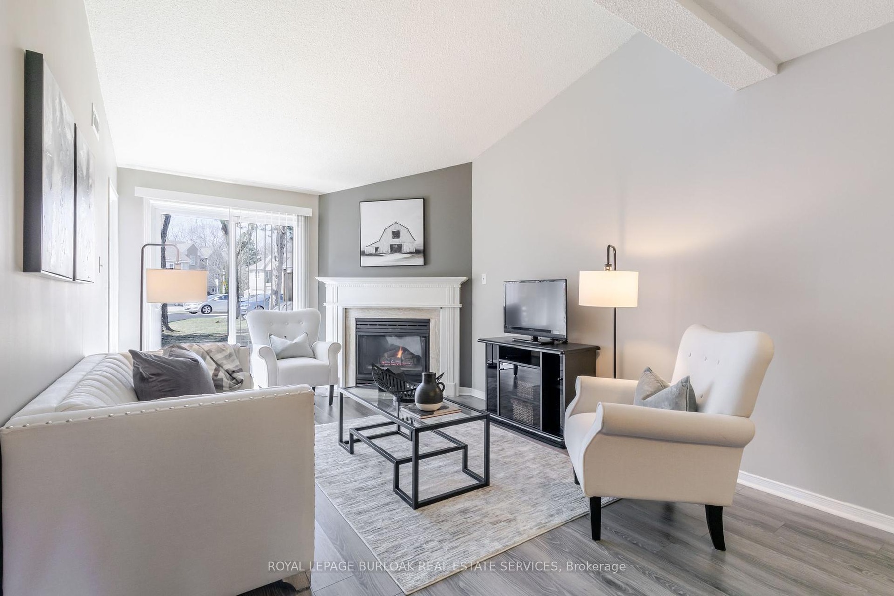 Sharp Renovated 2-bedroom main floor unit in a 2-Storey Stacked Condo Town Home. Absolutely Move-in Ready Condo with a stunning Garden Terrace. These popular well-managed homes are located in Burlington's Sought-After Headon Forest neighbourhood. Very Bright and Modern, Open Concept Design offering 898 s. f. Professionally Painted in Designer Tones and Carpet Free. The welcoming foyer is adjacent to the bright, recent eat-in kitchen offering numerous cabinets, generous counter space & a spacious dinette area. A comfy seating could be placed in front of the large windows in the sunroom for a perfect people watching set up. Steps from here is the Living-Dining Room well-suited for evenings relaxing at home and for family / friend gatherings in front of the cozy gas fireplace. The convenience of a direct step out to the large and private garden retreat to enjoy a BBQ and summer evenings in nature and quiet tranquility is a bonus. The Primary Bedroom is sizeable with a large closet and overlooks the gardens &terrace. Bedroom 2 is good-sized. This room can also be used as a handy home office or hobby room. Nicely tucked away you will find the 4-piece bathroom and a laundry/utility closet. Renovations/Upgrades Include: Kitchen with beautiful white cabinetry - Ensuite bath: 2023 Stunning, low maintenance tile flooring & shower walls Pot lighting Vanity for storage. Newer laminate flooring in most rooms. Gas furnace & Air Conditioning Unit: 2017. Electric Water Heater: 2017. The complex features great visitor parking. Close to Services: Shopping, Parks and Commuter Routes. Great Value and a Pleasure to View Schedule a viewing today