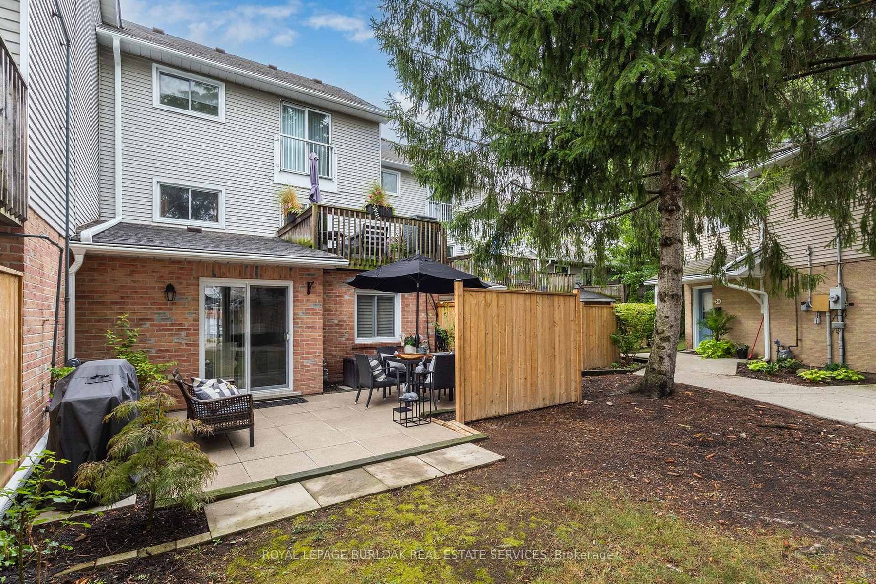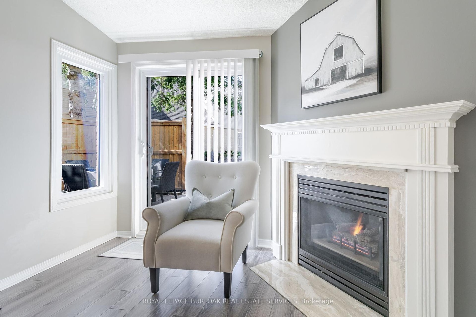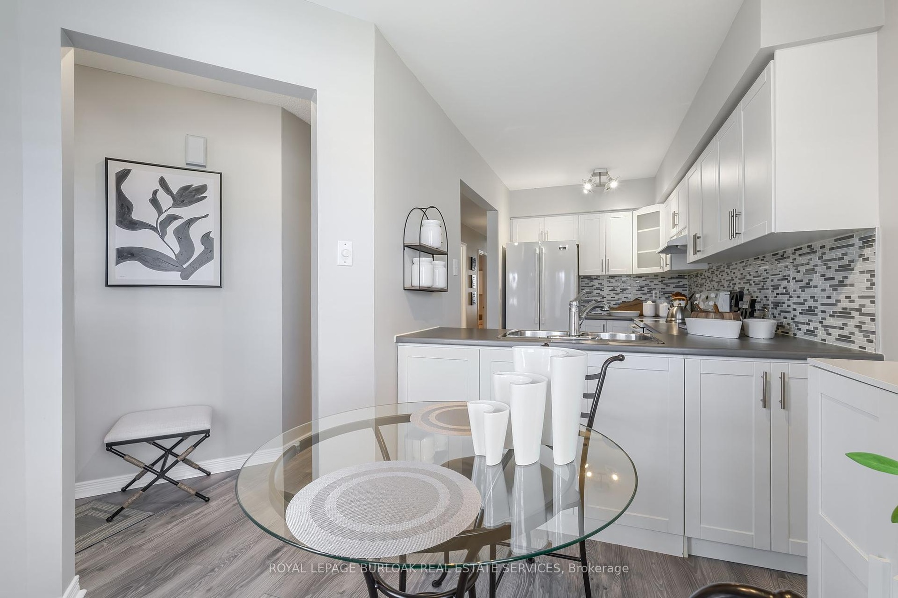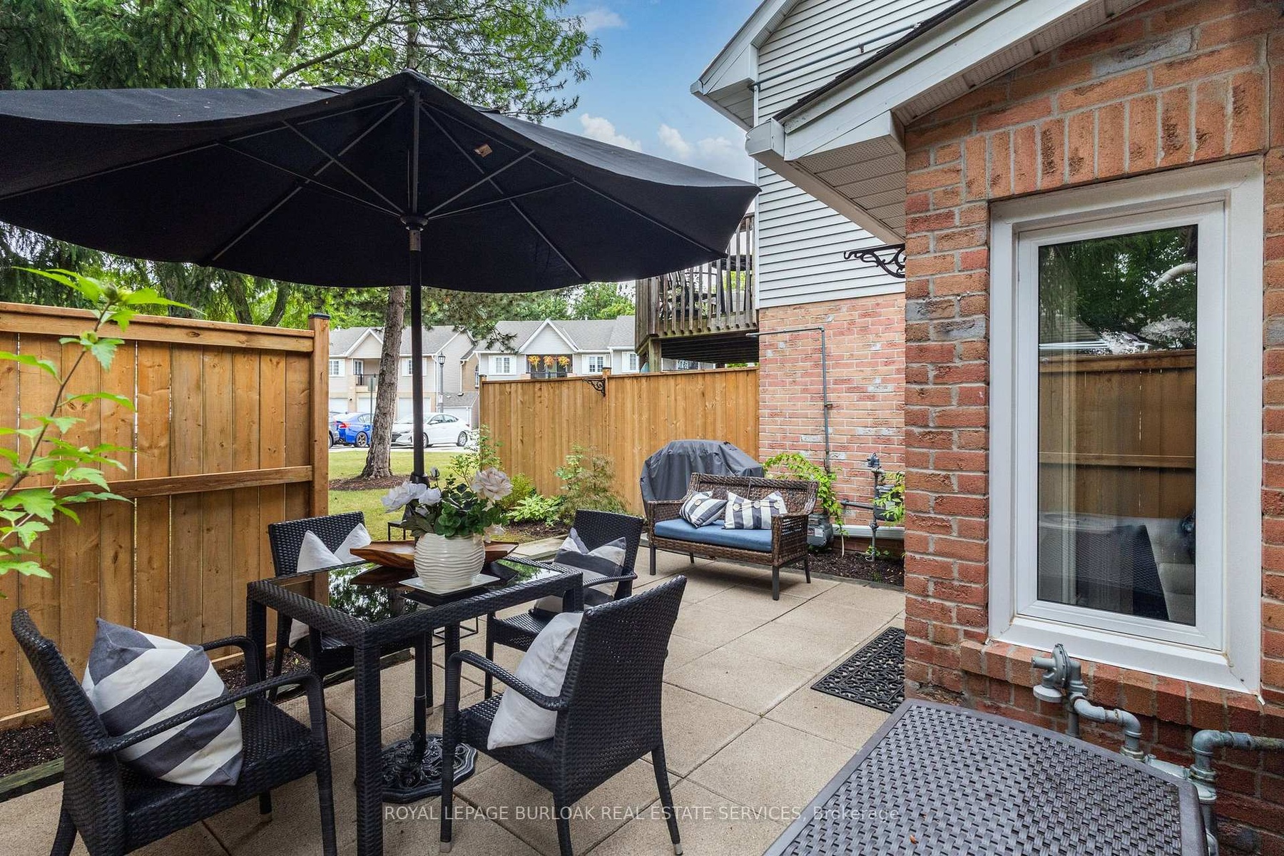 Sharp Renovated 2-bedroom main floor unit in a 2-Storey Stacked Condo Town Home. Absolutely Move-in Ready Condo with a stunning Garden Terrace. These popular well-managed homes are located in Burlington's Sought-After Headon Forest neighbourhood. Very Bright and Modern, Open Concept Design offering 898 s. f. Professionally Painted in Designer Tones and Carpet Free. The welcoming foyer is adjacent to the bright, recent eat-in kitchen offering numerous cabinets, generous counter space & a spacious dinette area. A comfy seating could be placed in front of the large windows in the sunroom for a perfect people watching set up. Steps from here is the Living-Dining Room well-suited for evenings relaxing at home and for family / friend gatherings in front of the cozy gas fireplace. The convenience of a direct step out to the large and private garden retreat to enjoy a BBQ and summer evenings in nature and quiet tranquility is a bonus. The Primary Bedroom is sizeable with a large closet and overlooks the gardens &terrace. Bedroom 2 is good-sized. This room can also be used as a handy home office or hobby room. Nicely tucked away you will find the 4-piece bathroom and a laundry/utility closet. Renovations/Upgrades Include: Kitchen with beautiful white cabinetry - Ensuite bath: 2023 Stunning, low maintenance tile flooring & shower walls Pot lighting Vanity for storage. Newer laminate flooring in most rooms. Gas furnace & Air Conditioning Unit: 2017. Electric Water Heater: 2017. The complex features great visitor parking. Close to Services: Shopping, Parks and Commuter Routes. Great Value and a Pleasure to View Schedule a viewing today