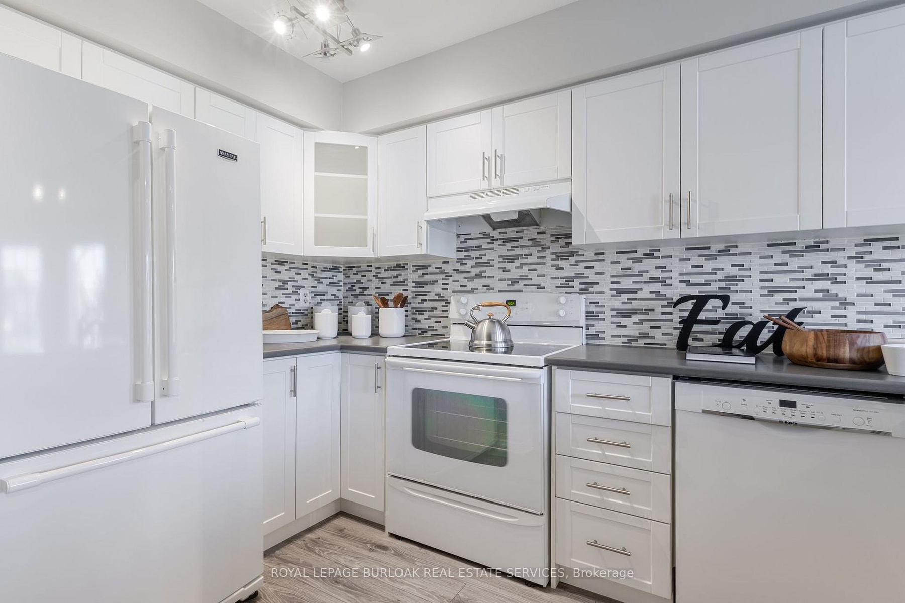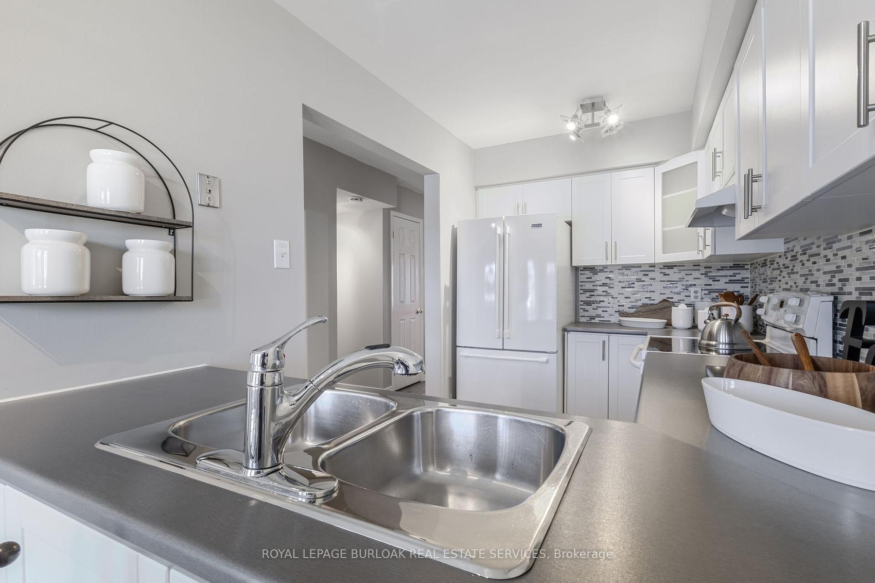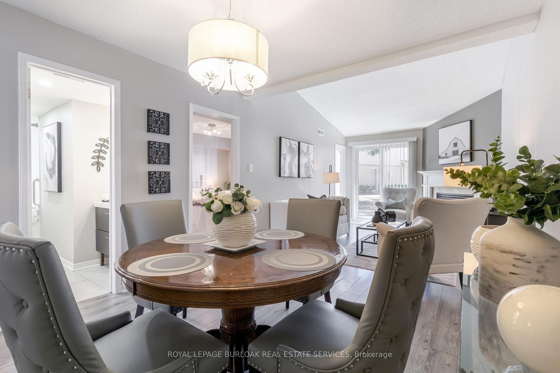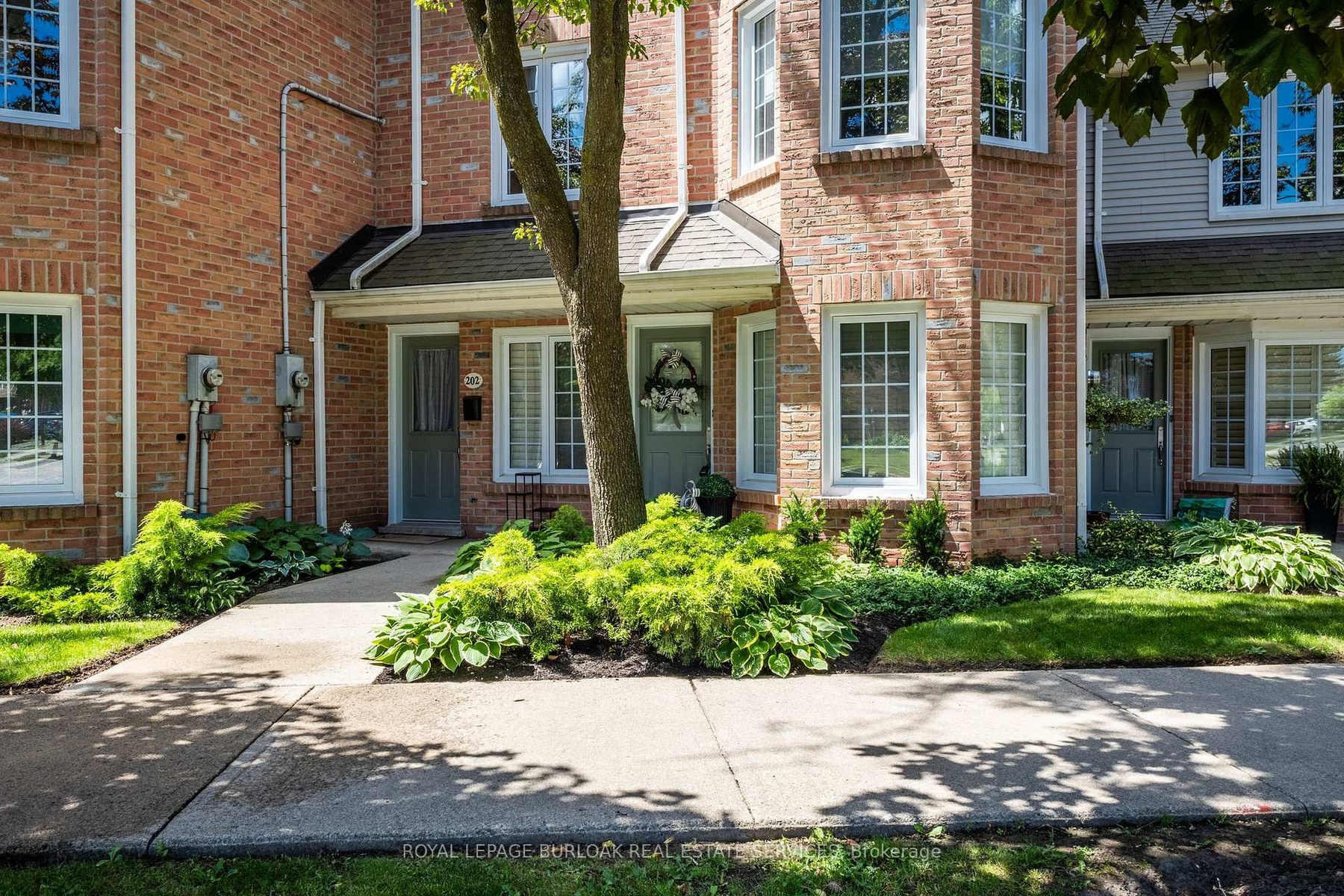 Sharp Renovated 2-bedroom main floor unit in a 2-Storey Stacked Condo Town Home. Absolutely Move-in Ready Condo with a stunning Garden Terrace. These popular well-managed homes are located in Burlington's Sought-After Headon Forest neighbourhood. Very Bright and Modern, Open Concept Design offering 898 s. f. Professionally Painted in Designer Tones and Carpet Free. The welcoming foyer is adjacent to the bright, recent eat-in kitchen offering numerous cabinets, generous counter space & a spacious dinette area. A comfy seating could be placed in front of the large windows in the sunroom for a perfect people watching set up. Steps from here is the Living-Dining Room well-suited for evenings relaxing at home and for family / friend gatherings in front of the cozy gas fireplace. The convenience of a direct step out to the large and private garden retreat to enjoy a BBQ and summer evenings in nature and quiet tranquility is a bonus. The Primary Bedroom is sizeable with a large closet and overlooks the gardens &terrace. Bedroom 2 is good-sized. This room can also be used as a handy home office or hobby room. Nicely tucked away you will find the 4-piece bathroom and a laundry/utility closet. Renovations/Upgrades Include: Kitchen with beautiful white cabinetry - Ensuite bath: 2023 Stunning, low maintenance tile flooring & shower walls Pot lighting Vanity for storage. Newer laminate flooring in most rooms. Gas furnace & Air Conditioning Unit: 2017. Electric Water Heater: 2017. The complex features great visitor parking. Close to Services: Shopping, Parks and Commuter Routes. Great Value and a Pleasure to View Schedule a viewing today
