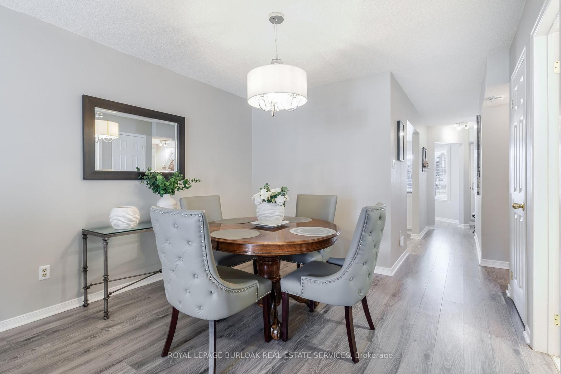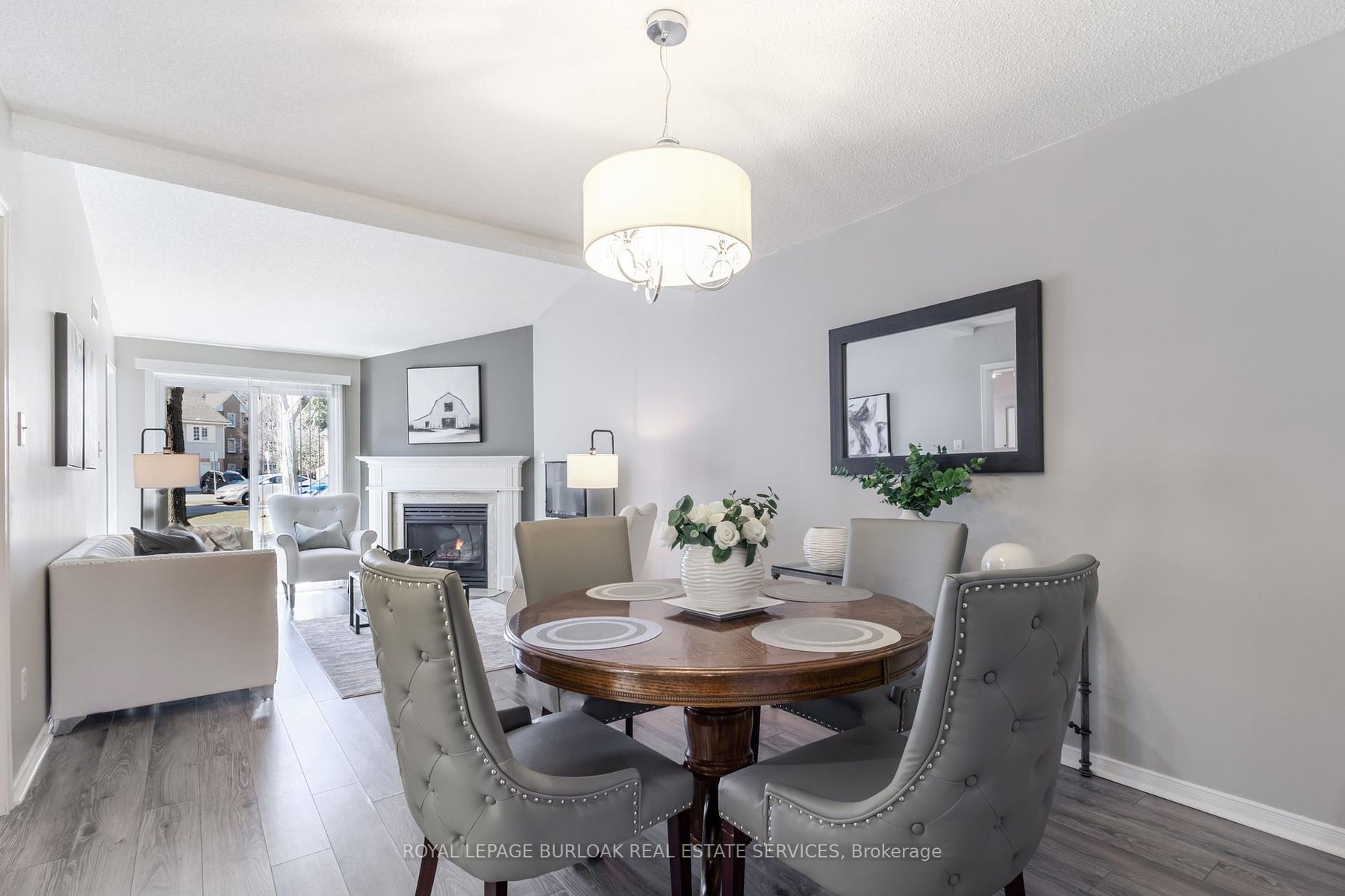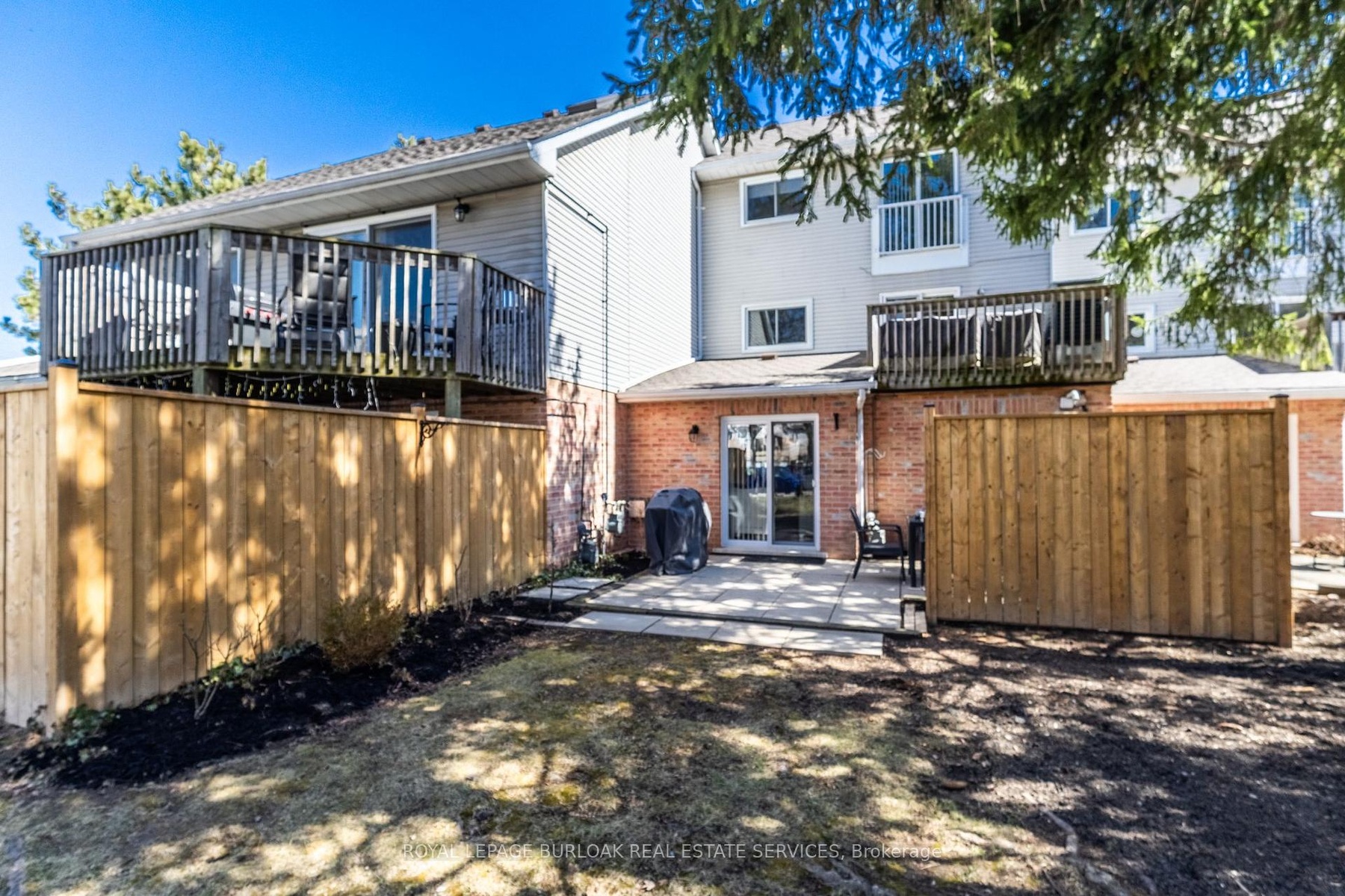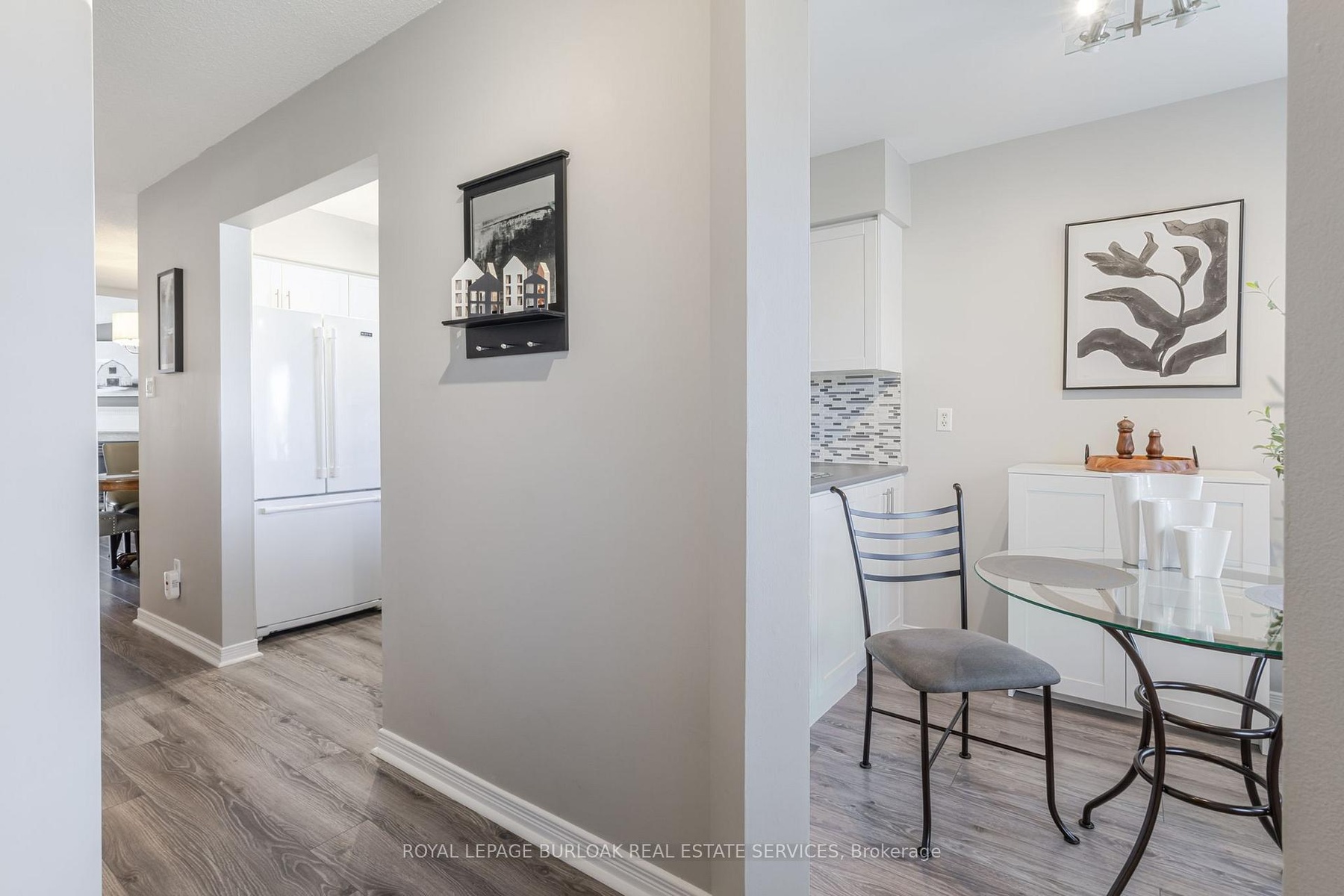Sharp Renovated 2-bedroom main floor unit in a 2-Storey Stacked Condo Town Home. Absolutely Move-in Ready Condo with a stunning Garden Terrace. These popular well-managed homes are located in Burlington's Sought-After Headon Forest neighbourhood. Very Bright and Modern, Open Concept Design offering 898 s. f. Professionally Painted in Designer Tones and Carpet Free. The welcoming foyer is adjacent to the bright, recent eat-in kitchen offering numerous cabinets, generous counter space & a spacious dinette area. A comfy seating could be placed in front of the large windows in the sunroom for a perfect people watching set up. Steps from here is the Living-Dining Room well-suited for evenings relaxing at home and for family / friend gatherings in front of the cozy gas fireplace. The convenience of a direct step out to the large and private garden retreat to enjoy a BBQ and summer evenings in nature and quiet tranquility is a bonus. The Primary Bedroom is sizeable with a large closet and overlooks the gardens &terrace. Bedroom 2 is good-sized. This room can also be used as a handy home office or hobby room. Nicely tucked away you will find the 4-piece bathroom and a laundry/utility closet. Renovations/Upgrades Include: Kitchen with beautiful white cabinetry - Ensuite bath: 2023 Stunning, low maintenance tile flooring & shower walls Pot lighting Vanity for storage. Newer laminate flooring in most rooms. Gas furnace & Air Conditioning Unit: 2017. Electric Water Heater: 2017. The complex features great visitor parking. Close to Services: Shopping, Parks and Commuter Routes. Great Value and a Pleasure to View Schedule a viewing today