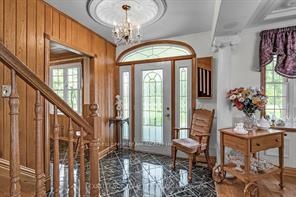 DescriptionThis 34 acres custom home can only be described as elegant. From the Gorgeous Family Room that features distinctive ceilings imported from Belgium and 3 inch Hickory Flooring. Patio doors that lead out to a covered porch, that flows into a beautiful landscaped backyard accented with a Gazebo and Stone waterfall. Great for family gatherings, or weddings. The Gourmet kitchen boasting beautiful granite counter tops, lots of cupboard and stainless steel appliances. Formal Dinning room that features distinctive ceilings that were imported from Italy. This home features 4 bedroom, 4 bathroom. Master Bedroom has ensuite bathroom and walkout balcony. Lower level features a kitchen, bathroom and laundry room that could be used as an in-law suite or office space. Newly refurbished Barn all set up for horses complete with 4 box stall, corral, pasture, hay field, storage space. A wood area complete with trails for nature walks, hunting or 4 wheeling. No power no problem with 10,000 Watt Generac. Flooring: Vinyl, Hardwood, Ceramic.Amenities- Air Exchanger