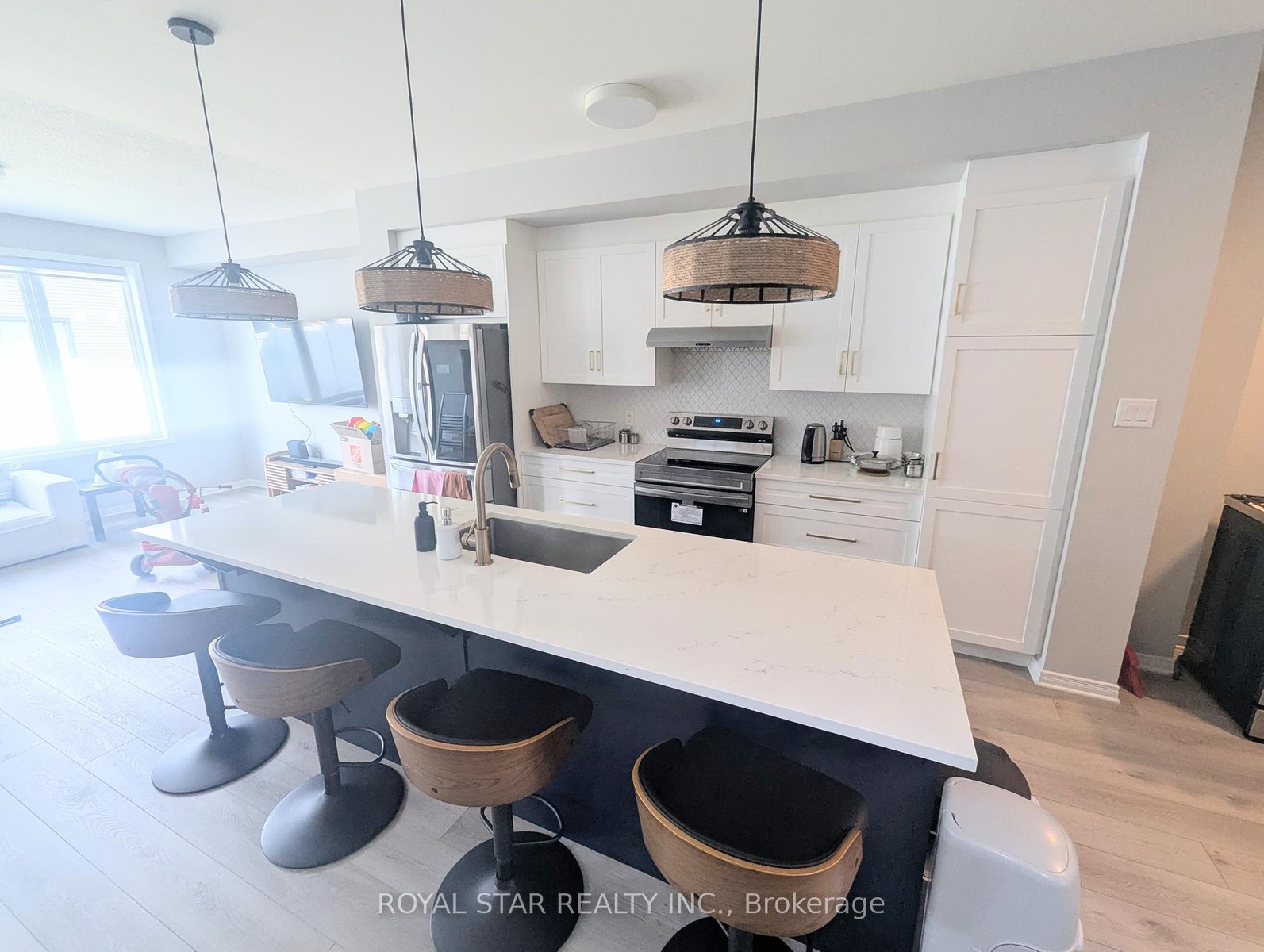 Welcome to this stunning end-unit townhouse offering 3 spacious bedrooms plus a loft, 3 bathrooms and a fully finished basement in prime area of Blackstone in Stittsville. The open-concept main floor is filled with natural light and features a bright living room, dining area and a versatile nook. The modern kitchen boasts quartz countertops, a large island, sleek white cabinetry with tile backsplash and stainless steel appliances. Upstairs, you will find 3 generous bedrooms and a sun-filled loft. The primary suite includes a large walk-in closet and a luxurious 5-piece ensuite with quartz counters, dual sinks, a soaker tub and a separate standing shower. A second full bathroom with quartz countertops and a convenient laundry room complete this level. The finished basement provides plenty of space for recreation and storage. Outside, enjoy the extended interlocked driveway and a fully fenced deep backyard with interlock and grass areas perfect for relaxing or entertaining. Ideally located close to transit, top-rated schools, Walmart and tons of other shopping options.