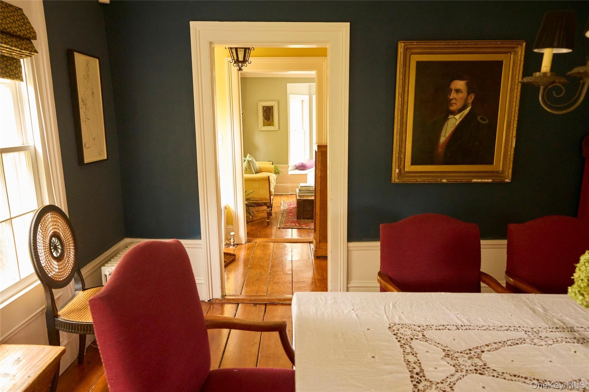 - Historic dining room with antique furnishings and natural light. Vista into the adjacent front door entry and living room.