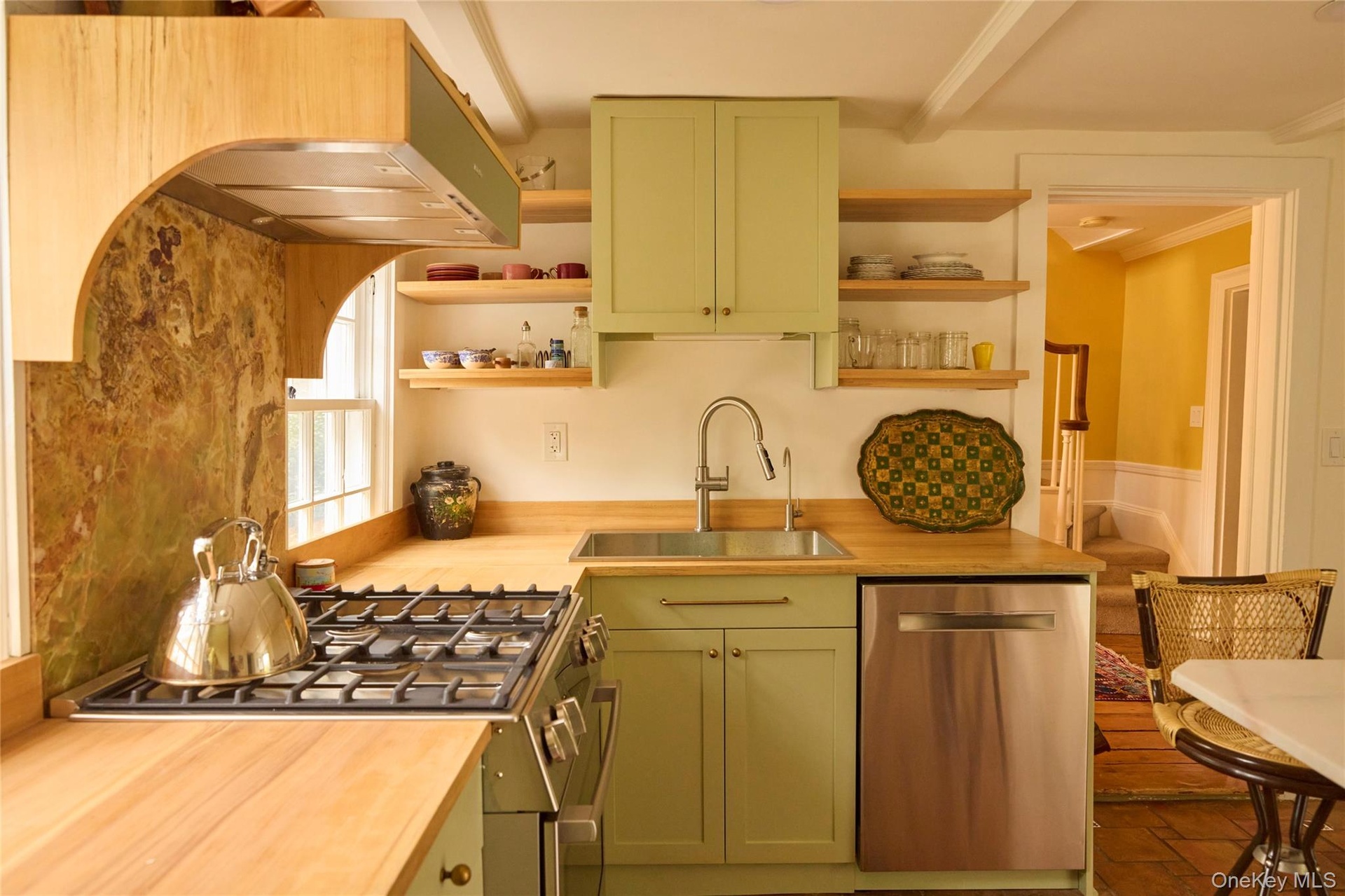 - Newly renovated kitchen, featuring custom cabinets, gas stove, breakfast table, and natural light.