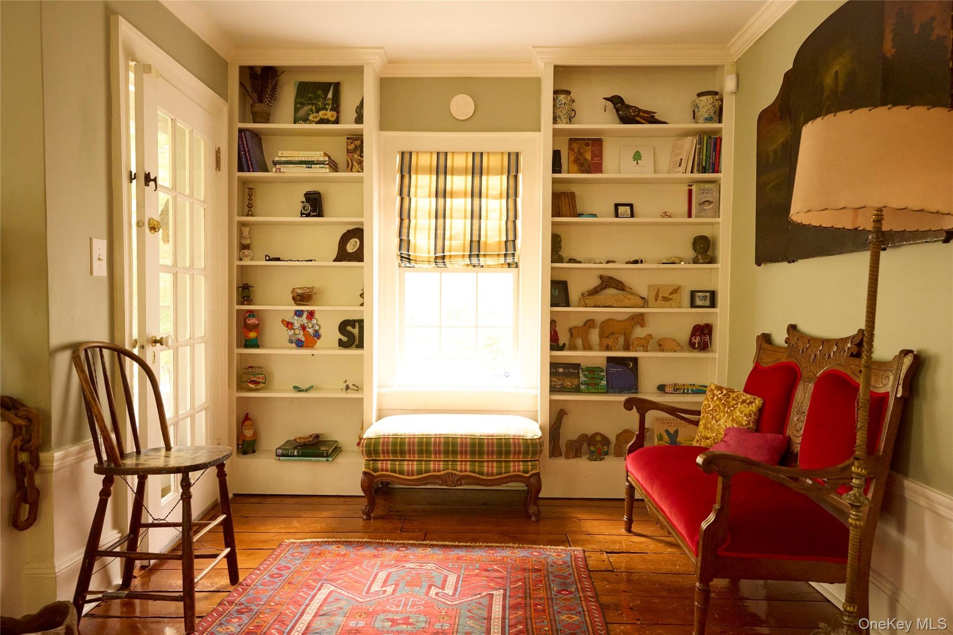 - Living room featuring antique furnishings, wood burning fireplace, window seat, and library area.