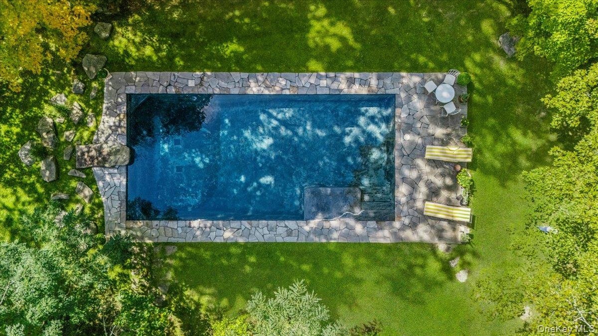 Outdoors, enjoy a majestic heated gunite saltwater pool with outdoor shower and a one-of-a-kind stone diving board quarried on site. Recent upgrades include new roofs and gutters (2014), updated HVAC, new water heater, and a whole-house generator. The property also includes several outbuildings: a large storage shed, wood shed, and garden shed. Ideally located less than five minutes from the private Sedgewood Club (membership required), offering lake access, tennis, and golf — 15 minutes from the train and just an hour from NYC.